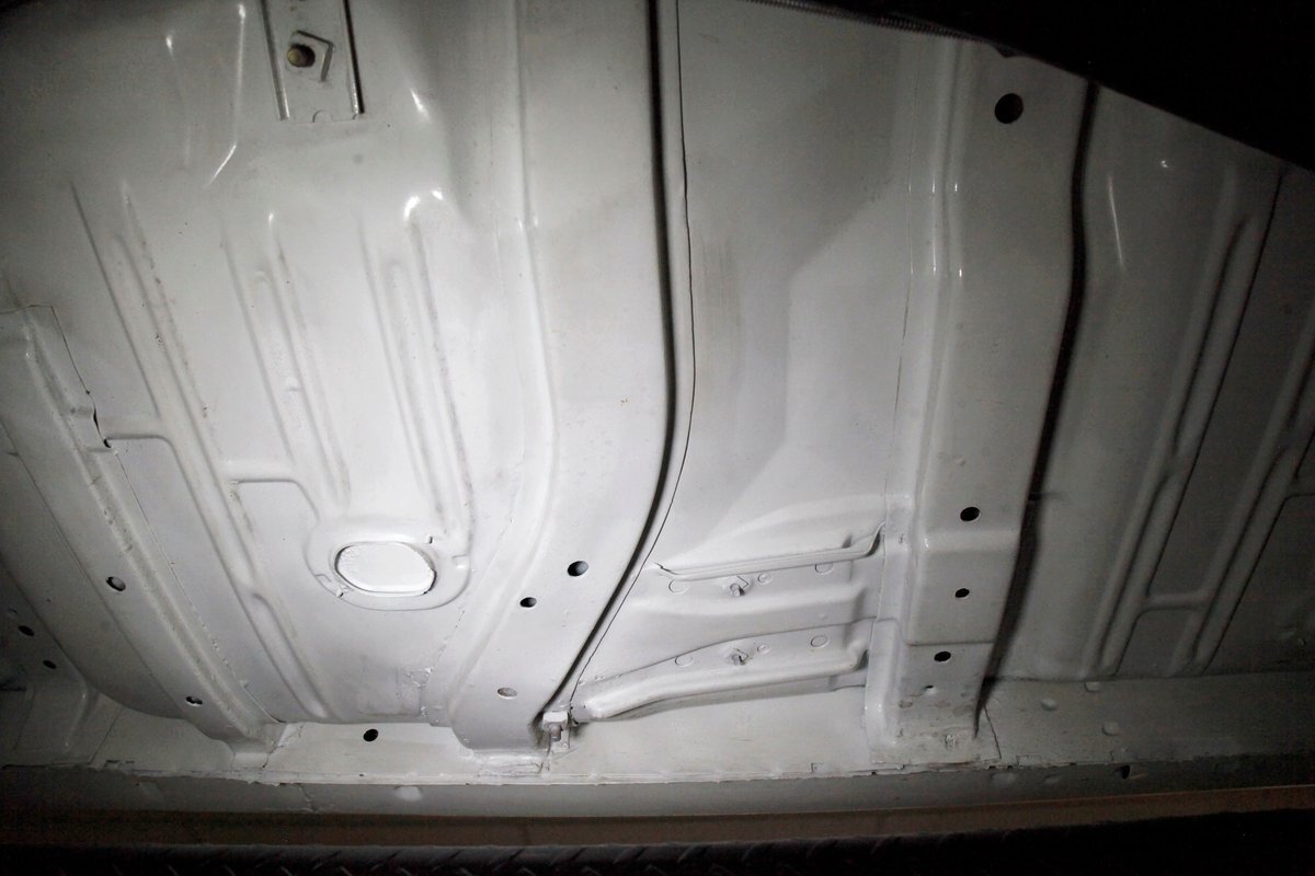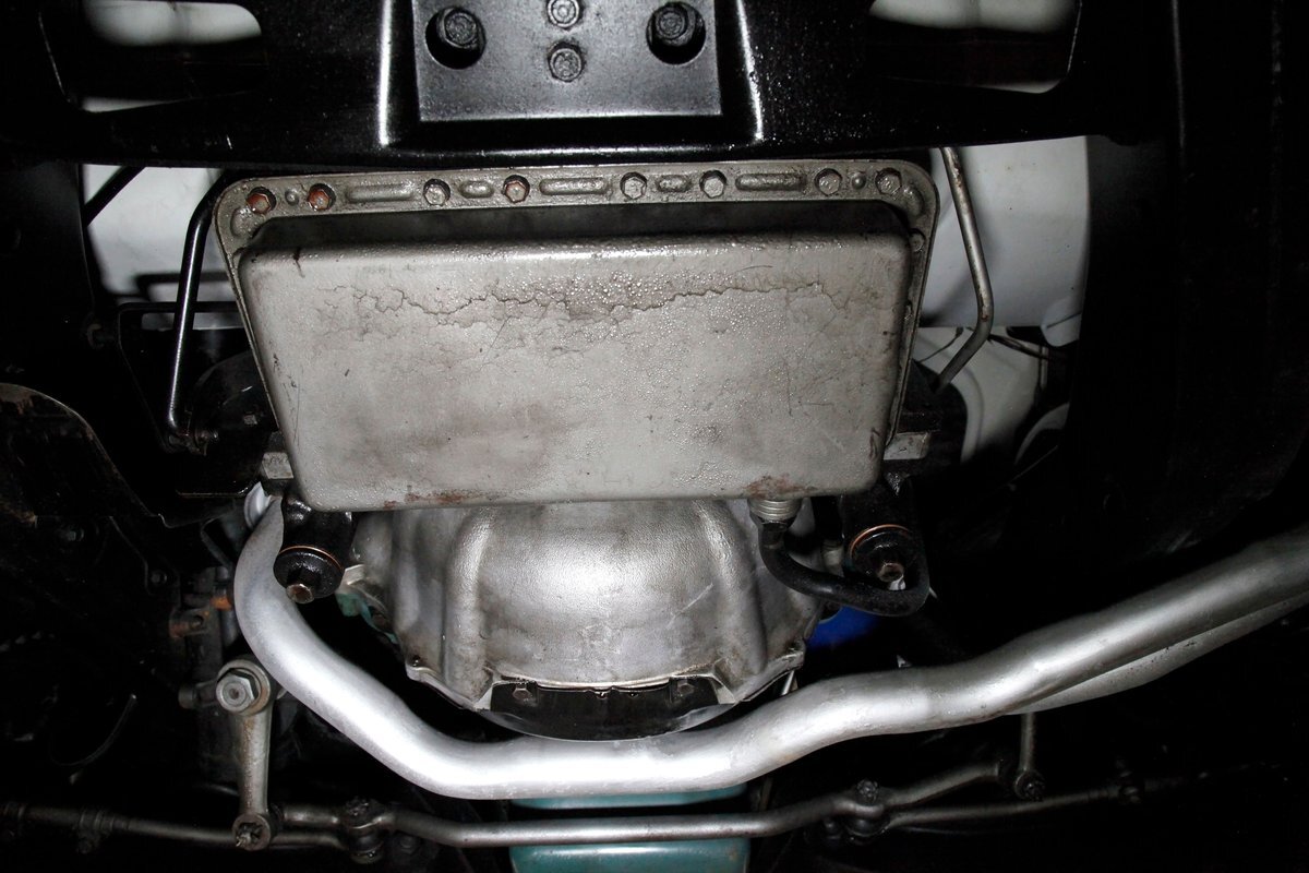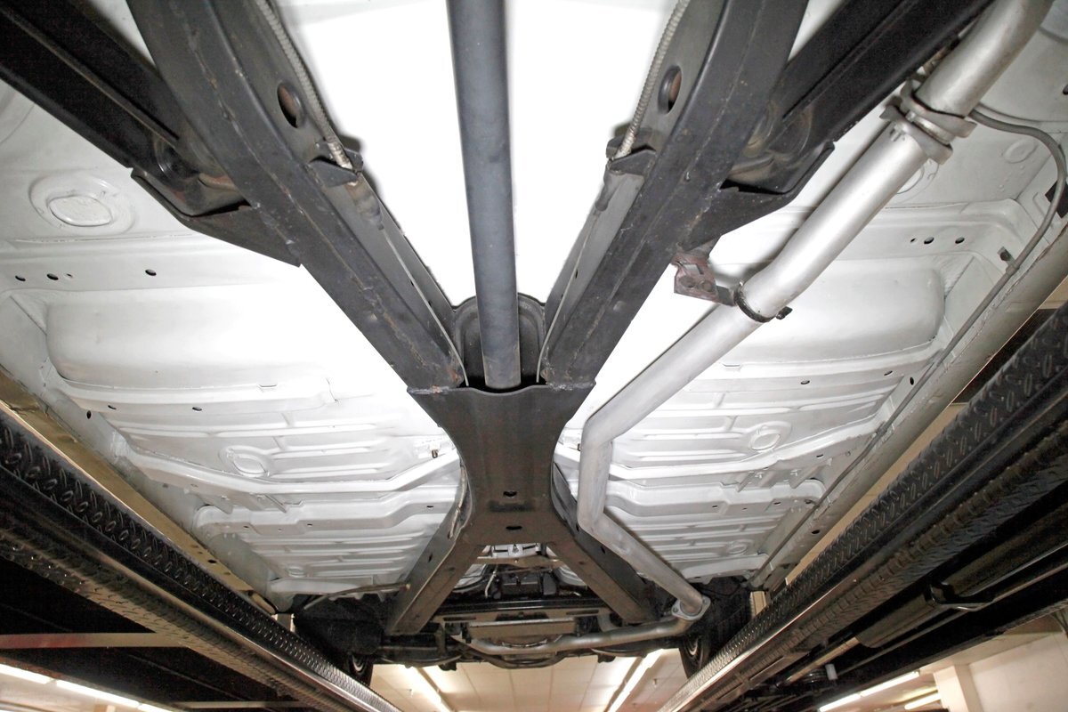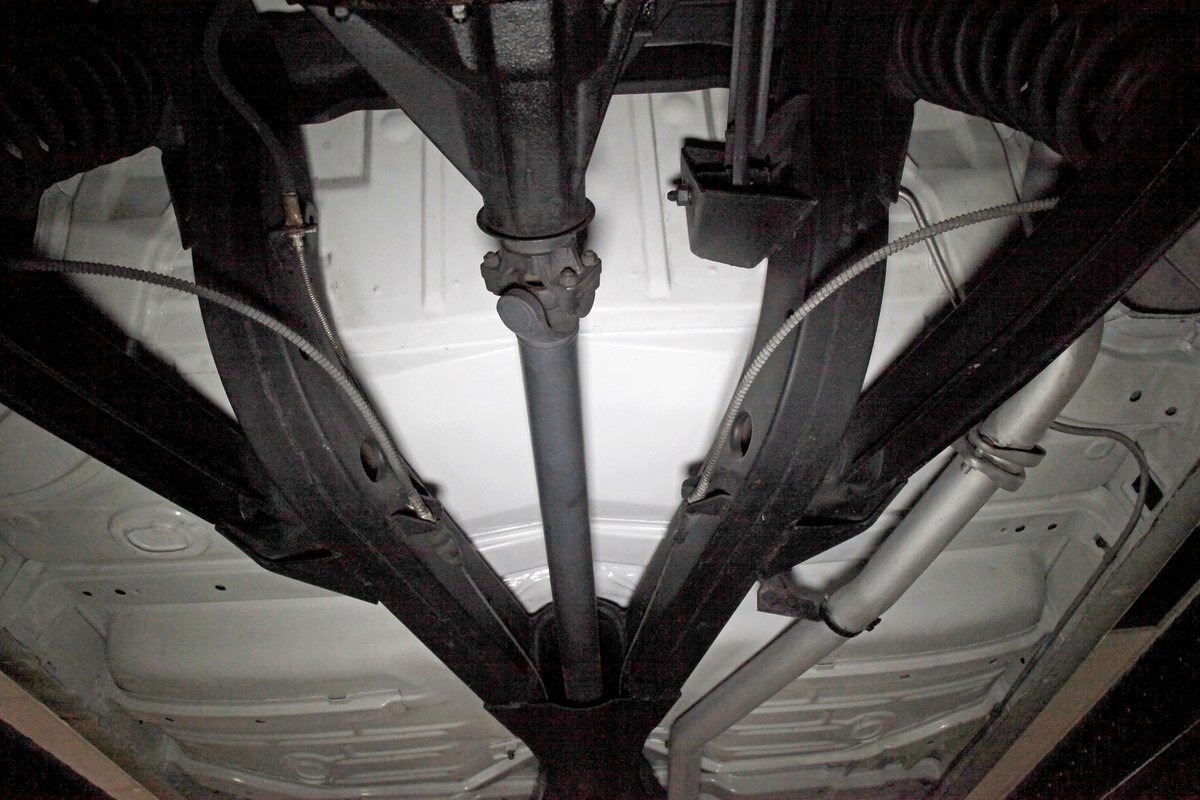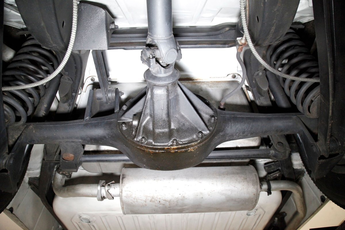 Thanks to a top notch frame off restoration there is very little to no surface rust underneath, just miles of white flooring, black suspension and black framing. An X frame holds it all together, and for the suspension I see front independent coil springs and on the back a 4 link with coil springs. Power drum braking is on all 4 corners, and a like new single piped stock exhaust is on the car. Break out the mirrors...it's showtime!