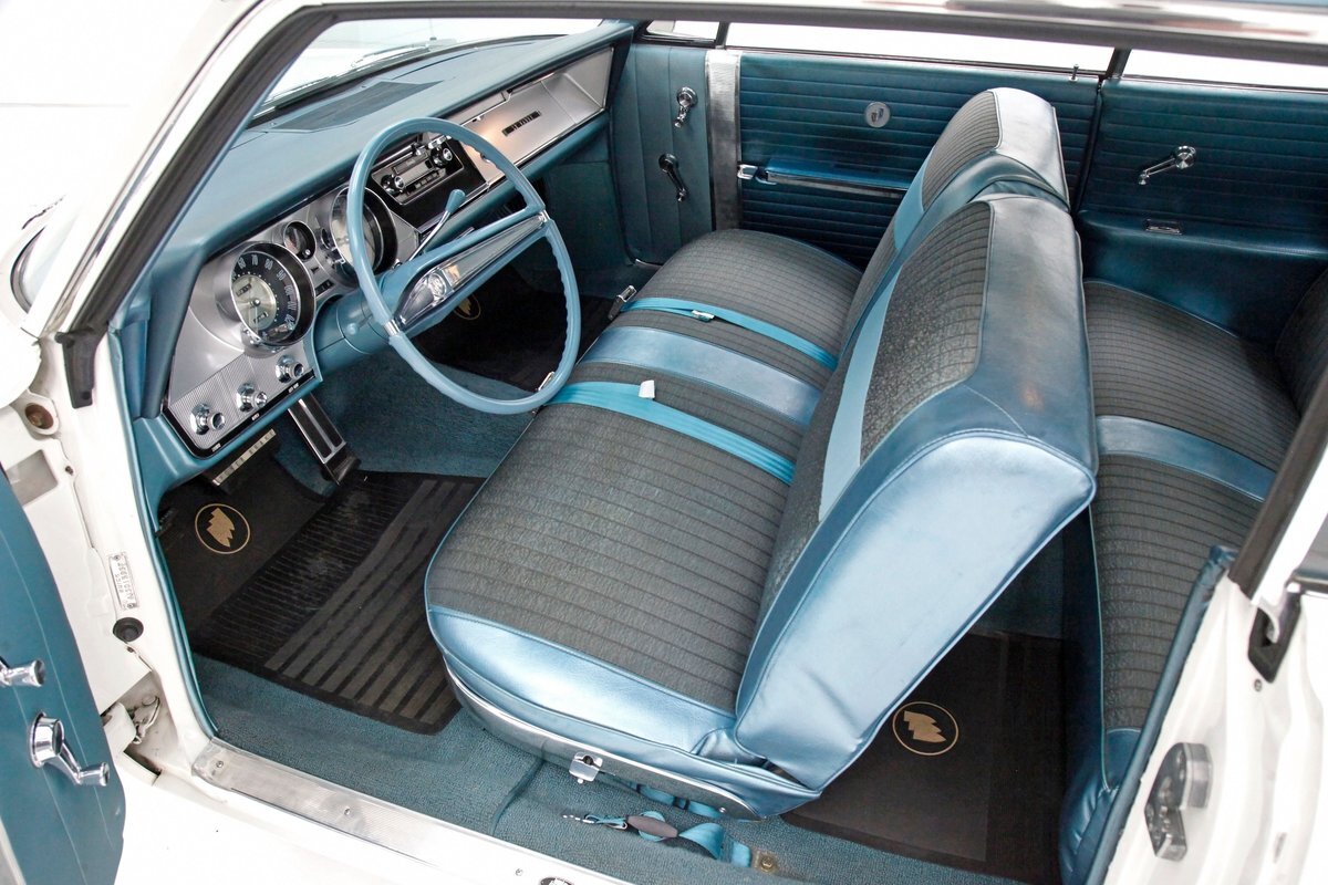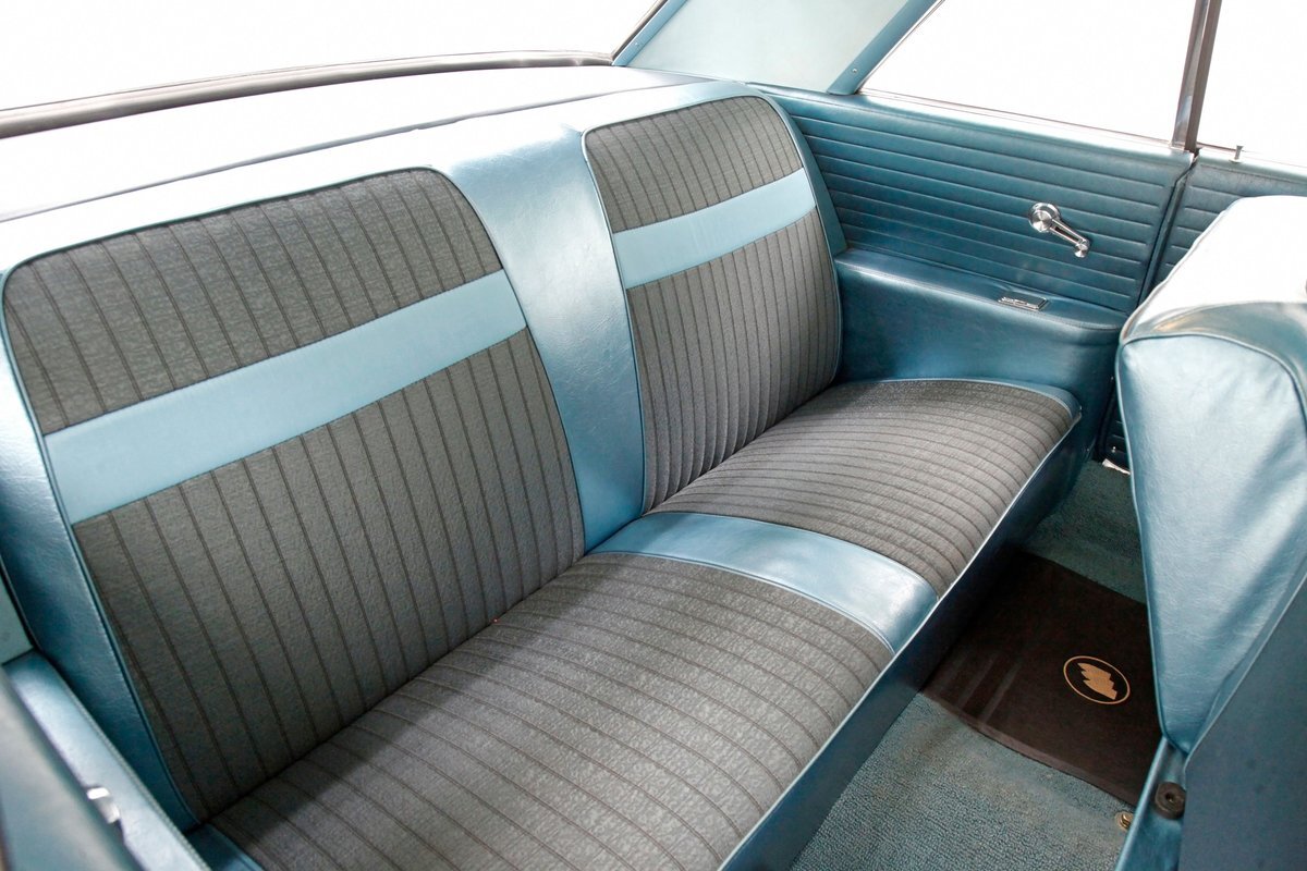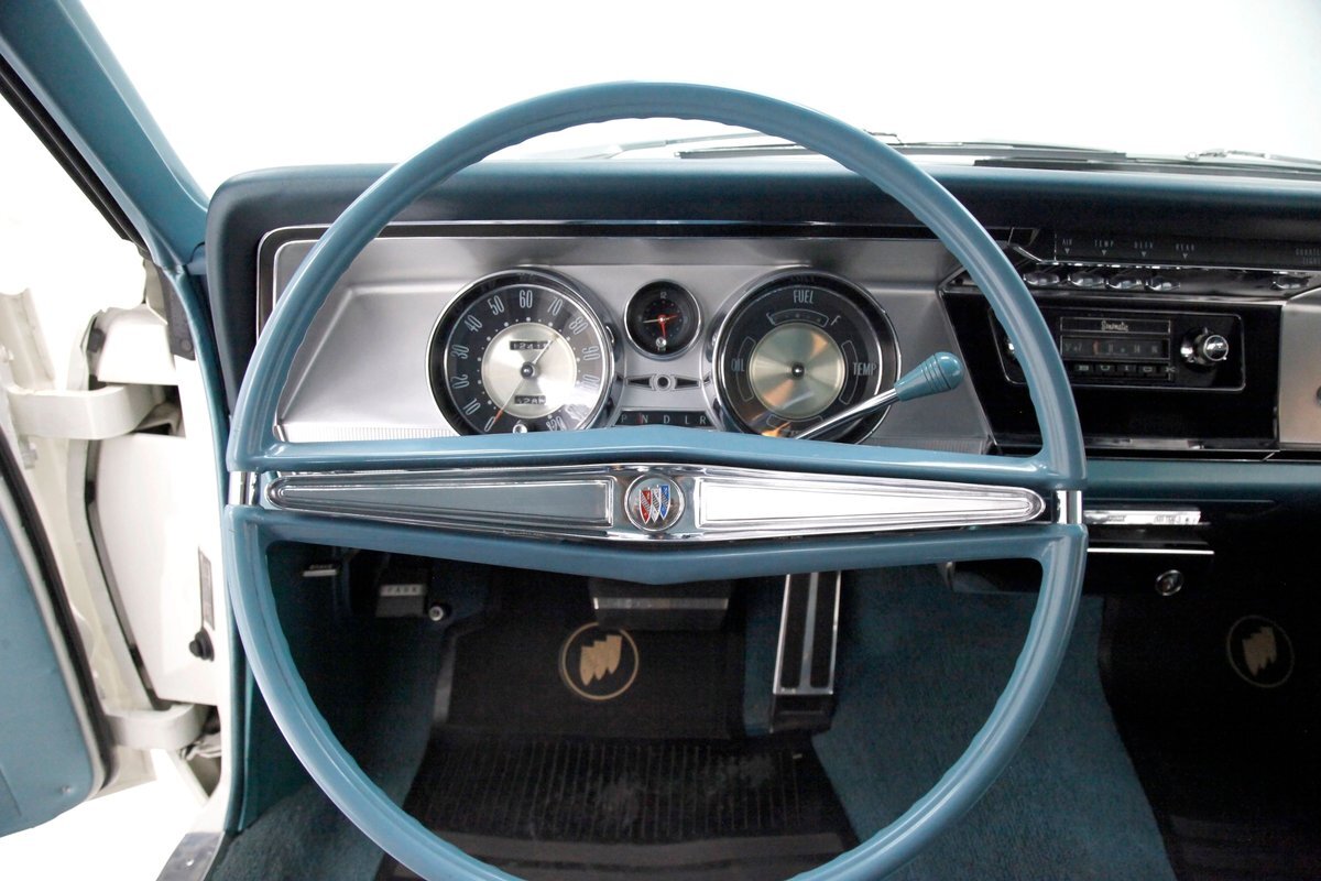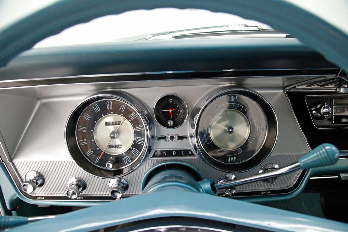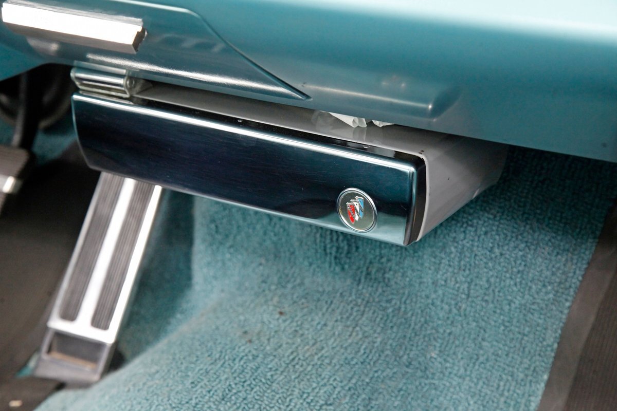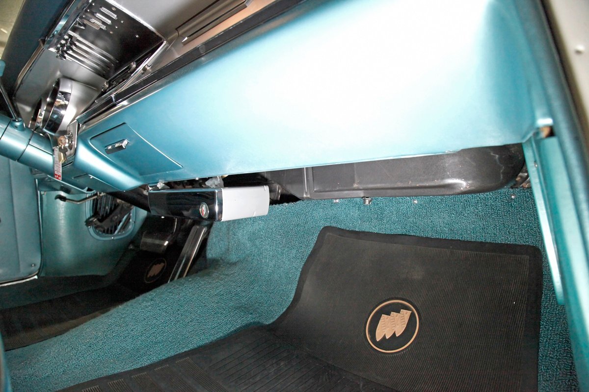 Clean and possibly original aqua vinyl mixes with some aluminum trim in the center of the doors, and sports horizontal stitched ribs with the Buick tri-shield hovering above the aqua and chrome armrests. These panels are near spotlessly clean and the brightwork and chrome remains factory fresh. The 2 bench seats, split back in the front, within the passenger compartment are covered with tuck and roll charcoal black damask broadcloth inserts and have shiny aqua smooth bolsters and piping on their edges. To keep the tasteful going, the dash is also aqua with a center of ribbed aluminum sandwiched between the padded topper and aqua steel lower and has a geometric shape to house the black faced gauges which are round and have a smaller round clock in their center. Various knobs and pulls line up below and then the dash turns to black in the center where the original AM radio is housed. Just above under the dash top are the climate sliders, and then the dash turns back to silver for the passenger glovebox and courtesy light. The dash top is padded aqua vinyl with no cracks or errors. Aqua carpeting, very clean and protected by black rubber Buick shied mats on the floors and an aqua broadcloth headliner is tight as a drum above. Due to the color combo this car tickles my tasteful senses while giving an overall feel of calmness to my person.