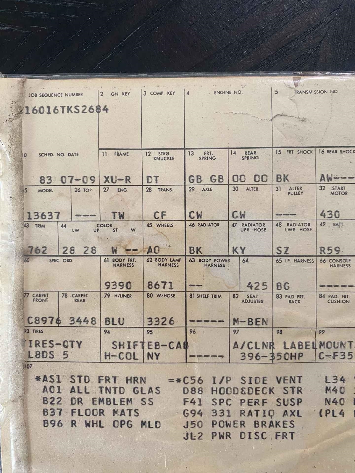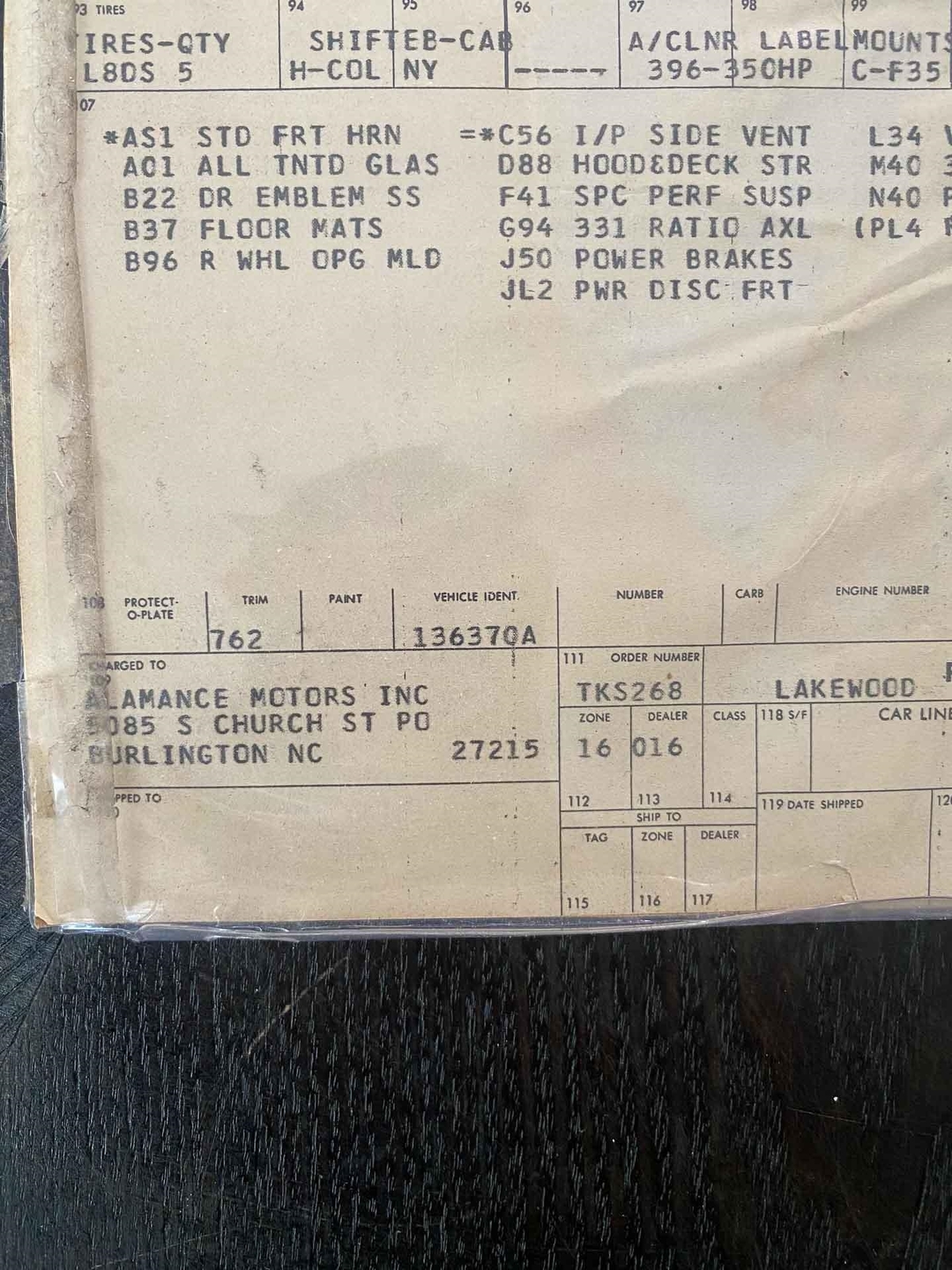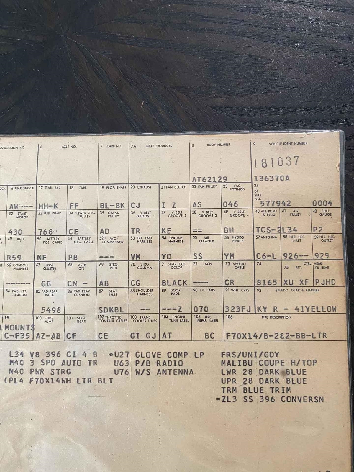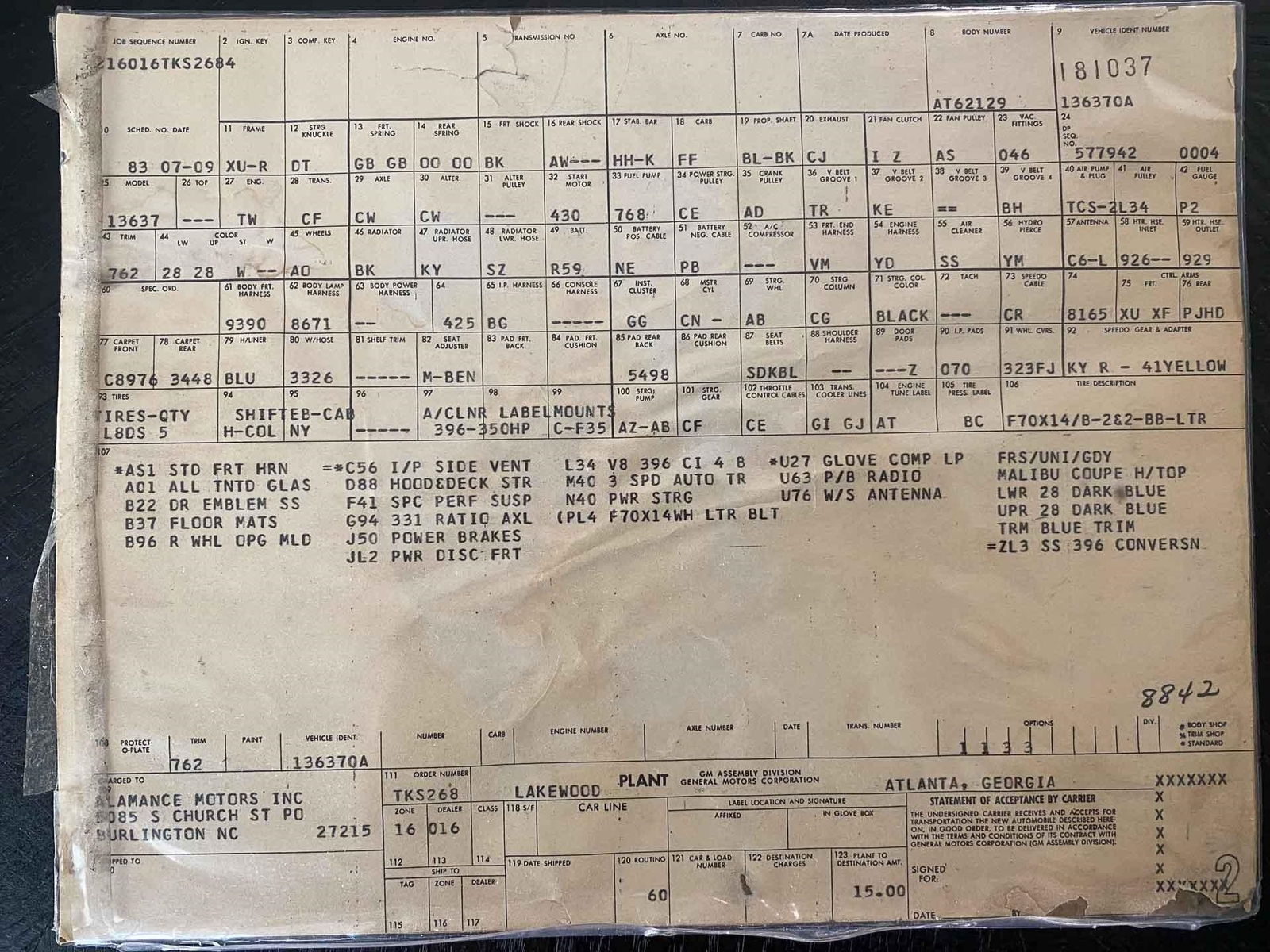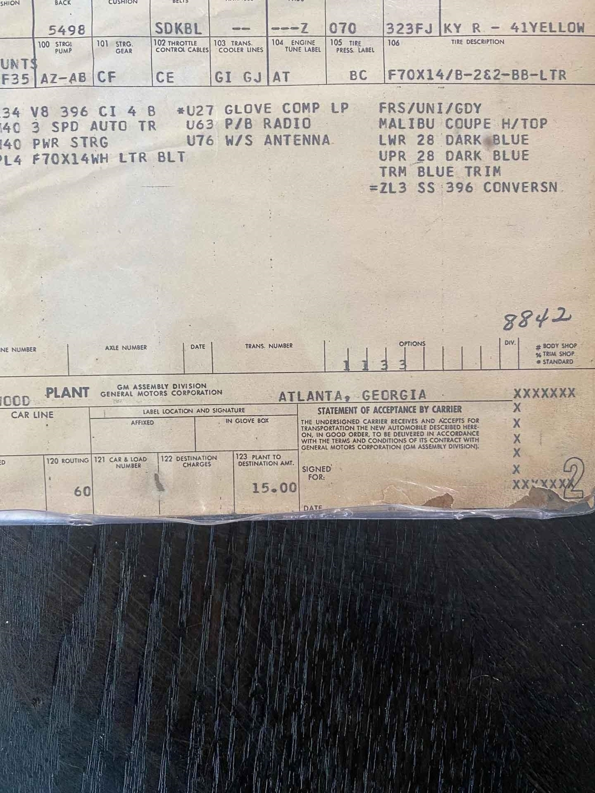 1970 Chevrolet Chevelle SS Build Sheet Fathom Blue