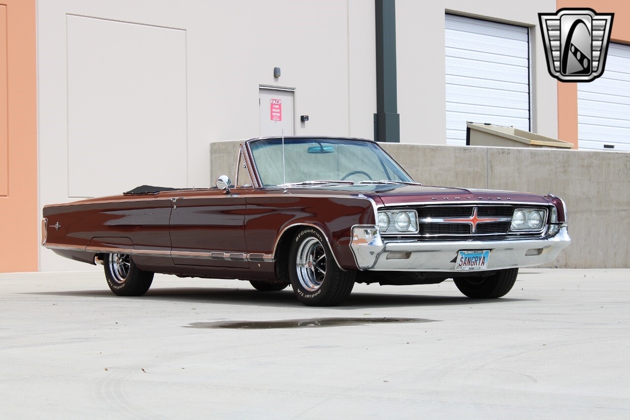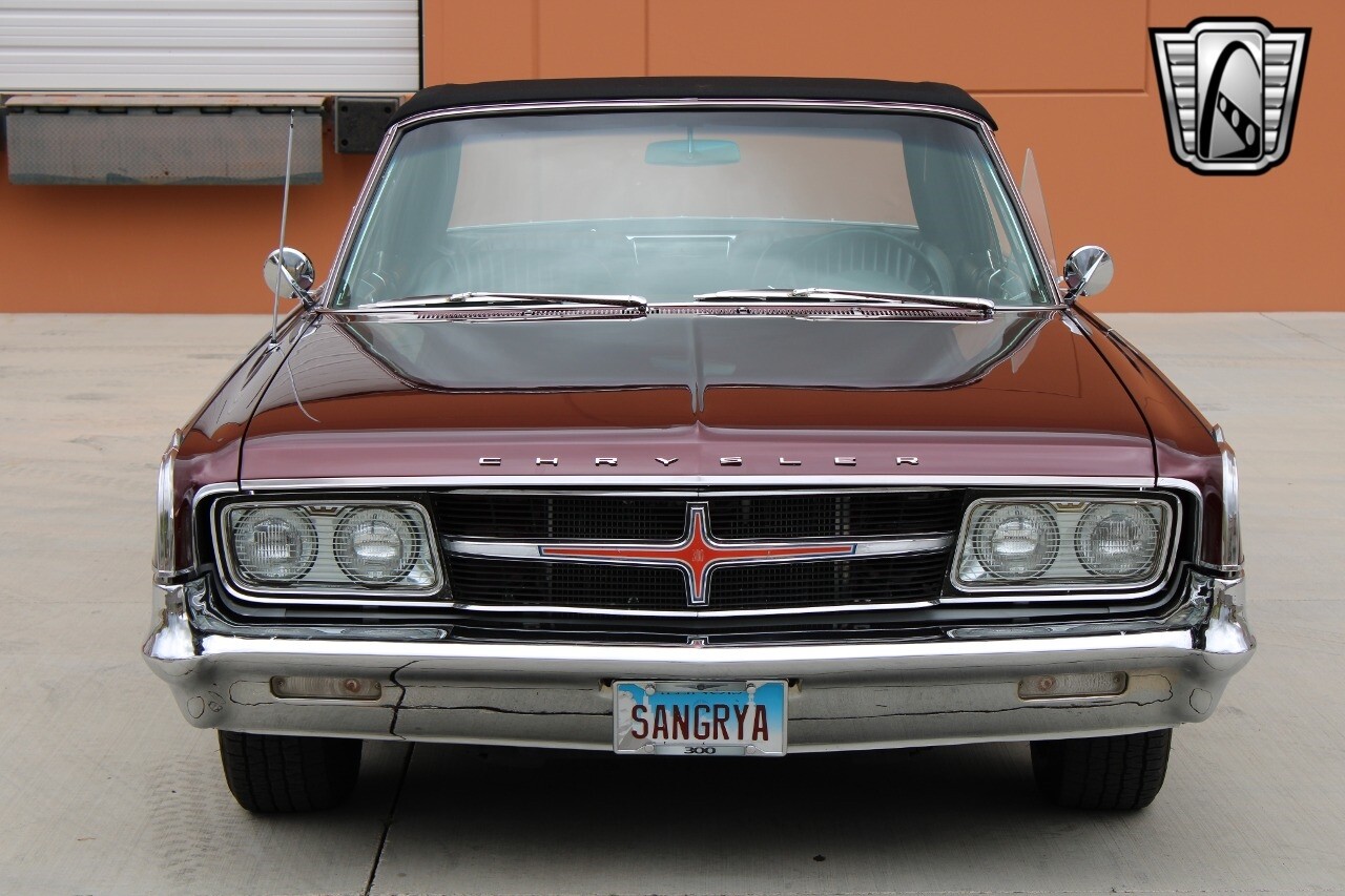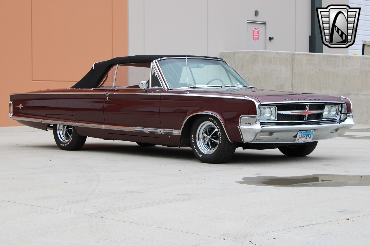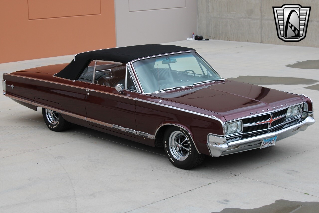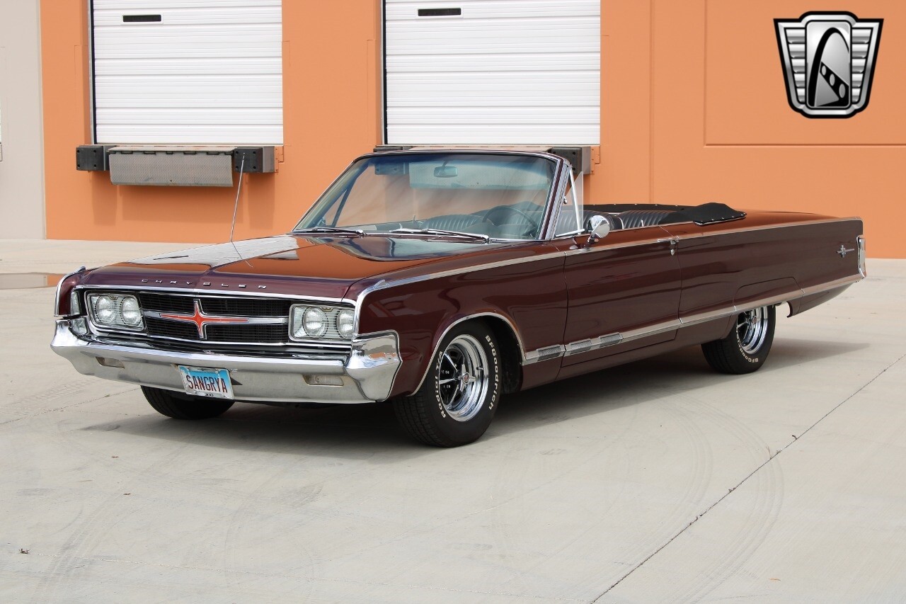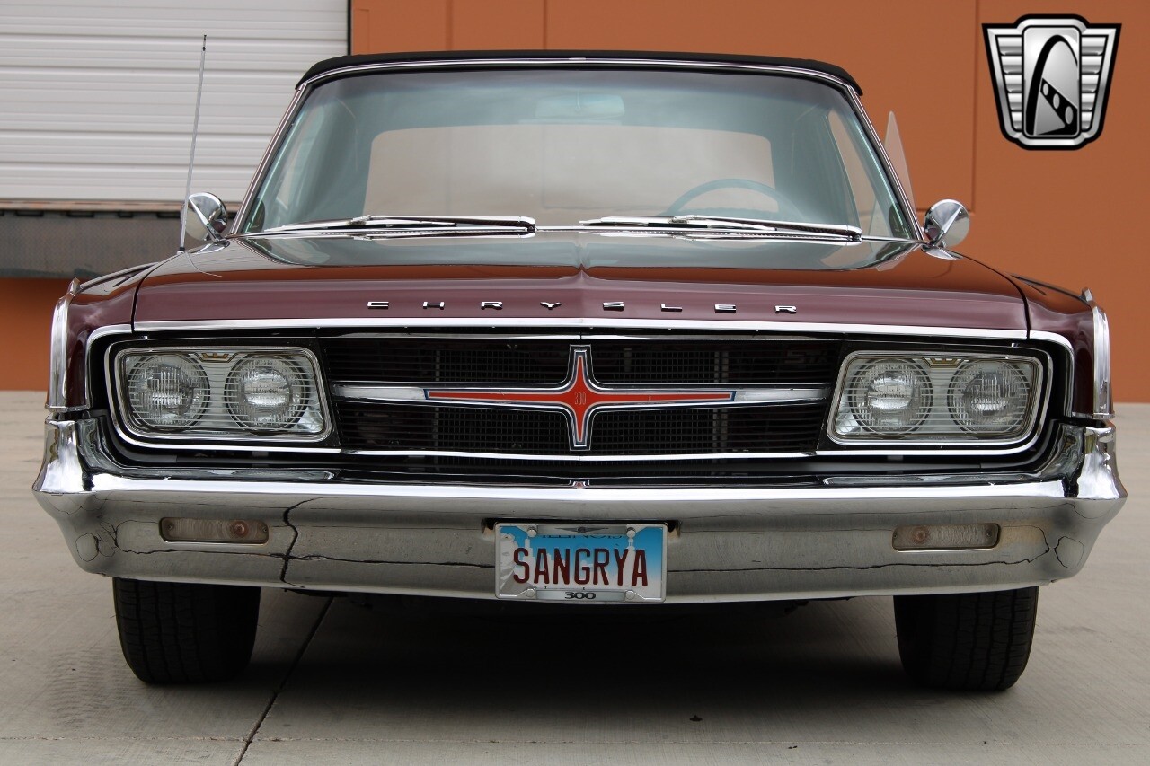 Introducing the 1965 Chrysler 300 Convertible, a classic beauty that exudes timeless elegance and power. This vehicle is a standout with its rich burgundy wine exterior color, a hue that is both sophisticated and eye-catching. The black leather interior adds a touch of luxury and comfort, creating an inviting atmosphere for both driver and passengers.