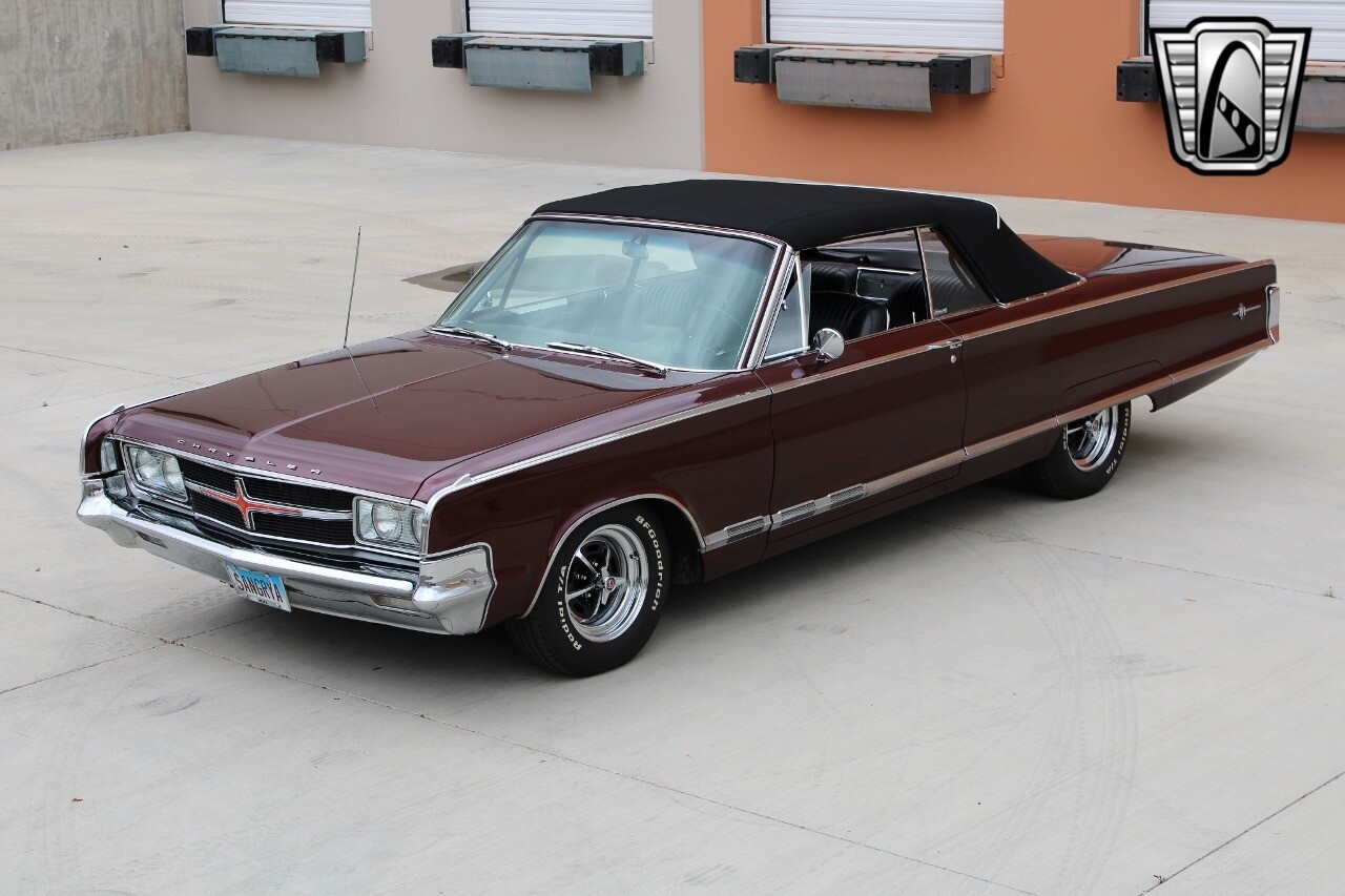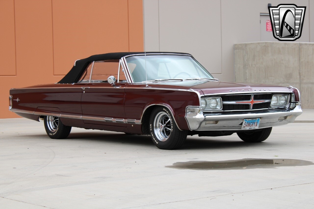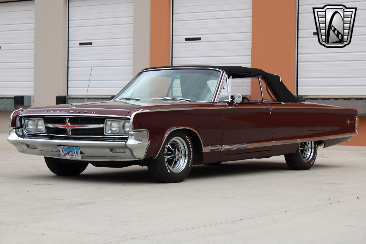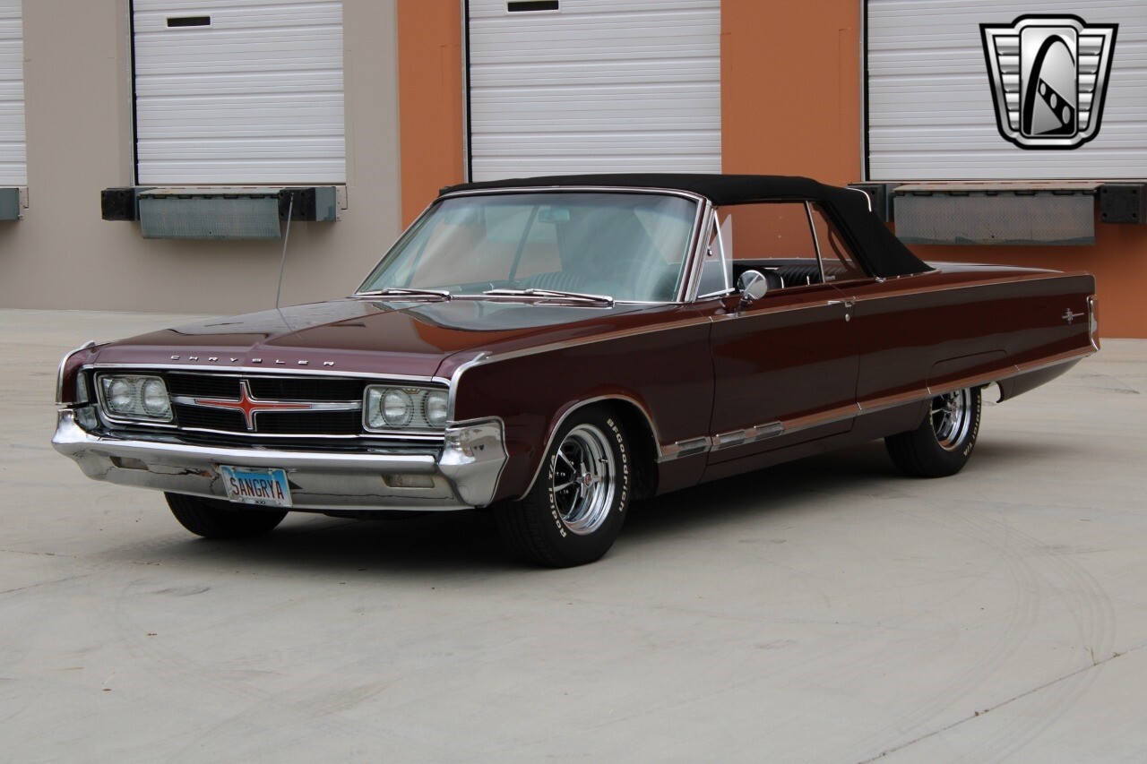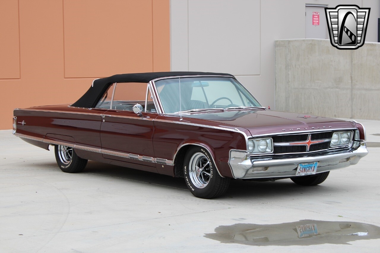 Introducing the 1965 Chrysler 300 Convertible, a classic beauty that exudes timeless elegance and power. This vehicle is a standout with its rich burgundy wine exterior color, a hue that is both sophisticated and eye-catching. The black leather interior adds a touch of luxury and comfort, creating an inviting atmosphere for both driver and passengers.