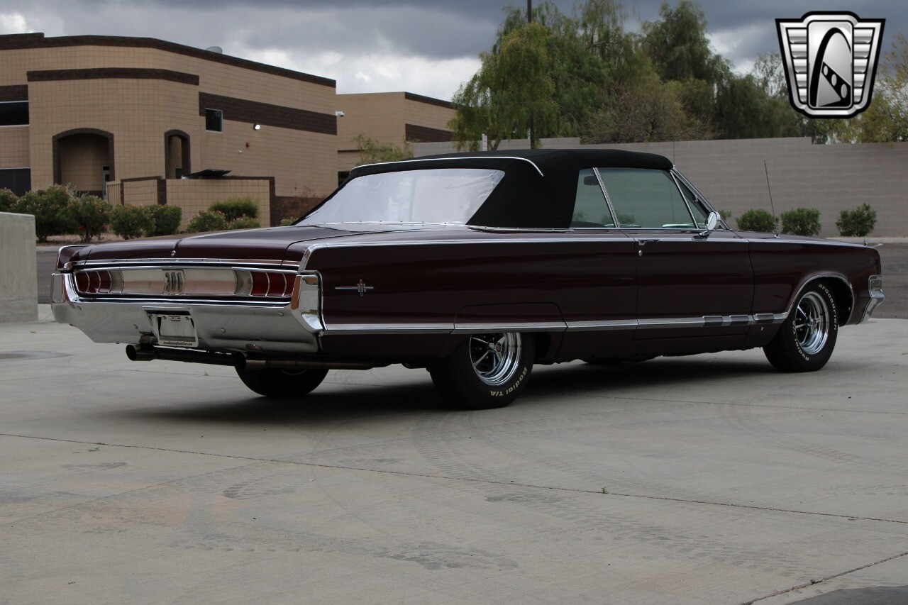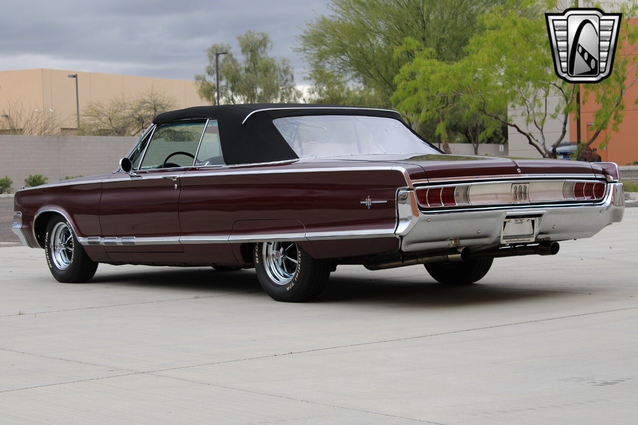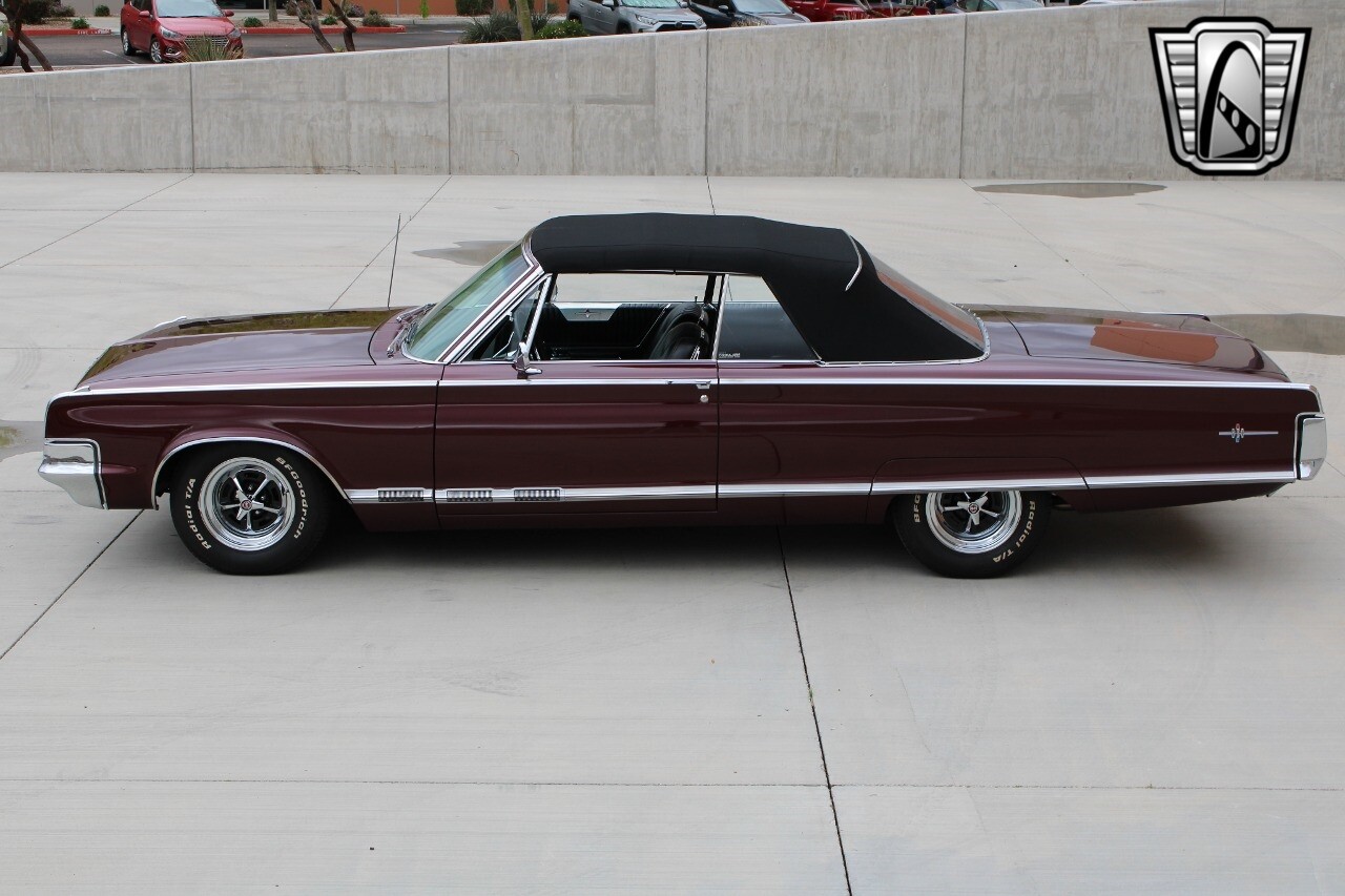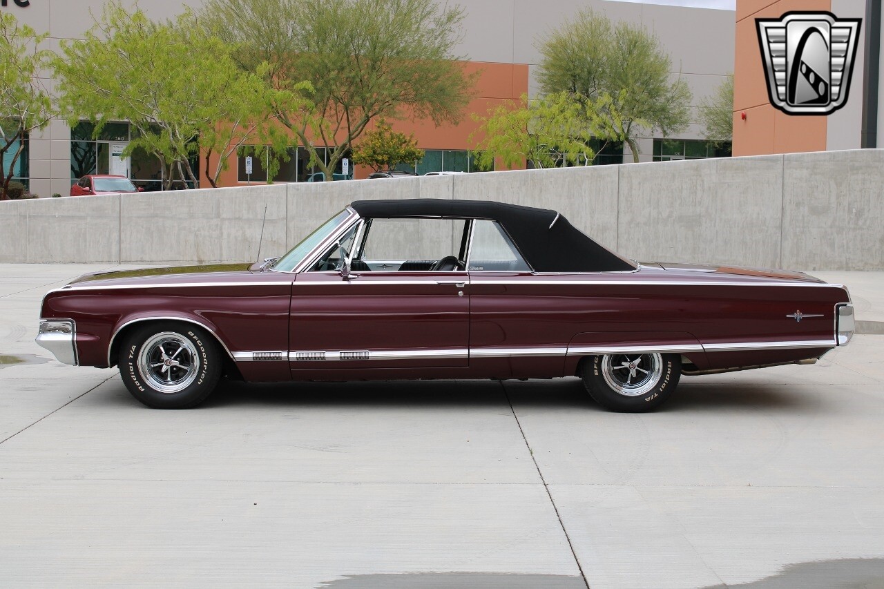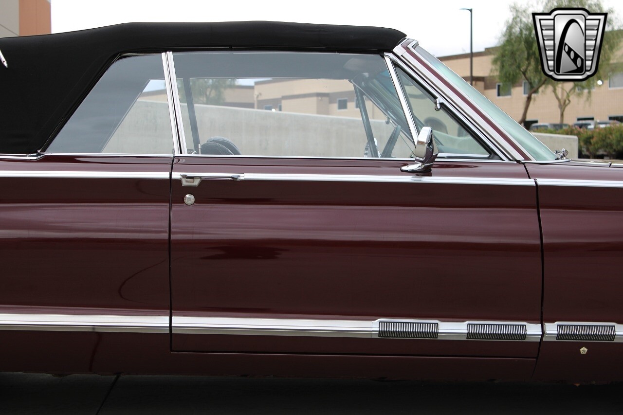 Introducing the 1965 Chrysler 300 Convertible, a classic beauty that exudes timeless elegance and power. This vehicle is a standout with its rich burgundy wine exterior color, a hue that is both sophisticated and eye-catching. The black leather interior adds a touch of luxury and comfort, creating an inviting atmosphere for both driver and passengers.