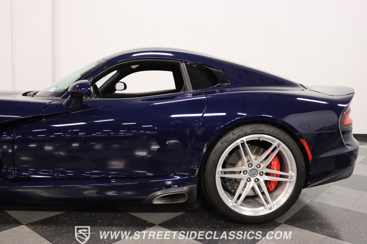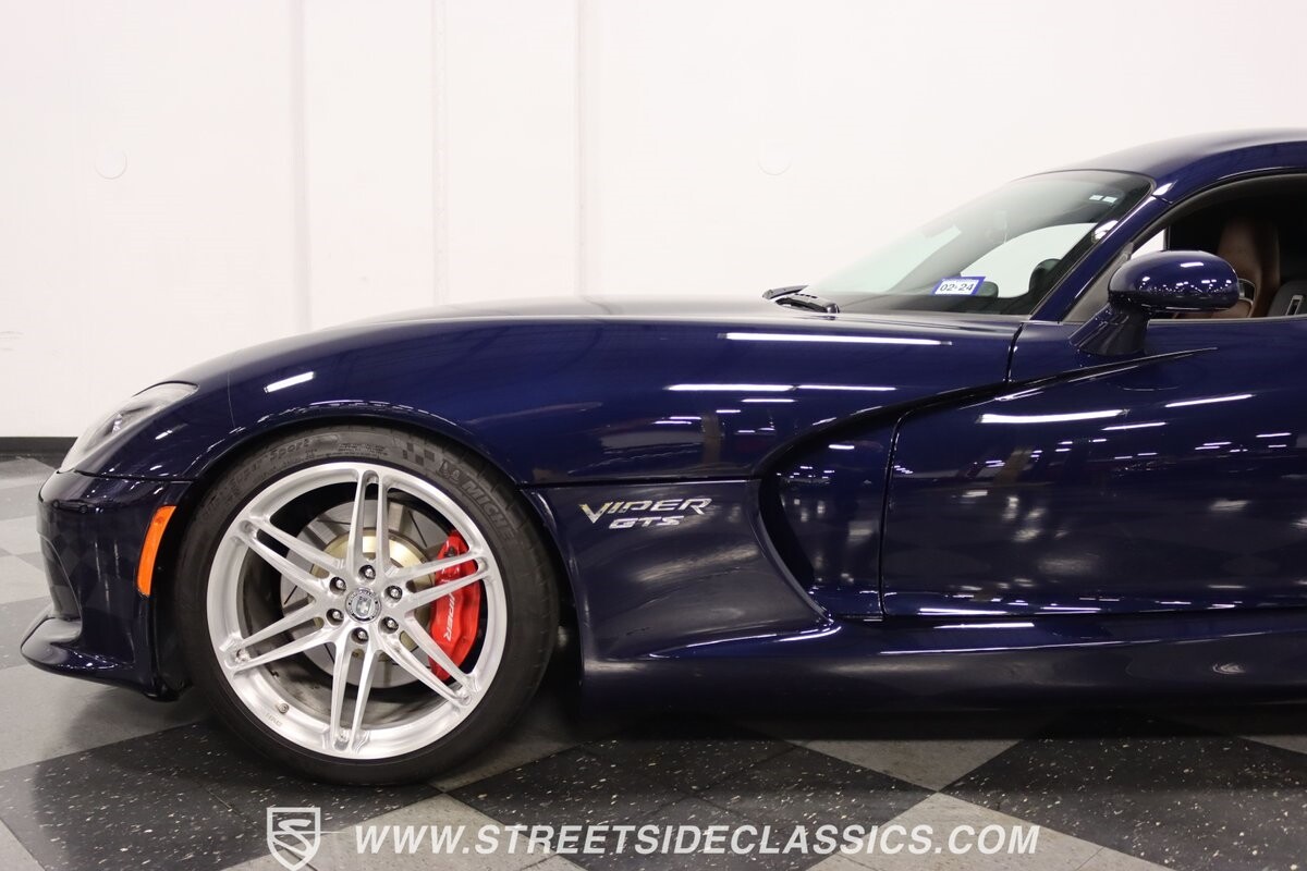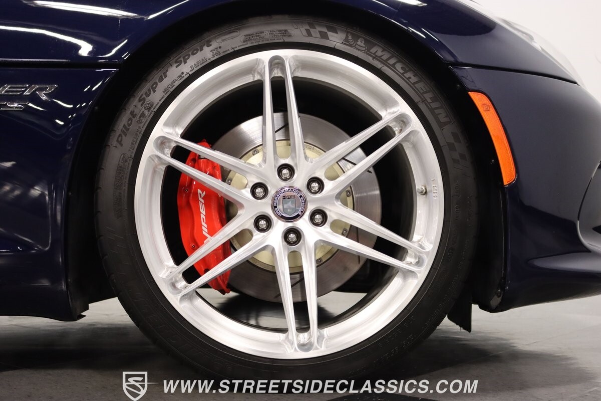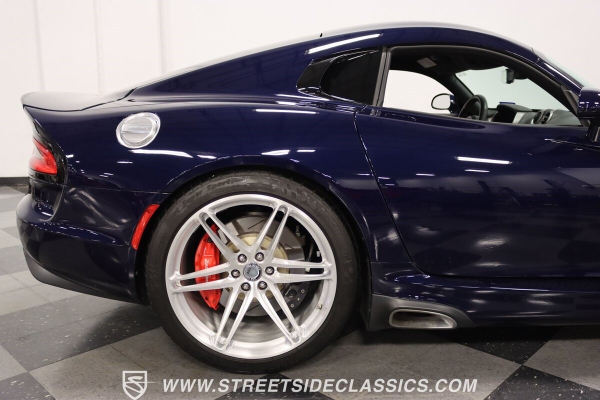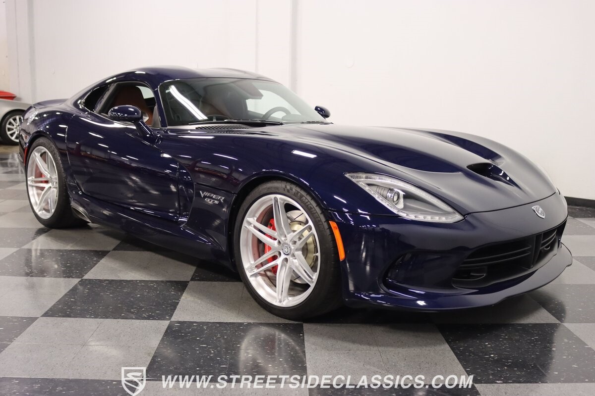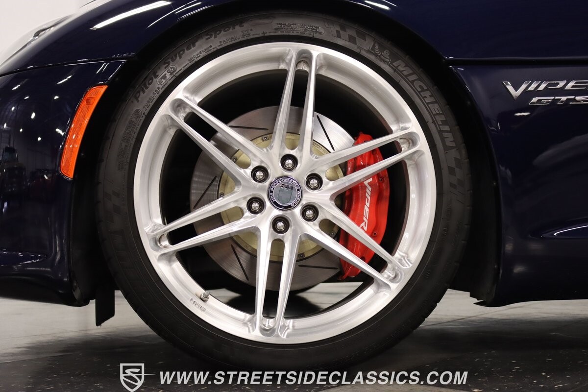 The Viper has always been a supercar, but the final generation was absolutely the best. It's a modern machine that really shows some Italian influence in the sleek design. In fact, the factory Blue Pearl paint is a terrific color that has a dark look but a glossy flair that reminds us of an Armani suit. It's the kind of look you get on a well-optioned car that has only averaged around 1200 miles annually. But this high-style appearance did not mean this Viper lost its predatory attitude. You see it in the long sleek hood with deep vents for the monster underneath, and the contoured sides that help incorporate the exhaust pipes. Plus, Dodge's tradition of letting the rear spoiler on the GTS be such a sweeping and dominant force is a true hallmark piece. And we love how the upgraded HRE alloys give us an even better view of the big brakes and aggressive red calipers.