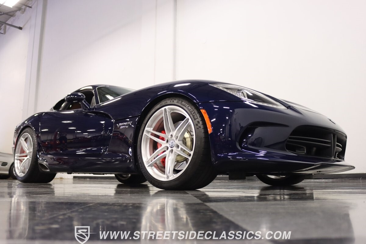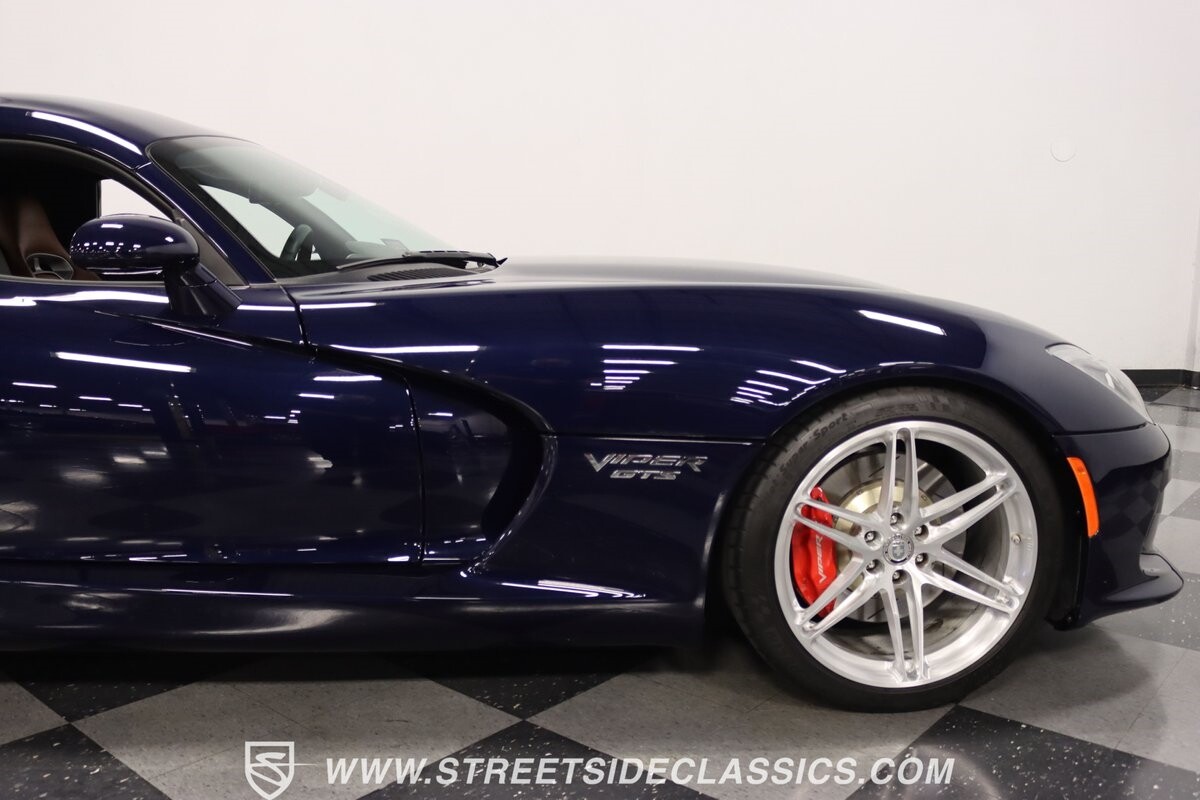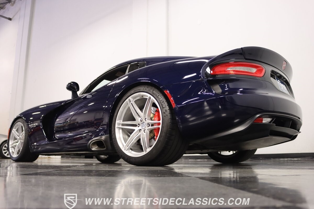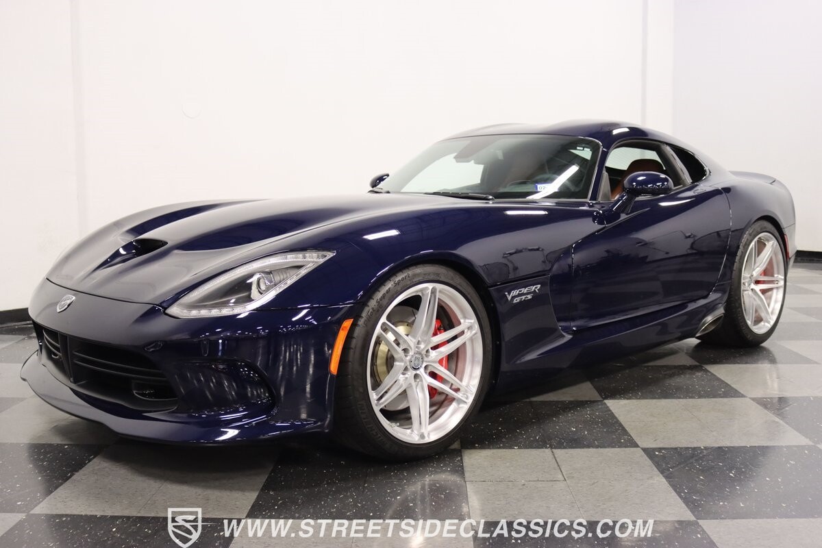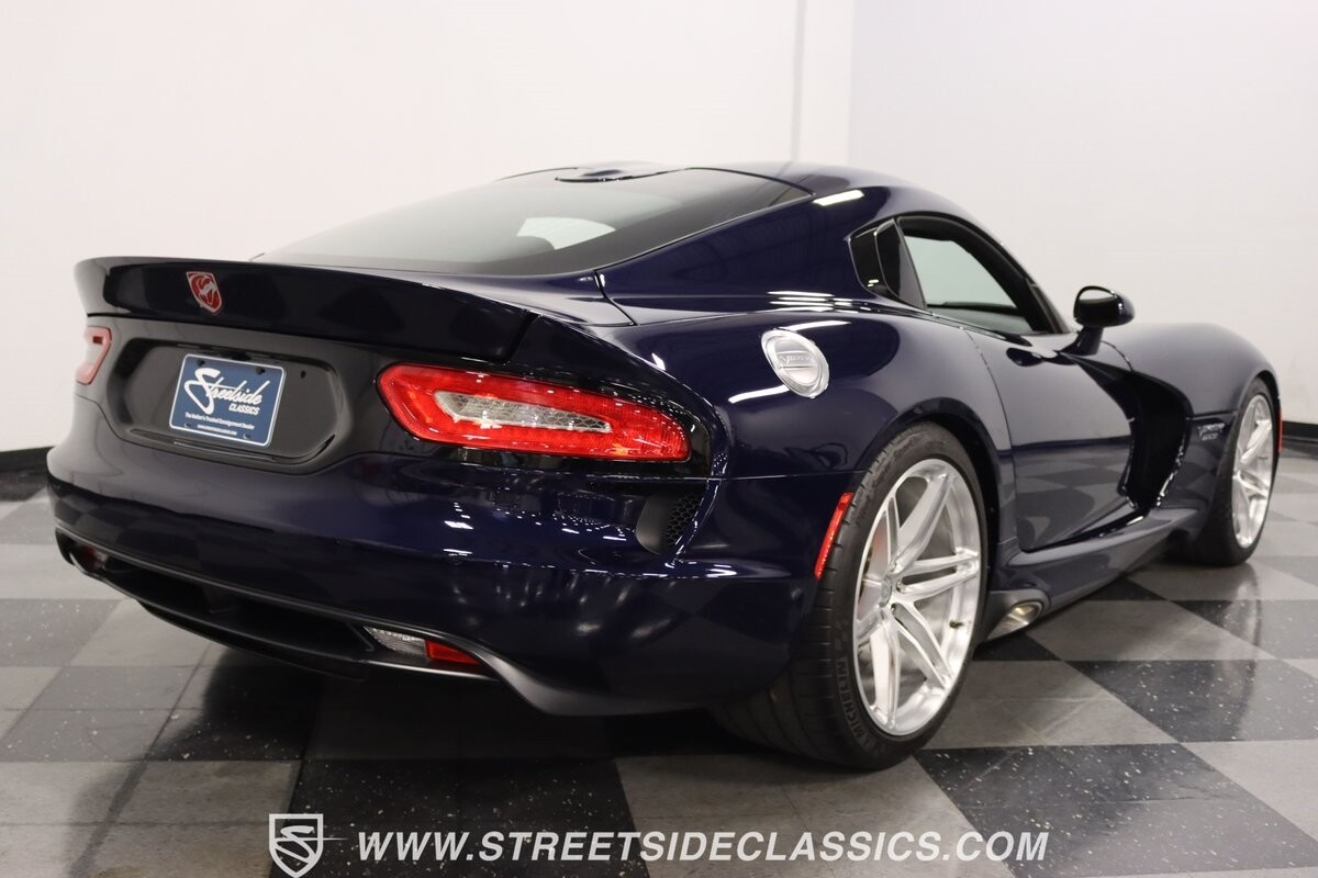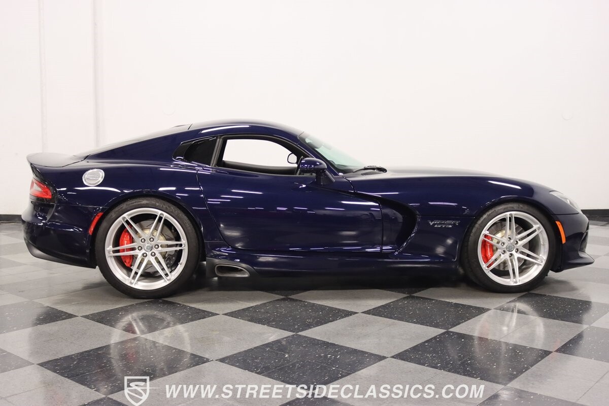 The Viper has always been a supercar, but the final generation was absolutely the best. It's a modern machine that really shows some Italian influence in the sleek design. In fact, the factory Blue Pearl paint is a terrific color that has a dark look but a glossy flair that reminds us of an Armani suit. It's the kind of look you get on a well-optioned car that has only averaged around 1200 miles annually. But this high-style appearance did not mean this Viper lost its predatory attitude. You see it in the long sleek hood with deep vents for the monster underneath, and the contoured sides that help incorporate the exhaust pipes. Plus, Dodge's tradition of letting the rear spoiler on the GTS be such a sweeping and dominant force is a true hallmark piece. And we love how the upgraded HRE alloys give us an even better view of the big brakes and aggressive red calipers.