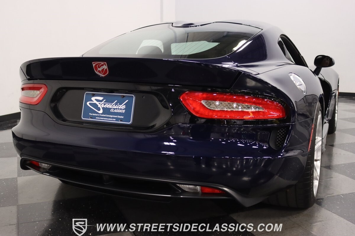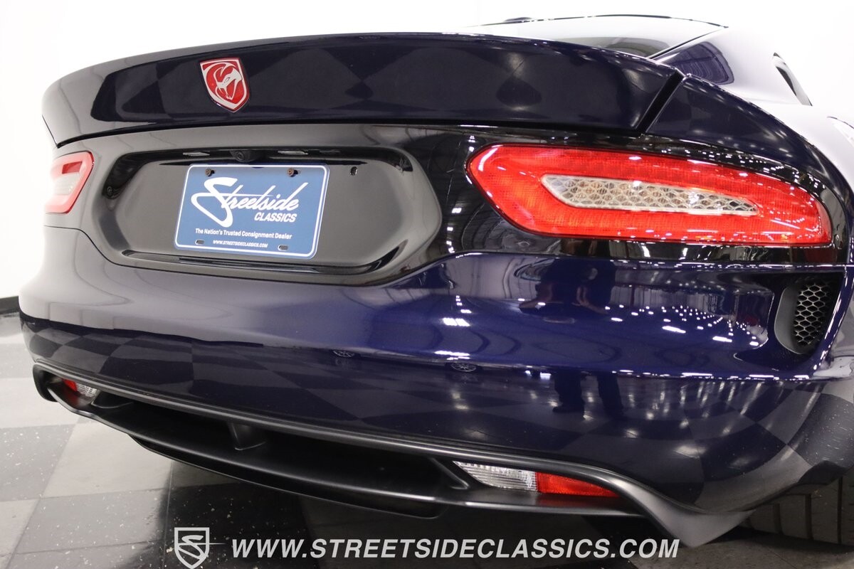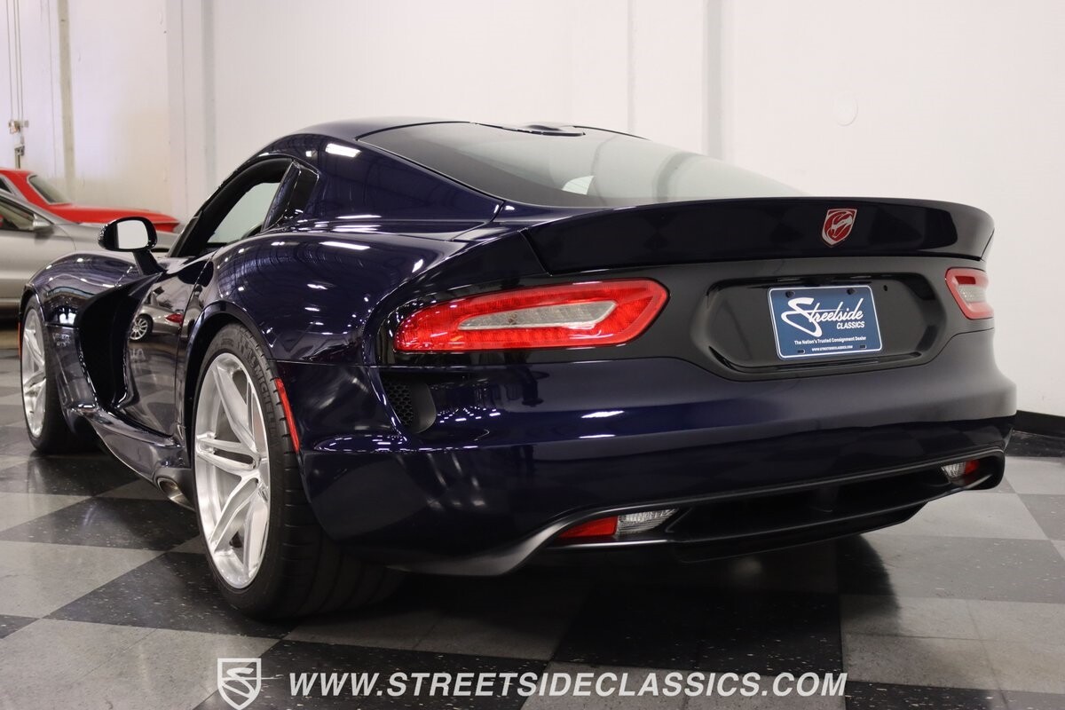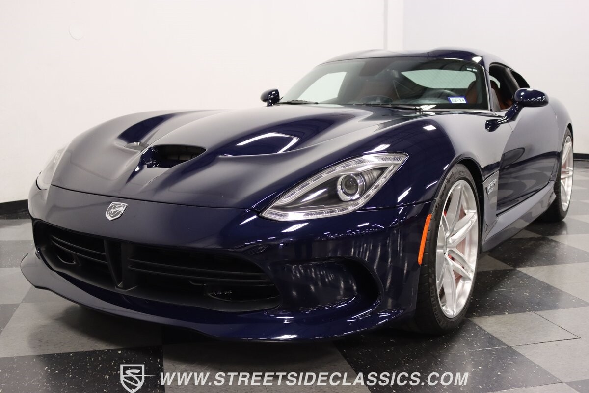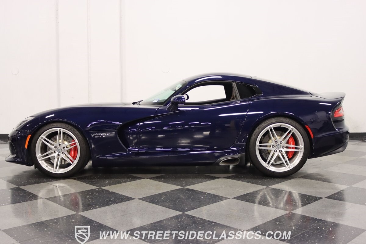 The Viper has always been a supercar, but the final generation was absolutely the best. It's a modern machine that really shows some Italian influence in the sleek design. In fact, the factory Blue Pearl paint is a terrific color that has a dark look but a glossy flair that reminds us of an Armani suit. It's the kind of look you get on a well-optioned car that has only averaged around 1200 miles annually. But this high-style appearance did not mean this Viper lost its predatory attitude. You see it in the long sleek hood with deep vents for the monster underneath, and the contoured sides that help incorporate the exhaust pipes. Plus, Dodge's tradition of letting the rear spoiler on the GTS be such a sweeping and dominant force is a true hallmark piece. And we love how the upgraded HRE alloys give us an even better view of the big brakes and aggressive red calipers.