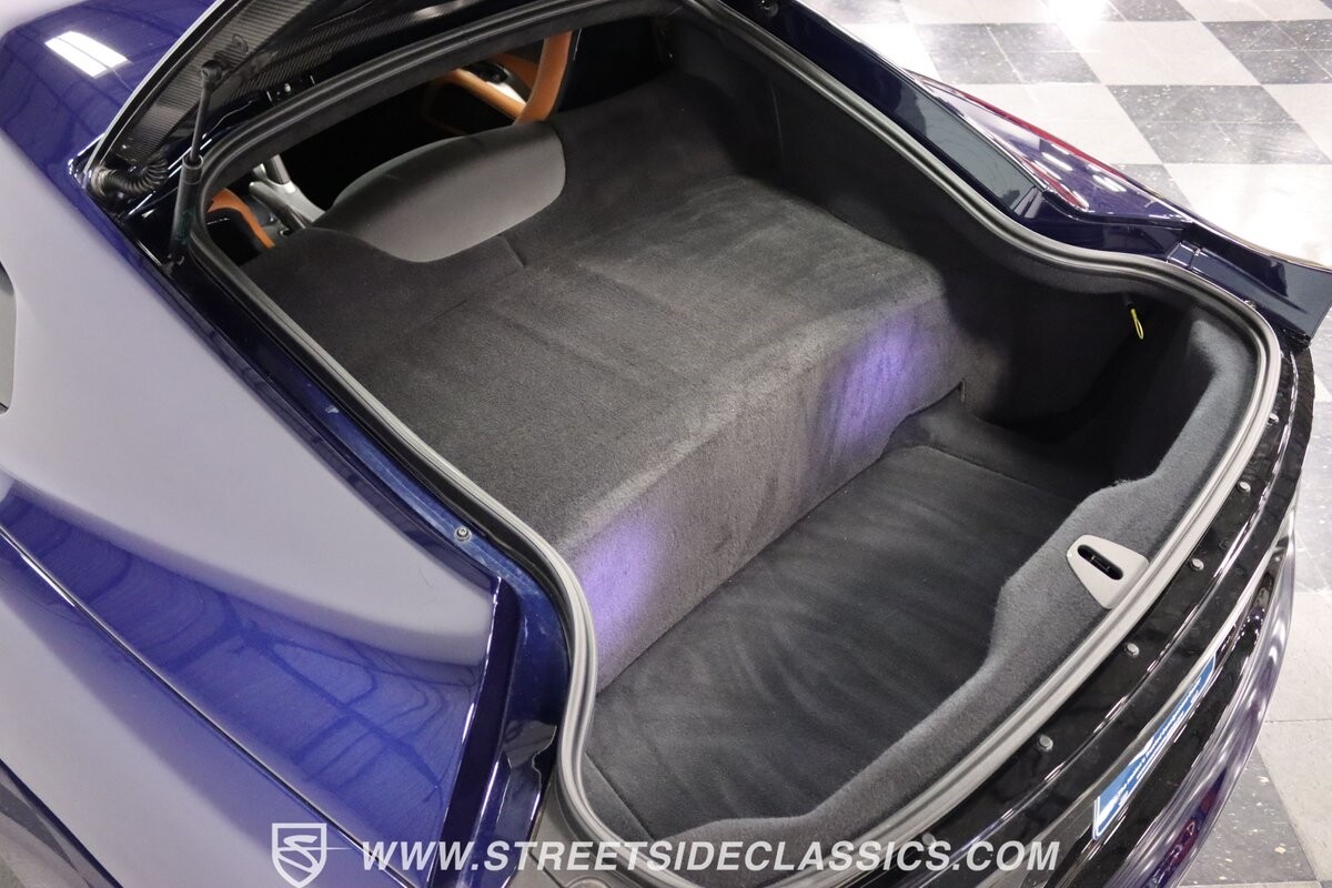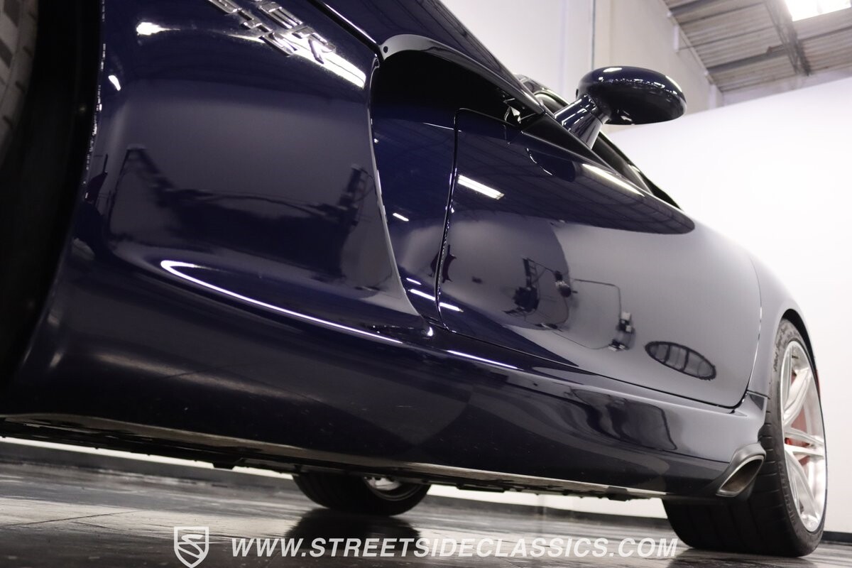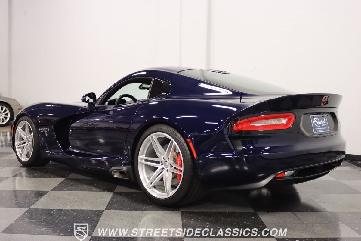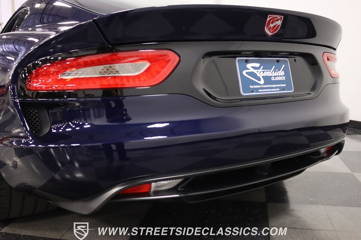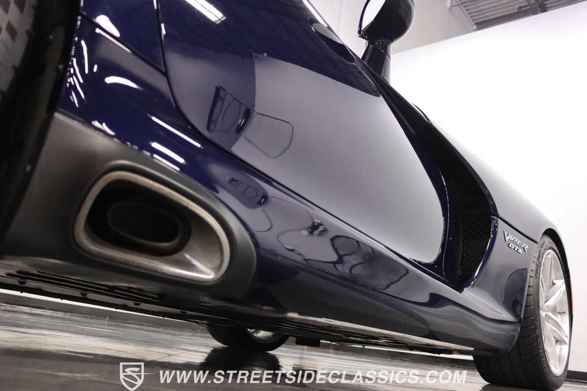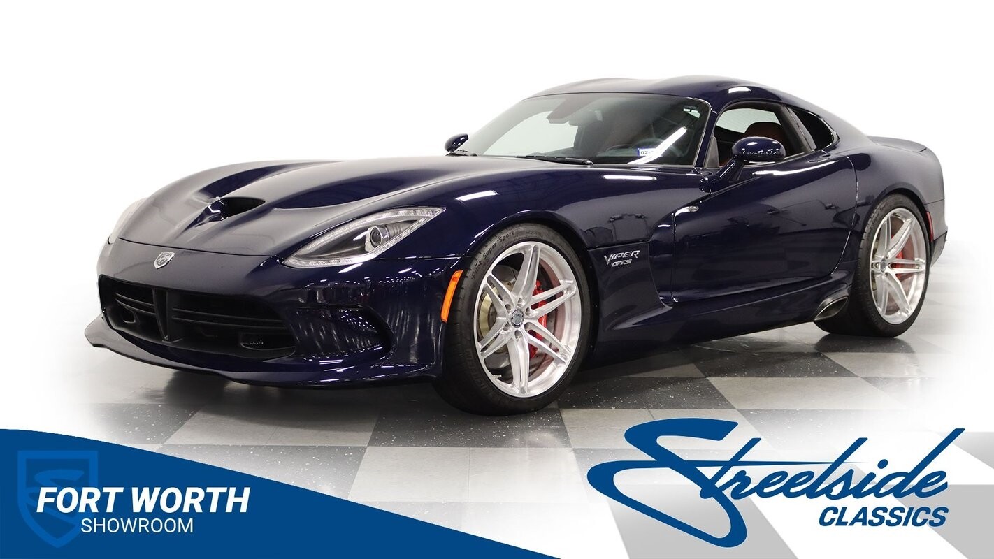 The Viper has always been a supercar, but the final generation was absolutely the best. It's a modern machine that really shows some Italian influence in the sleek design. In fact, the factory Blue Pearl paint is a terrific color that has a dark look but a glossy flair that reminds us of an Armani suit. It's the kind of look you get on a well-optioned car that has only averaged around 1200 miles annually. But this high-style appearance did not mean this Viper lost its predatory attitude. You see it in the long sleek hood with deep vents for the monster underneath, and the contoured sides that help incorporate the exhaust pipes. Plus, Dodge's tradition of letting the rear spoiler on the GTS be such a sweeping and dominant force is a true hallmark piece. And we love how the upgraded HRE alloys give us an even better view of the big brakes and aggressive red calipers.