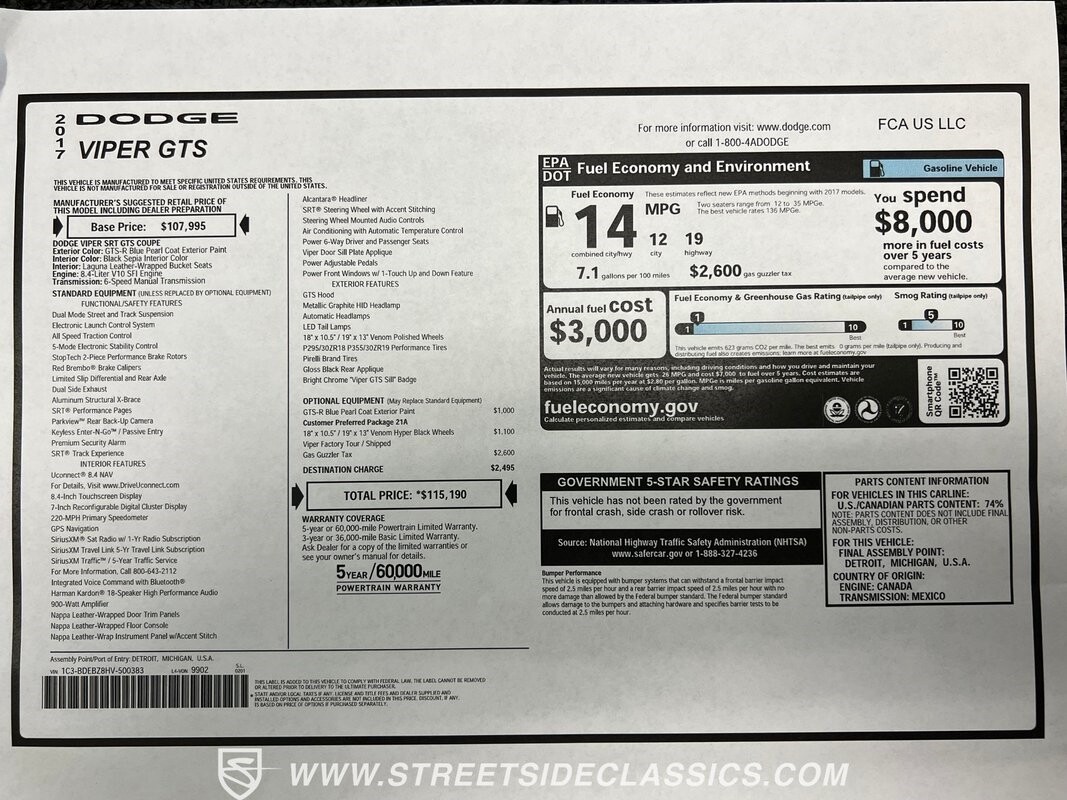 The sale comes complete with the owner's manual, a reproduction window sticker, maintenance records, and a car cover. This is likely the last Viper ever, and the production numbers were the lowest of the series in 2017. So you have a sophisticated style wrapped around speed and rarity. That's why you know you can't let this one slip away. Call today!!!