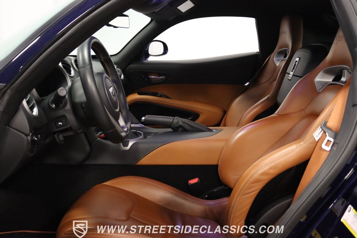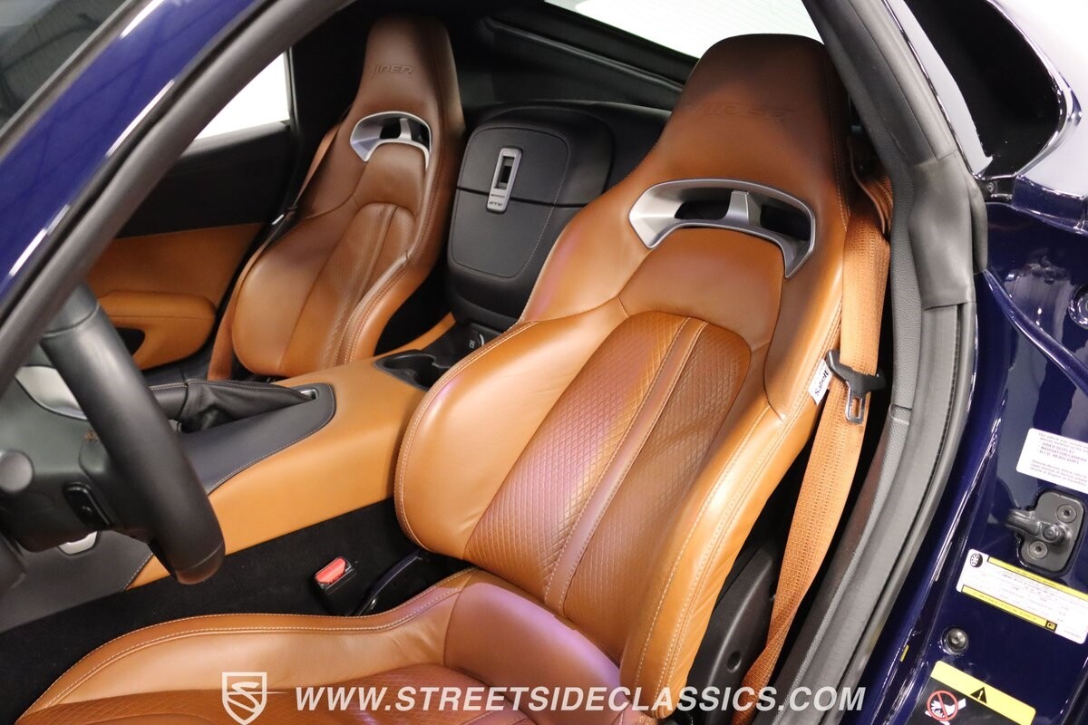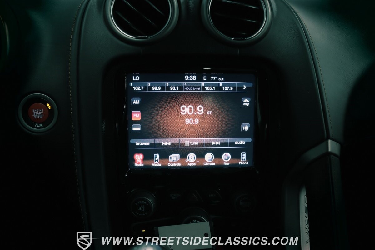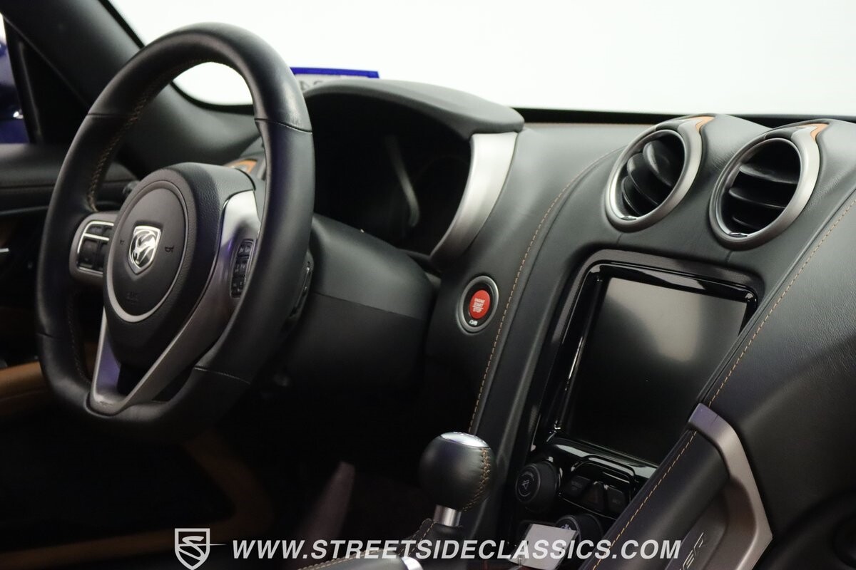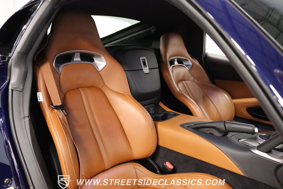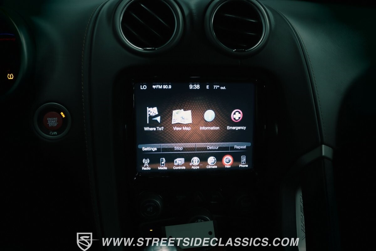 Inside, body-hugging seats finished in rich tan Laguna leather makes this Dodge feel like a Ferrari - likely another contribution from the Maserati/Ferrari bloodlines that is in this Viper's family tree. But the snakeskin texture insert is a true American Viper touch. Just like any good Viper, the interior completely envelopes the driver, but now you also have a host of modern luxury features. This includes automatic climate control, power seats, cruise control, power windows, power locks, power mirrors, and keyless entry/ignition. And you'll love the touchscreen infotainment unit that runs the backup camera, Bluetooth, sat nav, and a premium Harman Kardon 18-speaker stereo. A modern supercar also means modern safety features such as anti-lock brakes, dual front airbags, and side airbags.