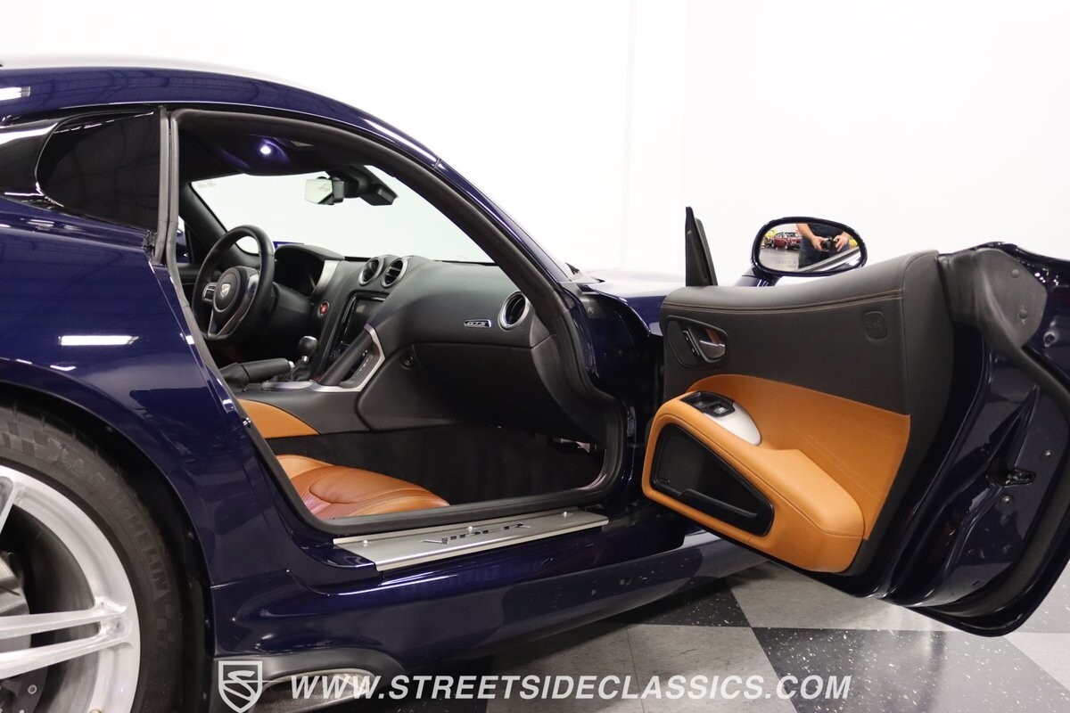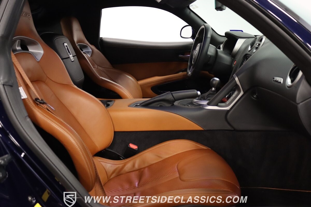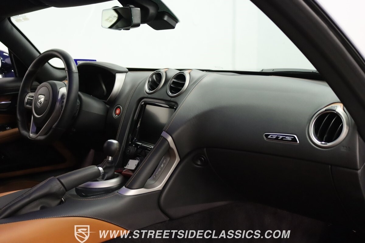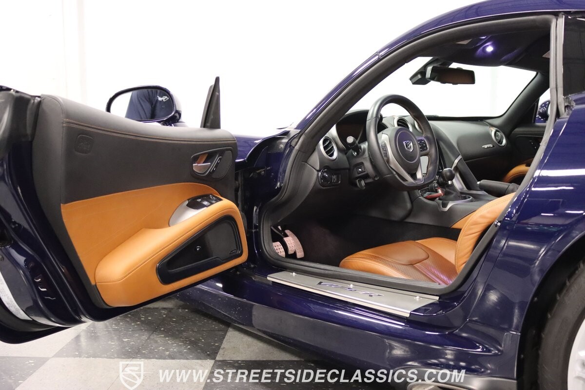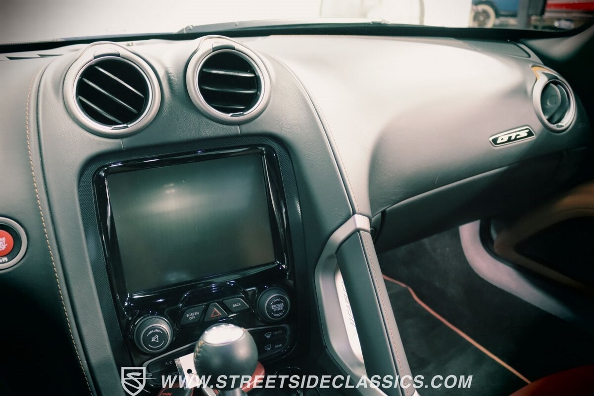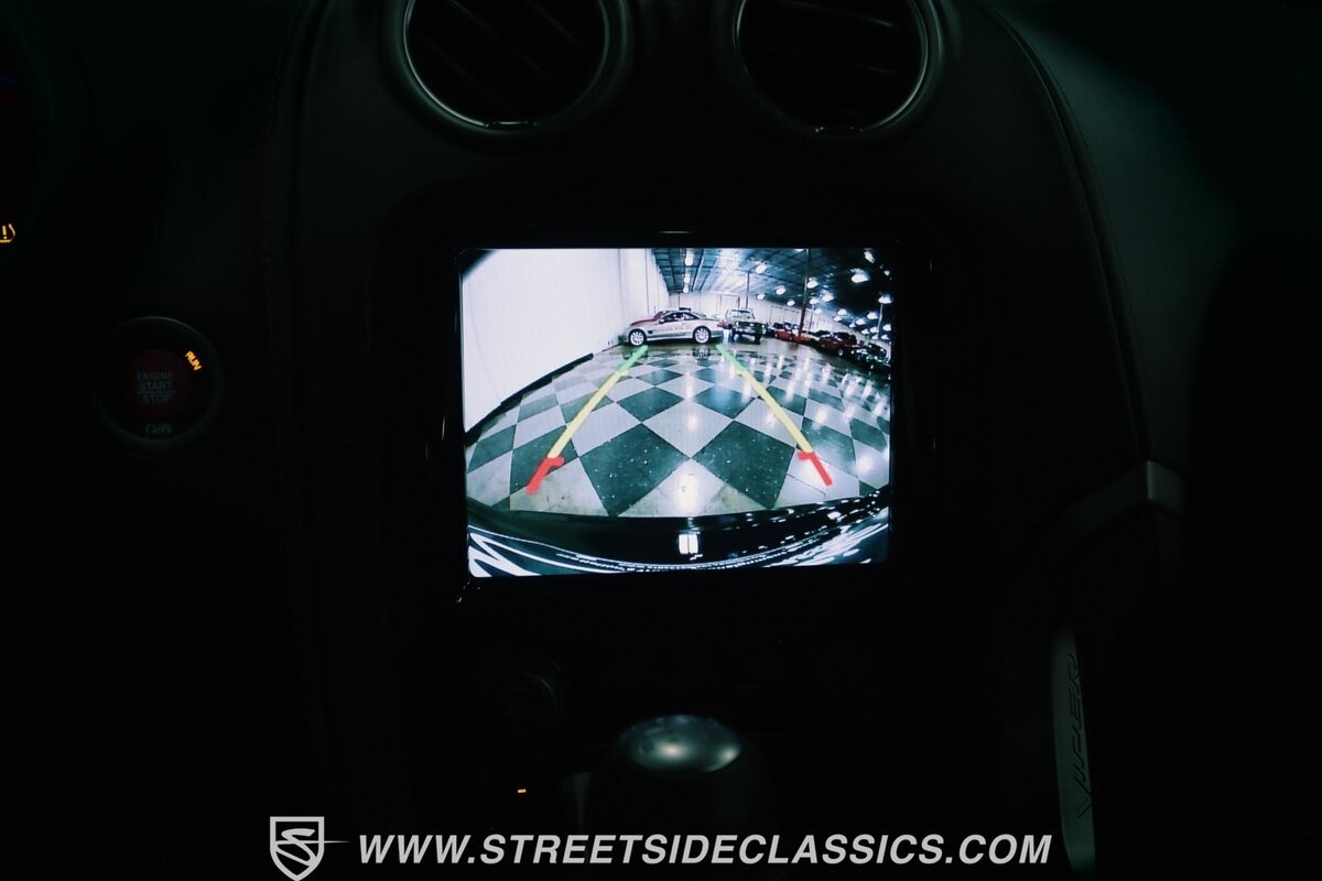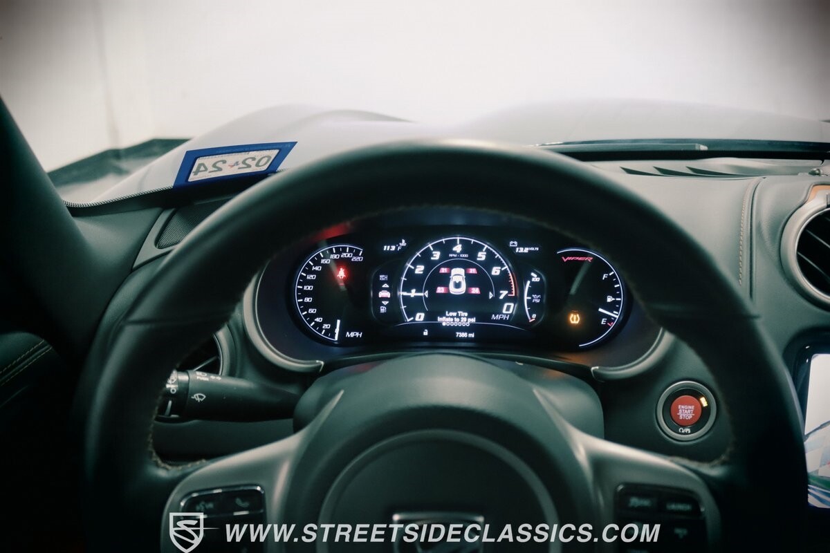Inside, body-hugging seats finished in rich tan Laguna leather makes this Dodge feel like a Ferrari - likely another contribution from the Maserati/Ferrari bloodlines that is in this Viper's family tree. But the snakeskin texture insert is a true American Viper touch. Just like any good Viper, the interior completely envelopes the driver, but now you also have a host of modern luxury features. This includes automatic climate control, power seats, cruise control, power windows, power locks, power mirrors, and keyless entry/ignition. And you'll love the touchscreen infotainment unit that runs the backup camera, Bluetooth, sat nav, and a premium Harman Kardon 18-speaker stereo. A modern supercar also means modern safety features such as anti-lock brakes, dual front airbags, and side airbags.