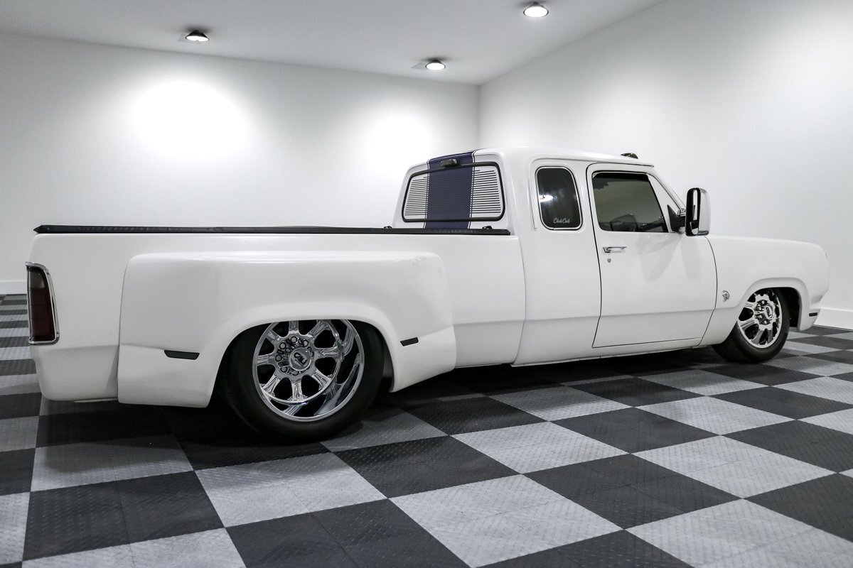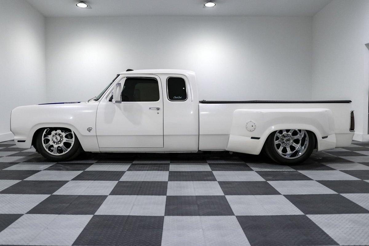 What truly sets this D-300 apart is its meticulous frame-off restoration. The original Arizona body and frame have been preserved, now complemented by custom dually fenders and Hellcat side marker lights. This truck not only looks mean but is built to handle serious tasks with gooseneck and Reese hitches, Dana 70 with 4:11 gears, and a custom-built air ride suspension system featuring a 4-link with a Watts link setup. Power steering, power brakes, and an electronic ABS braking system ensure it stops as impressively as it goes.