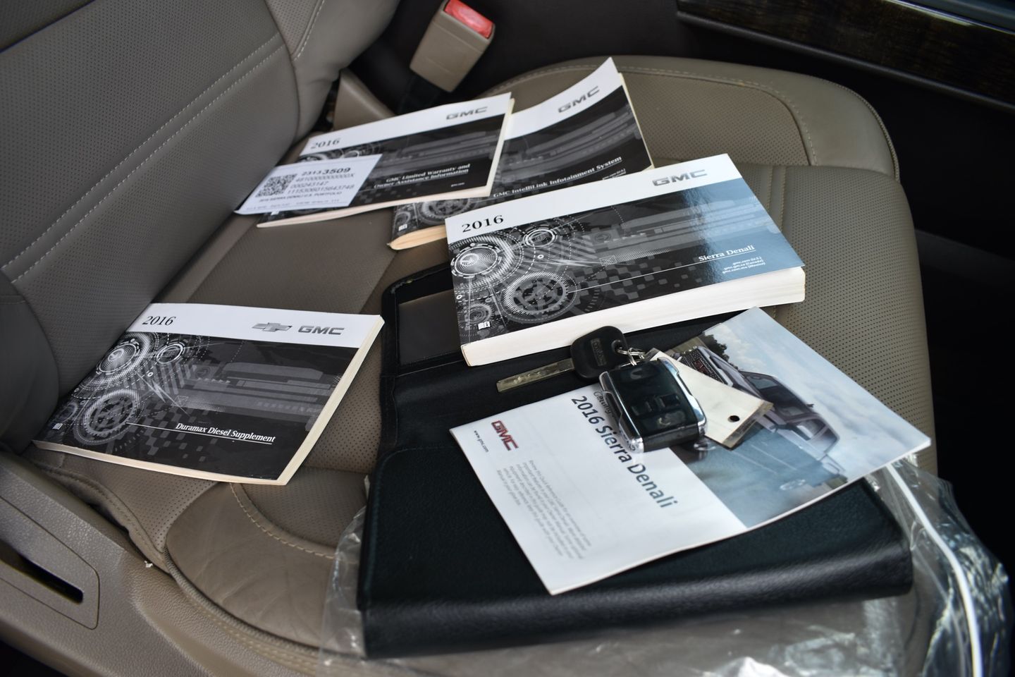 You are looking at a 2016 GMC Sierra 2500HD Crew Cab Denali 4x4. It is powered with a 6.6L Duramax Diesel V8 and Allison automatic transmission. It is equipped with factory navigation with am/fm/cd player, heated/cooled seats, power windows, power locks, power mirrors, tilt, cruise, spray in bed liner, and receiver hitch. Also included is the owners manuals and one keyless remote.