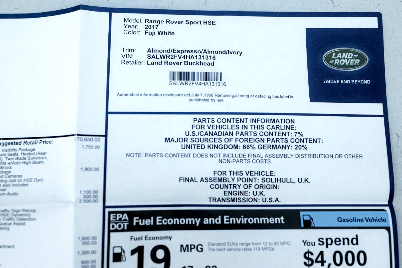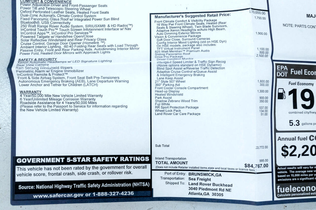 FULL HIGH RESOLUTION PHOTOS AND DETAILED DESCRIPTION ON YOU HAVE A VEHICLE YOU ARE LOOKING TO SELL, PLEASE CALL US AT 770-455-8494WE SHOW VEHICLES BY APPOINTMENT ONLY. PLEASE CALL TO SCHEDULE AN APPOINTMENT IN ORDER TO VIEW A LISTING IN PERSON.NEW ARRIVAL!! WELL EQUIPPED RANGE ROVER SPORT V6 SUPERCHARGED HSE! READY TO GO, RUNS AND DRIVES VERY NICELY. COMES WITH BOOKS, MANUALS, AND ORIGINAL WINDOW STICKER! $84,767 ORIGINAL MSRP!EXTERIOR IS FINISHED INFUJIWHITE OVERALMOND/ESPRESSO/IVORYLEATHER INTERIOR.FACTORY OPTIONS AND FEATURES INCLUDE:3.0L SUPERCHARGEDV6 ENGINEAUTOMATIC TRANSMISSION4 WHEEL DRIVEAIR SUSPENSIONTERRAIN RESPONSE CONTROL21 STYLE 507 WHEELHEAD UP DISPLAYFRONT CLIMATE COMFORT & VISIBILITY PACKAGEHEATED AND VENTILATED FRONT SEATSHEATED REAR SEATSHEATED STEERING WHEELADAPTIVE XENON HEADLIGHTSVISION & CONVENIENCE PACKAGESOFT CLOSE DOORSSURROUND VIEW CAMERASMERIDIAN PREMIUM AUDIOSLIDING PANORAMIC ROOFDRIVE PRO PACKAGEBLIND SPOT ASSIST W/ REVERSE TRAFFIC DETECTIONADAPTIVE CRUISE CONTROLLANE KEEP ASSISTFRONT COOLER CONSOLE DEPARTMENTPROTECTION PACKAGEBLUETOOTHNAVIGATIONAMBIENT LIGHTINGPOWER LIFTGATEKEYLESS ENTRYKEYLESS STARTAND SO MUCH MORE.GAS MOTORCARS IS A FAMILY OWNED AND OPERATED CAR DEALERSHIP LOCATED IN MARIETTA, GA. WE ONLY SELL VEHICLES OF THE HIGHEST QUALITY. WE SHIP VEHICLES WORLDWIDE AT THE BUYER'S EXPENSE. WE TAKE CONSIGNMENTS AS WELL AS TRADES.WE SHOW VEHICLES BY APPOINTMENT ONLY.PLEASE CALL AHEAD TO SCHEDULE A DATE AND TIME IN ORDER TO VIEW A LISTING IN PERSON.CONNECT WITH US ON INSTAGRAM @GASMOTORCARSIt is the customers sole responsibility to verify the existence and condition of any equipment listed. Neither the dealership nor DealerCarSearch is responsible for misprints on prices or equipment. It is the customers sole responsibility to verify the accuracy of the prices with the dealer, including the pricing for all added accessories. Visit Gas Motorcars online at to see more pictures of this vehicle or call us at770-455-8494 today to schedule your test drive.
