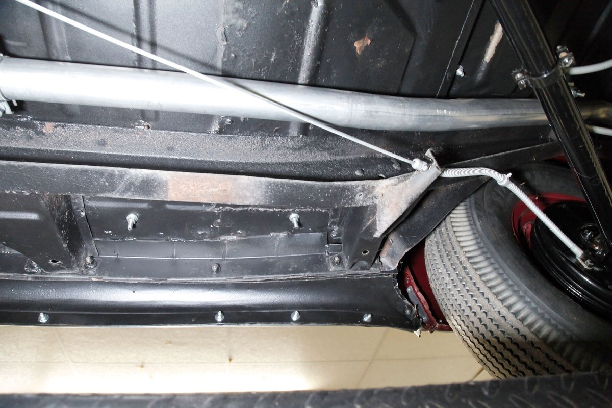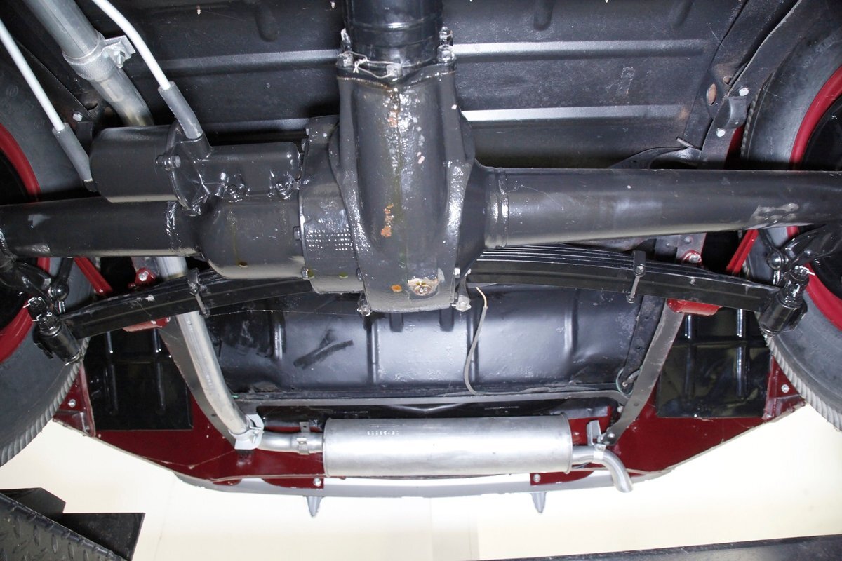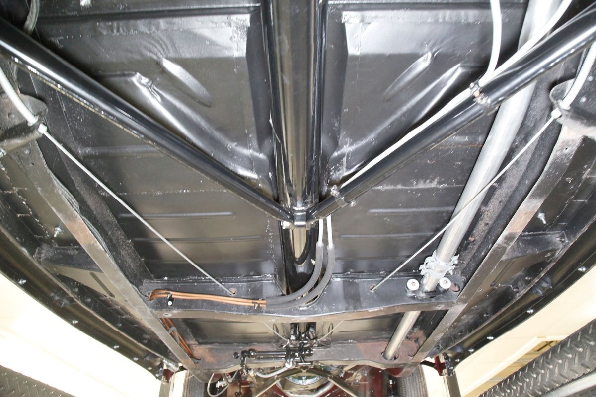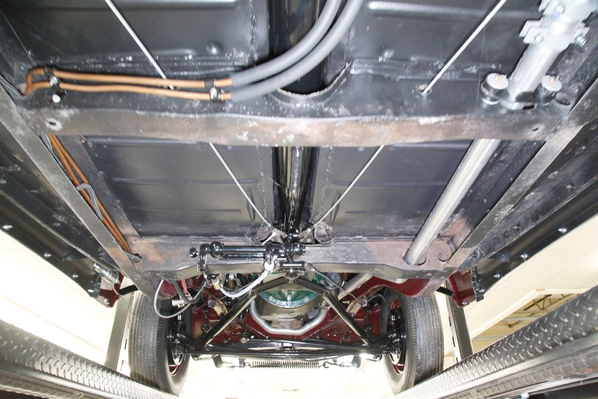 Once up in the air we note the advanced feature of a fully unitized chassis. Although there is still a ladder frame, it is welded to the body rather than bolted. Here we see nicely painted black for the flooring, frame, and undersides of the running boards with only light surface rust where the paint was lightly applied. Transverse leaf springs provide the ride both front and rear and mechanical 4 wheel drum brakes are seen as well, "the safety of steel from pedal to wheel", as the Ford slogan went. The fuel tank is not installed, however, our consignor notes that it has been fully redone. Just a nicely done job under here.
