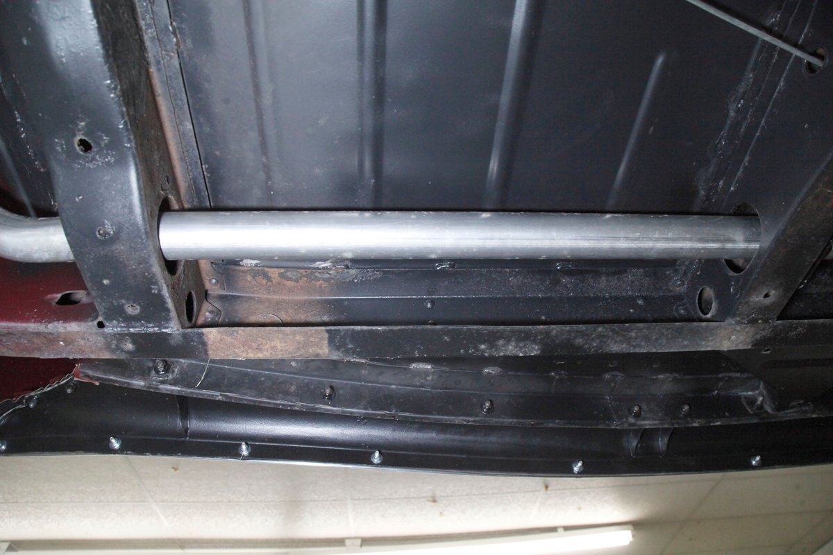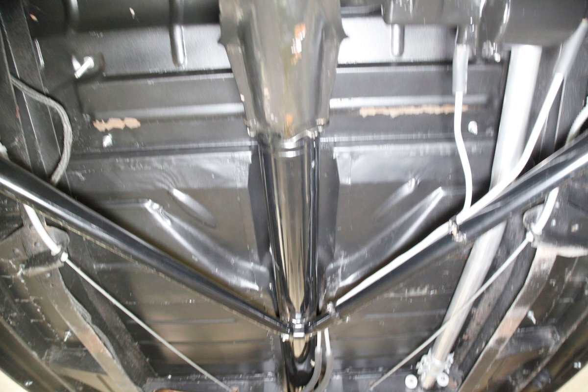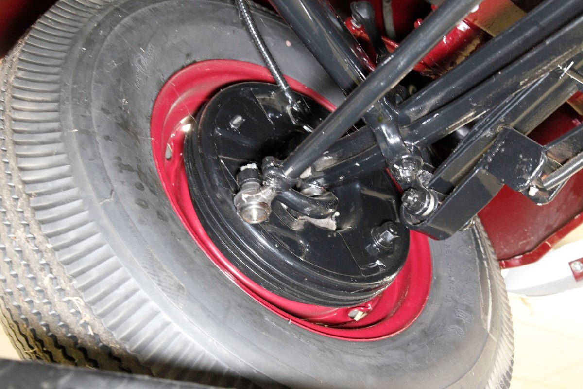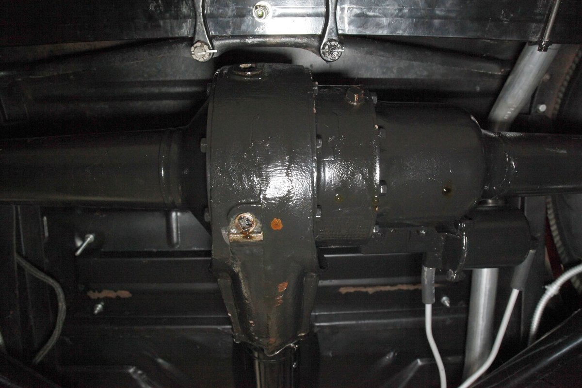 Once up in the air we note the advanced feature of a fully unitized chassis. Although there is still a ladder frame, it is welded to the body rather than bolted. Here we see nicely painted black for the flooring, frame, and undersides of the running boards with only light surface rust where the paint was lightly applied. Transverse leaf springs provide the ride both front and rear and mechanical 4 wheel drum brakes are seen as well, "the safety of steel from pedal to wheel", as the Ford slogan went. The fuel tank is not installed, however, our consignor notes that it has been fully redone. Just a nicely done job under here.