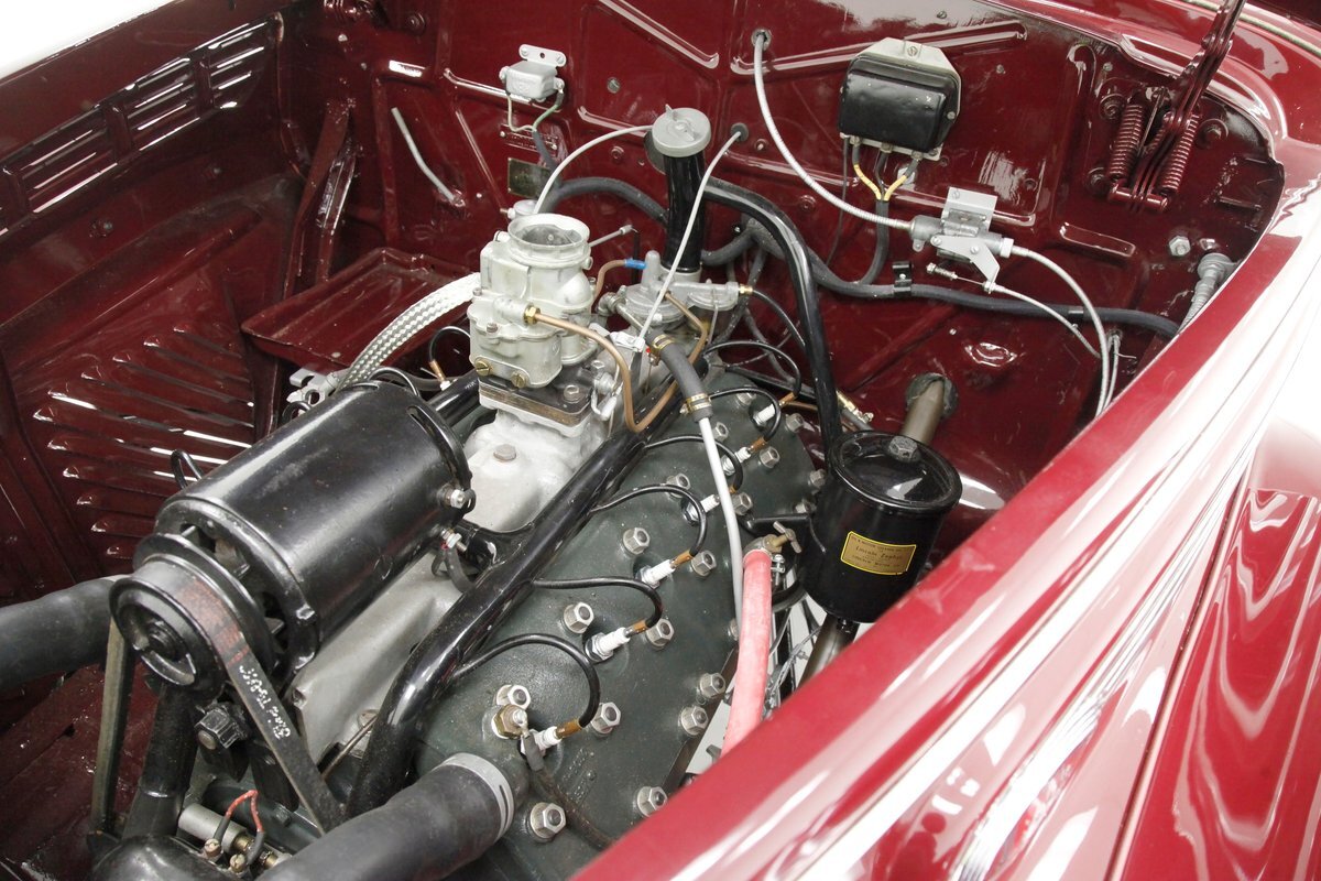 A correct and fully rebuilt V12 with 267 cubes in flathead form is buttoned up under the long streamline hood. A single 2-barrel carburetor tops this mill, and a rebuilt 3-speed manual transmission and a 2-speed rear axle with 4.44 gears make up the drivetrain. All has been well restored and is looking better than new in its olive green finish.