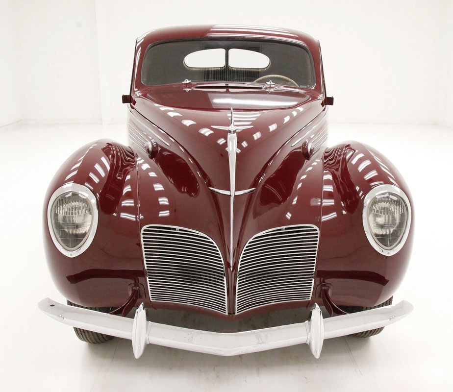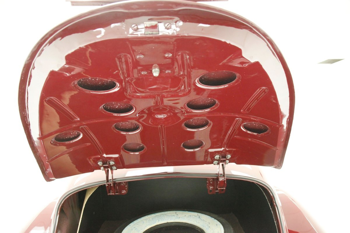 Burgundy paint bathes the exterior panels and it's hard to find a single fault in the finish. Wonderfully formed steel curves abound on this car, and with a minimal use of brightwork, one can truly appreciate and breathe in the luxurious lines of the body. Mirror polished bumpers with their bumperettes, headlight bezels, handles and mirrors are all excellently restored with no dimpling or rusting. From its horizontally ribbed V-shape grille to the semi sunken headlights this car screams streamline. For your history lesson of the day: Complaints about the '36 and '37 Zephyr's tendency to overheat were pouring in to Ford. So according to an interview with Gregoire, he measured the space between the front frame rails, and decided that the radiator would just fit between them, if mounted horizontally, (cross-flow), and quickly had it cobbled up, along with cut-outs on both sides of the front sheet metal. A quick run in a crude air-tunnel proved its effectiveness, so "Bob" Gregoire designed the delicately ribbed grille over the openings. Voila; the first modern horizontally-oriented grille. So much so that rumor has it GM Styling Head Harley Earl was quoted as saying: "Oh my God, how did we miss on that one? That's going to ruin us". Nice running boards with excellent rubber connect the curvaceous fenders and just above the true teardrop shape of the passenger compartment of the body, which is amplified by the rounded doors. Beautiful rear fender skirts continue with the teardrop design and highlight the rear fender design nicely. Teardrop style tail lights are mounted into the pointed trailing edges of the rear fenders and frame a swooping trunk lid with another flawless bumper below. Period correct and nearly new Firestone wide white wall rubber wraps 16" steel wheels which are adorned by simple dog dish style caps with the Lincoln-Zephyr logo within.