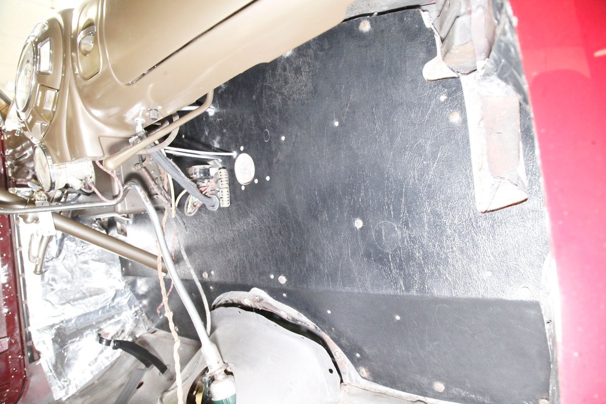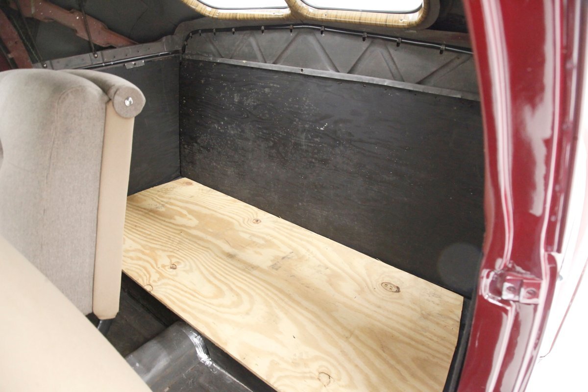 A swing of either of the 2 doors and we see the bare steel shell and inner workings of the doors. These doors, as well as the rear sides are missing their panels, but we do note fully refinished zebra grain wood applique covered window frames. As we move inside, a couchlike bench seat within its own stylized tub, is all covered in tan broadcloth with a slight tuck and roll pattern with a few buttons sprawls across the front of the cabin. This bench is like new and has no wear or tears to speak of. The rear of the car is unfinished with a mix of black painted and natural finish plywood providing the base for whatever you'd like to install. Stamped sheet metal, finished in black and all rust free floats this interior and peering upward we see the underside of the roof in bare steel, so you can add those items to your to do list. Lest we forget the highlight of the interior which is an art deco styled dash. Grayish taupe painted steel, twin gloveboxes, and a centrally located chrome bezel white face gauges with black type flanks the factory AM radio on the left, ashtray on the right, and the factory clock below all with matching more art deco styling. An original and fully restored large cream rimmed banjo style steering wheel fronts this beautiful dash.
