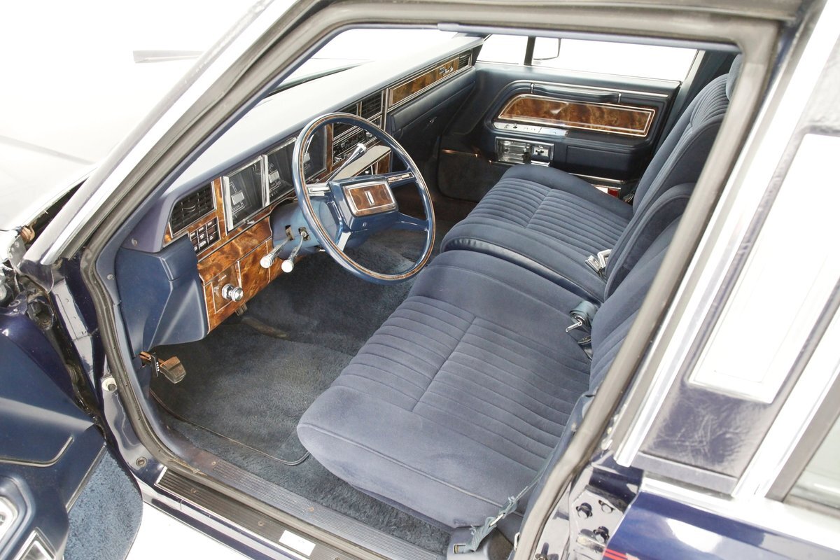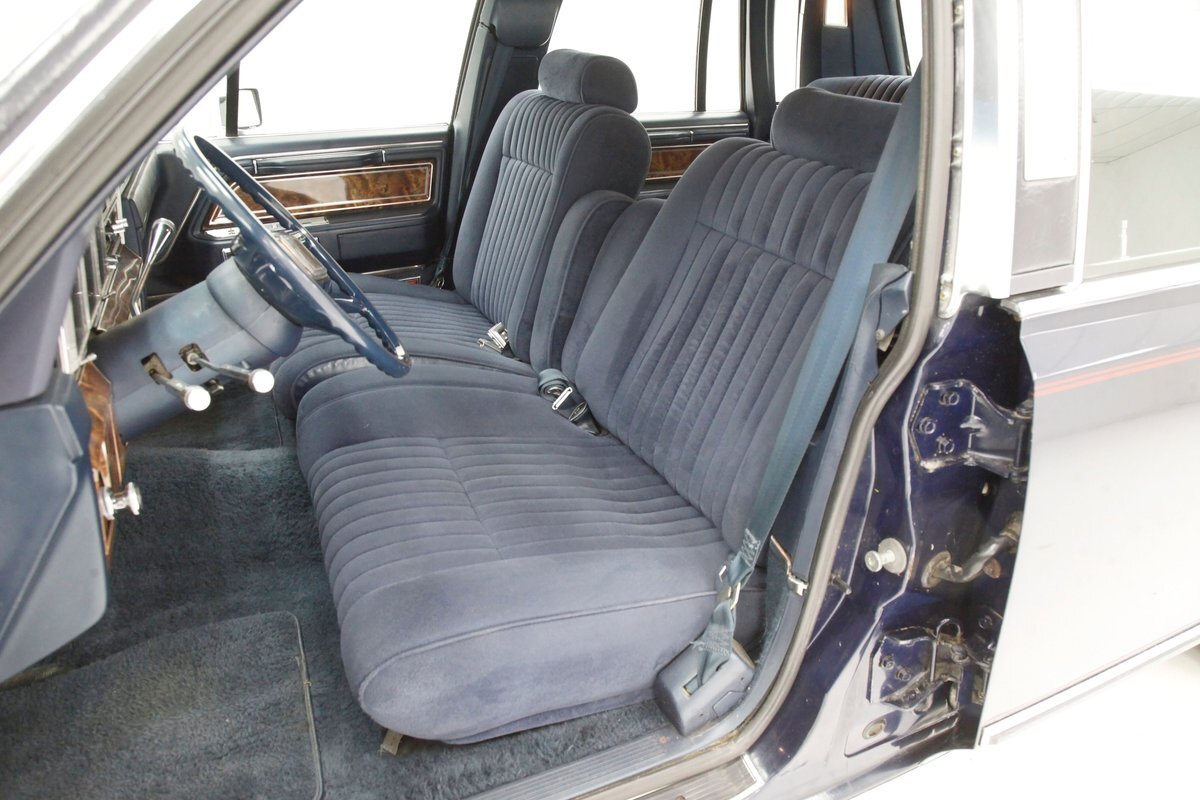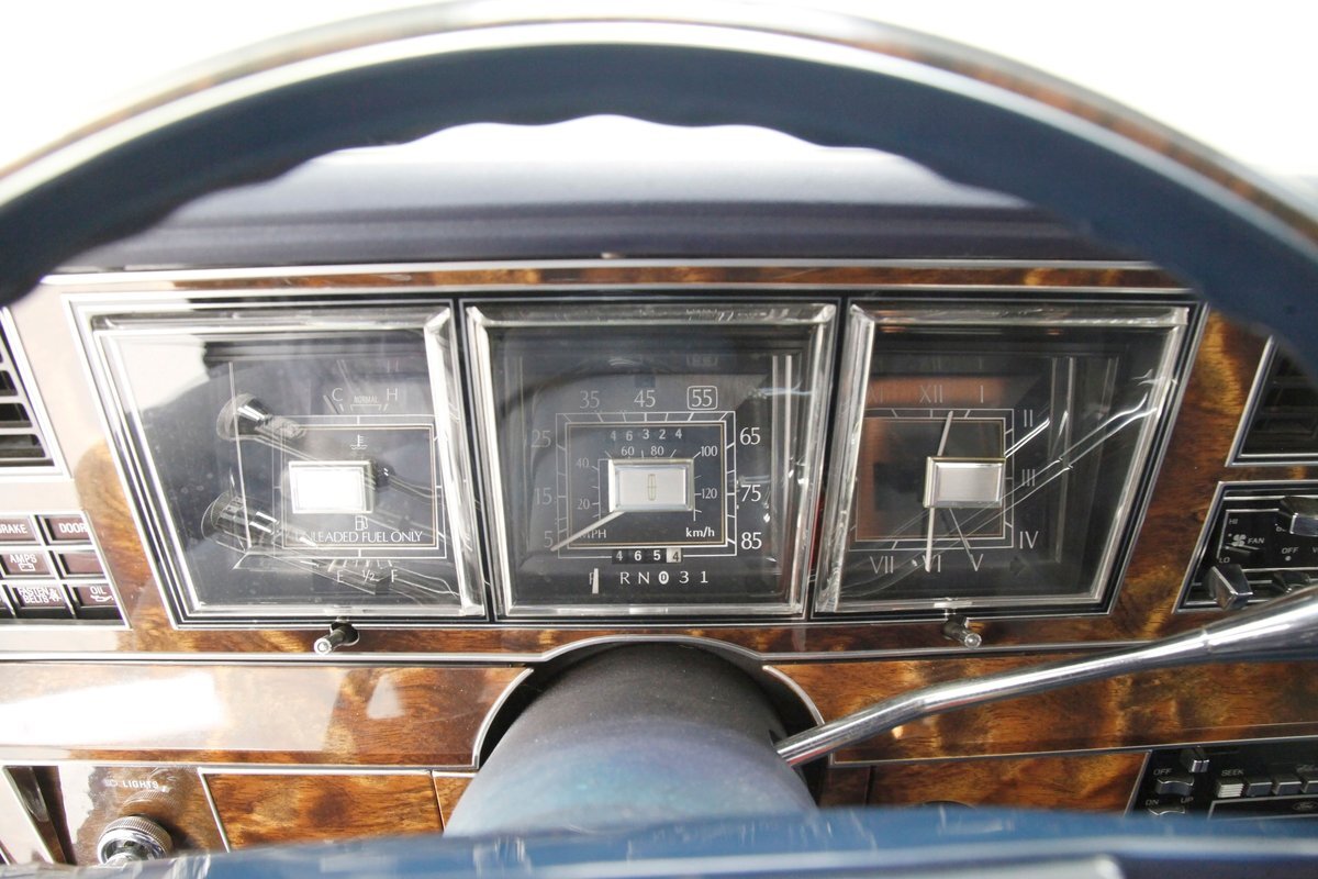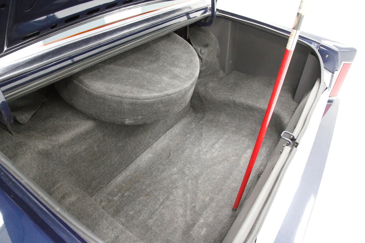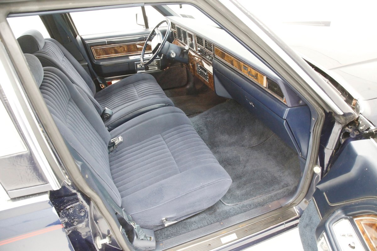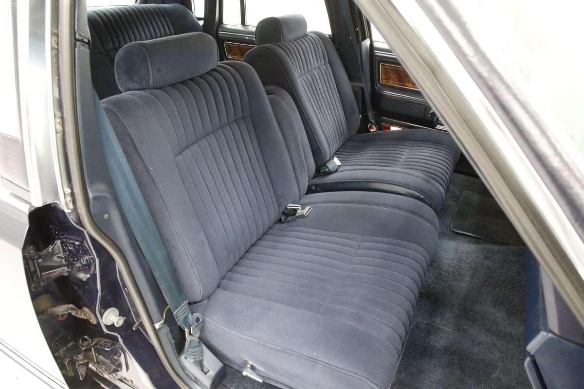 Beautiful and luxurious dark blue covers most of the interior surfaces. All controls are within the silver door panel inserts and have a wood applique background just above which adds some nice contrast to the dark blue vinyl and carpet below. Well preserved dark blue overstuffed large velour buckets are separated by a fold down armrest. If up, it could accommodate a 3rd passenger upfront. The rear bench is just as luxurious and affords plenty of legroom. The steering wheel has controls for the cruise control and on the dash is a mixture dark blue padded vinyl and faux burl surrounds the black faced analog gauges. This holds true for the radio/cassette player and climate control center. On top is padded blue vinyl and it is in very good condition. Dark blue deep pile carpeting is reserved for the floors and a new tight dark blue broadcloth headliner is above.