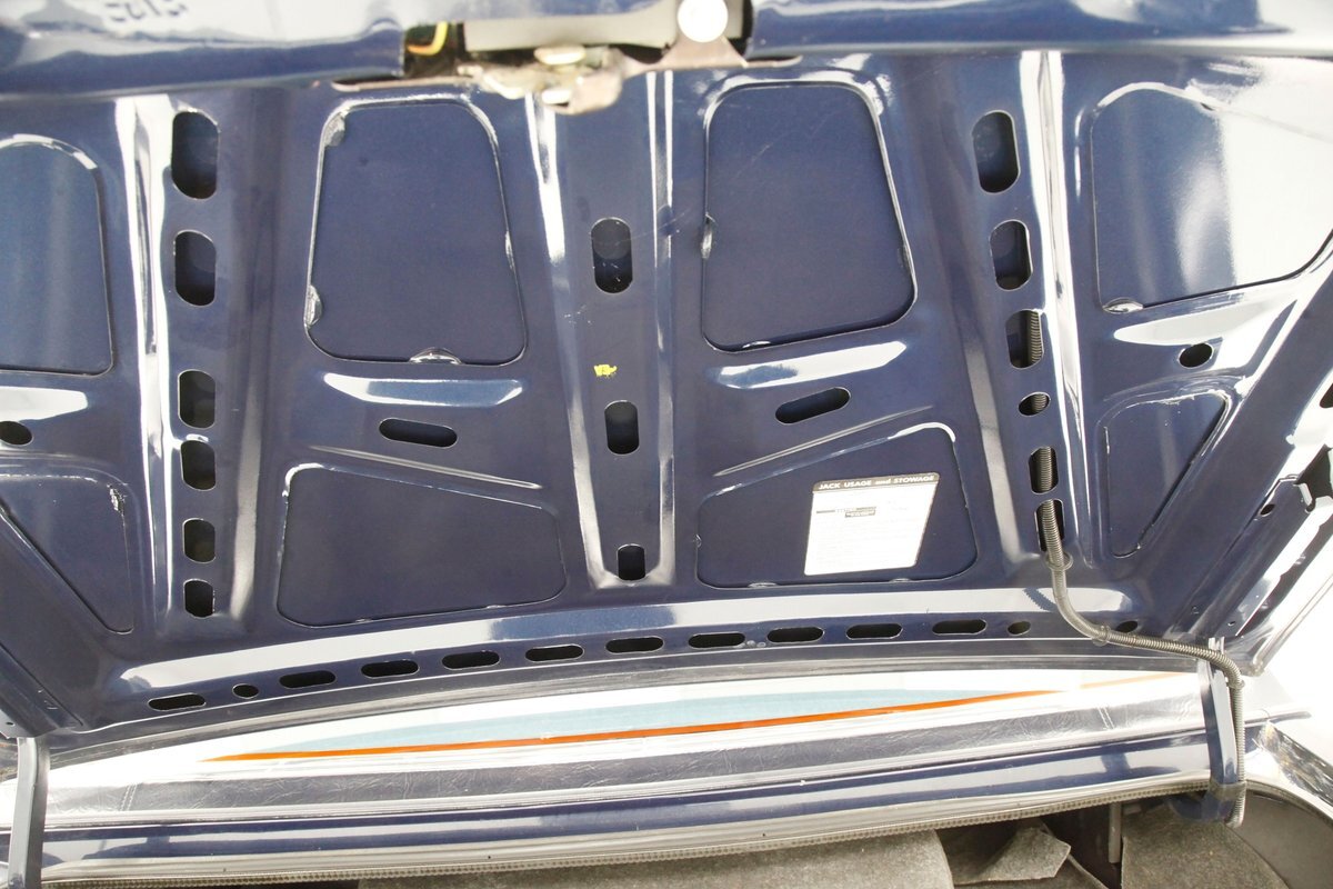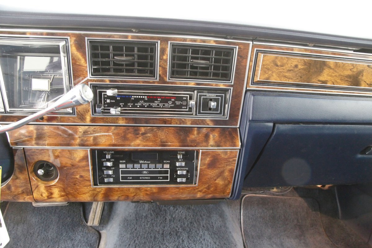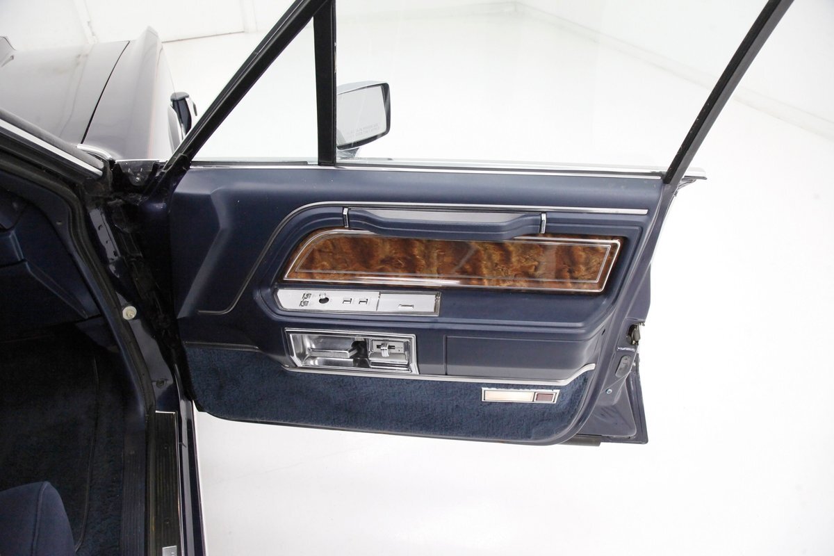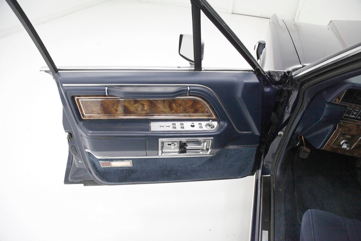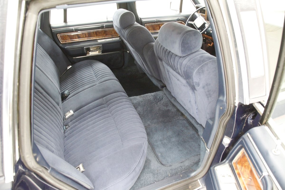 Beautiful and luxurious dark blue covers most of the interior surfaces. All controls are within the silver door panel inserts and have a wood applique background just above which adds some nice contrast to the dark blue vinyl and carpet below. Well preserved dark blue overstuffed large velour buckets are separated by a fold down armrest. If up, it could accommodate a 3rd passenger upfront. The rear bench is just as luxurious and affords plenty of legroom. The steering wheel has controls for the cruise control and on the dash is a mixture dark blue padded vinyl and faux burl surrounds the black faced analog gauges. This holds true for the radio/cassette player and climate control center. On top is padded blue vinyl and it is in very good condition. Dark blue deep pile carpeting is reserved for the floors and a new tight dark blue broadcloth headliner is above.