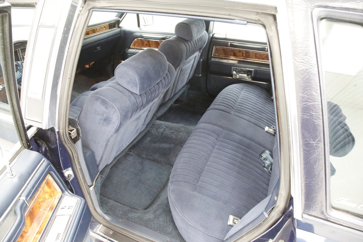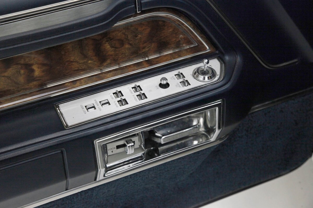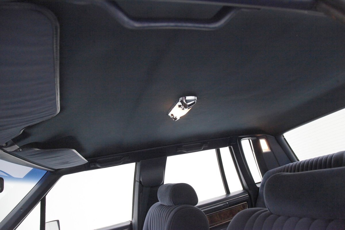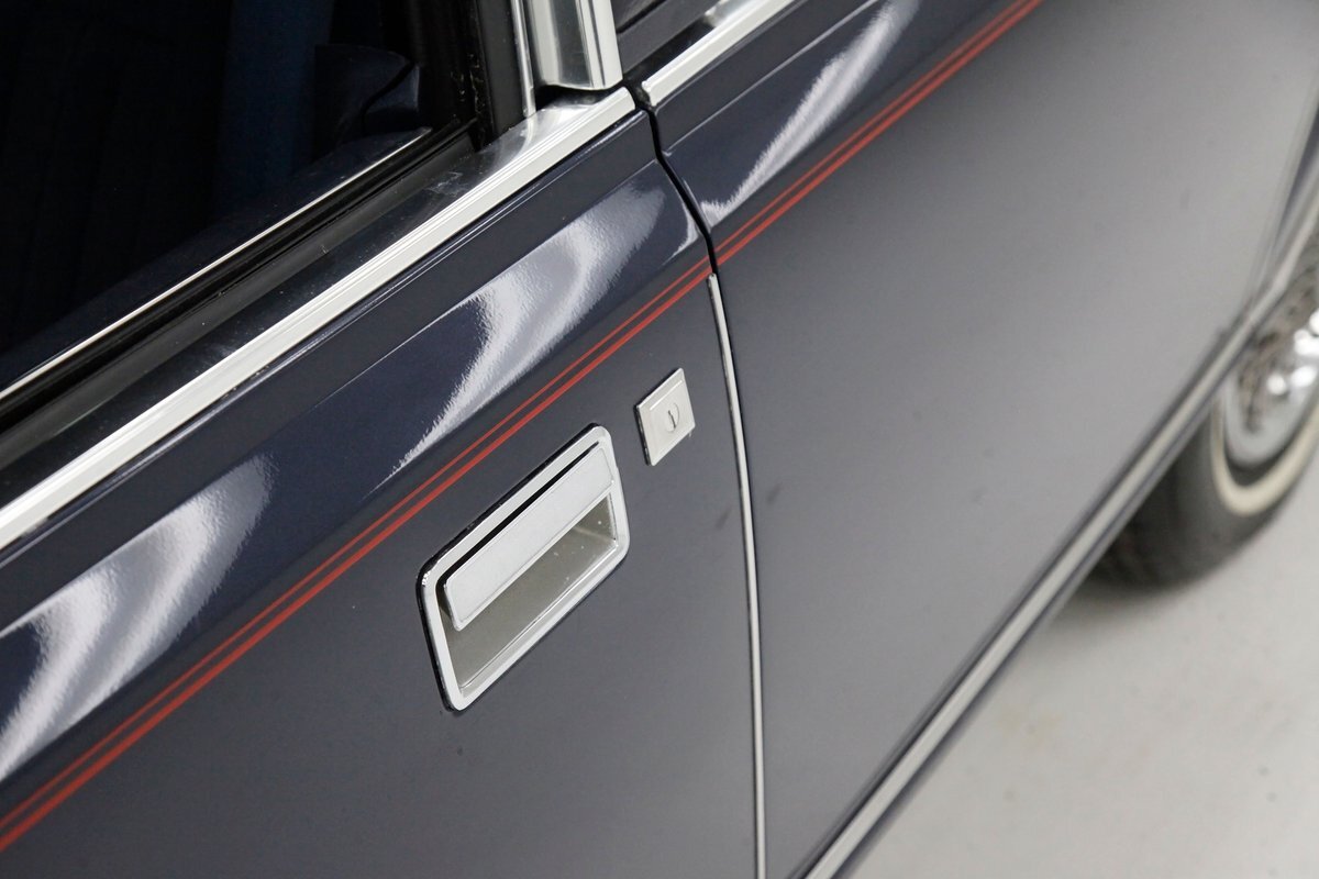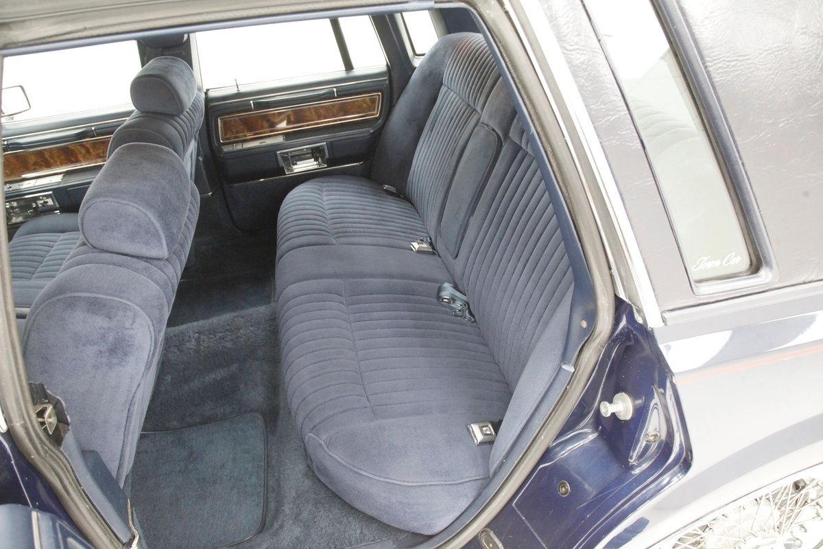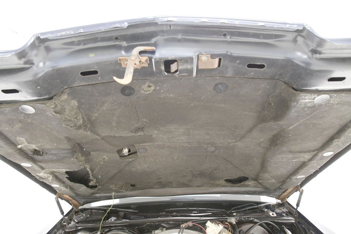 Beautiful and luxurious dark blue covers most of the interior surfaces. All controls are within the silver door panel inserts and have a wood applique background just above which adds some nice contrast to the dark blue vinyl and carpet below. Well preserved dark blue overstuffed large velour buckets are separated by a fold down armrest. If up, it could accommodate a 3rd passenger upfront. The rear bench is just as luxurious and affords plenty of legroom. The steering wheel has controls for the cruise control and on the dash is a mixture dark blue padded vinyl and faux burl surrounds the black faced analog gauges. This holds true for the radio/cassette player and climate control center. On top is padded blue vinyl and it is in very good condition. Dark blue deep pile carpeting is reserved for the floors and a new tight dark blue broadcloth headliner is above.
