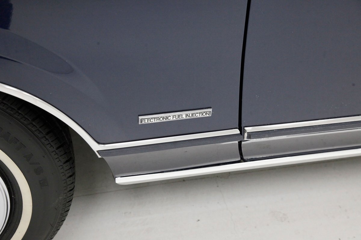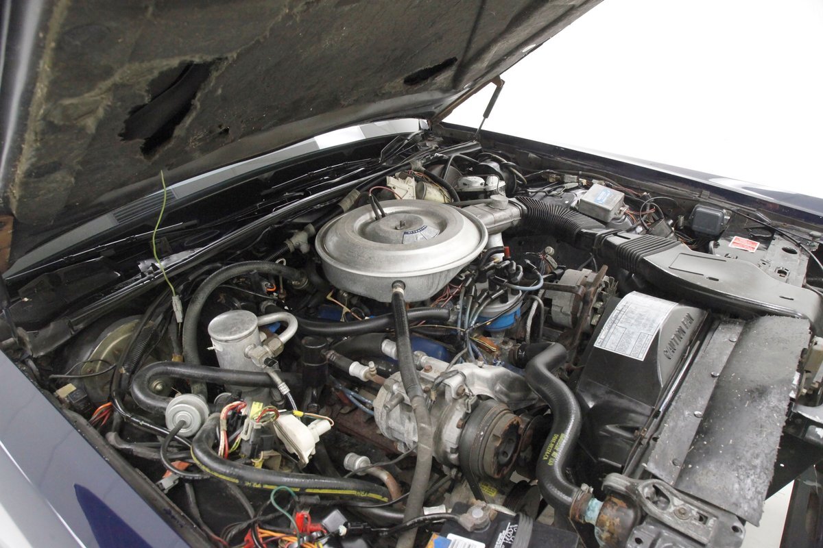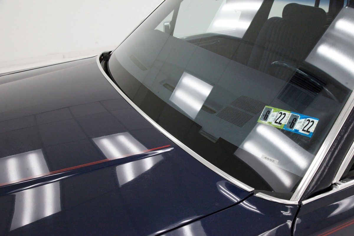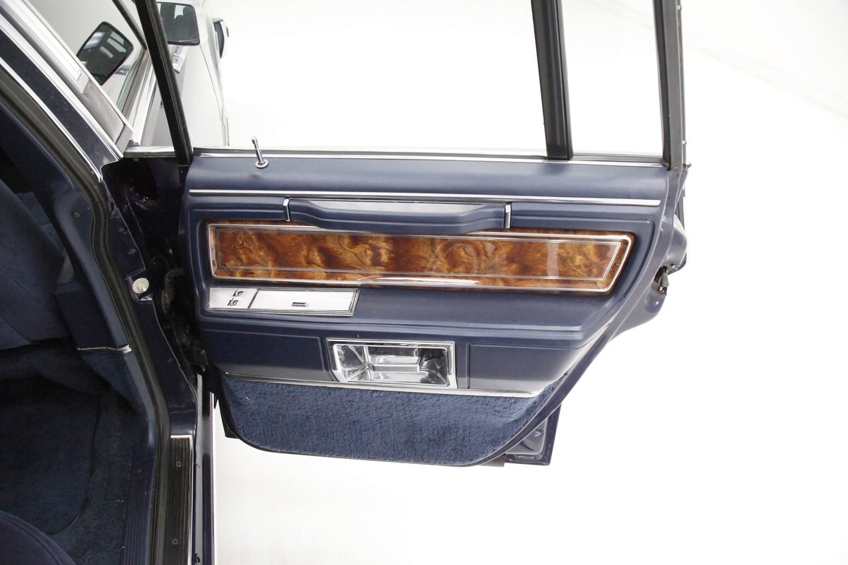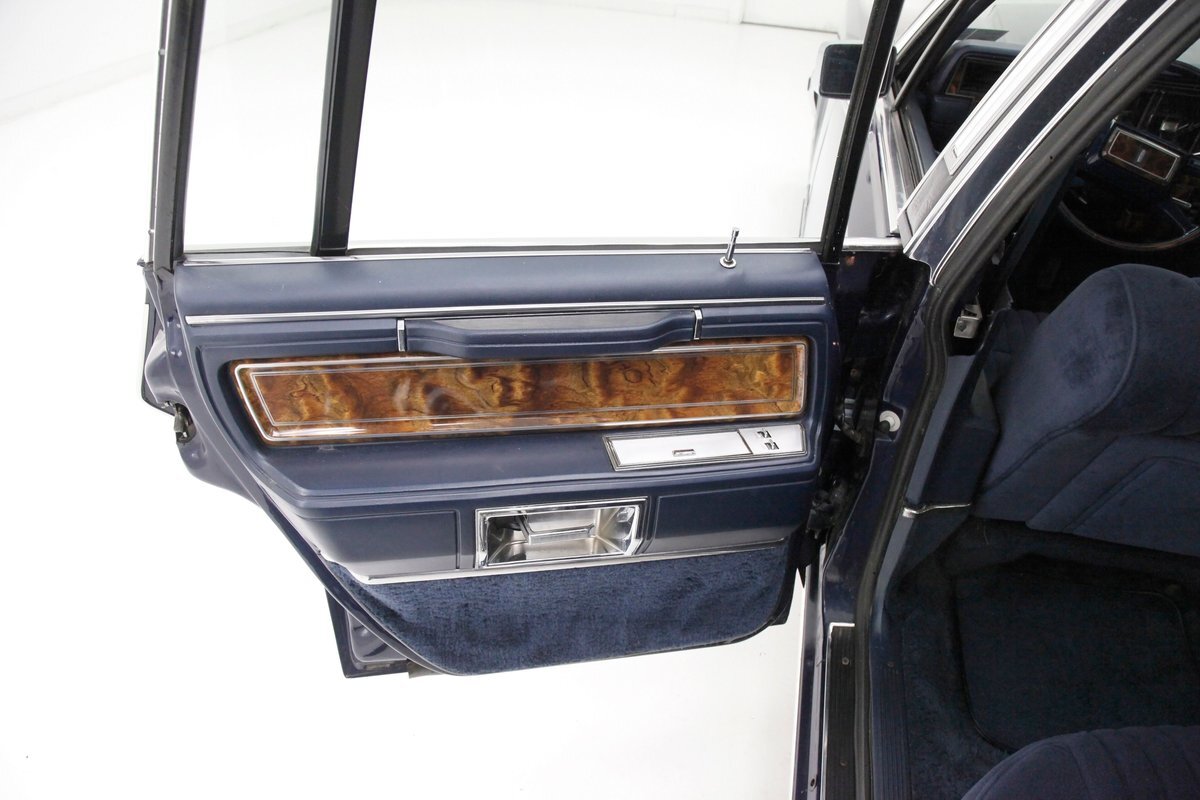 Beautiful and luxurious dark blue covers most of the interior surfaces. All controls are within the silver door panel inserts and have a wood applique background just above which adds some nice contrast to the dark blue vinyl and carpet below. Well preserved dark blue overstuffed large velour buckets are separated by a fold down armrest. If up, it could accommodate a 3rd passenger upfront. The rear bench is just as luxurious and affords plenty of legroom. The steering wheel has controls for the cruise control and on the dash is a mixture dark blue padded vinyl and faux burl surrounds the black faced analog gauges. This holds true for the radio/cassette player and climate control center. On top is padded blue vinyl and it is in very good condition. Dark blue deep pile carpeting is reserved for the floors and a new tight dark blue broadcloth headliner is above.