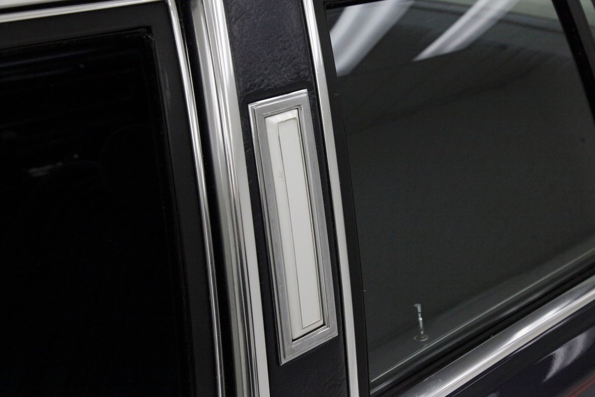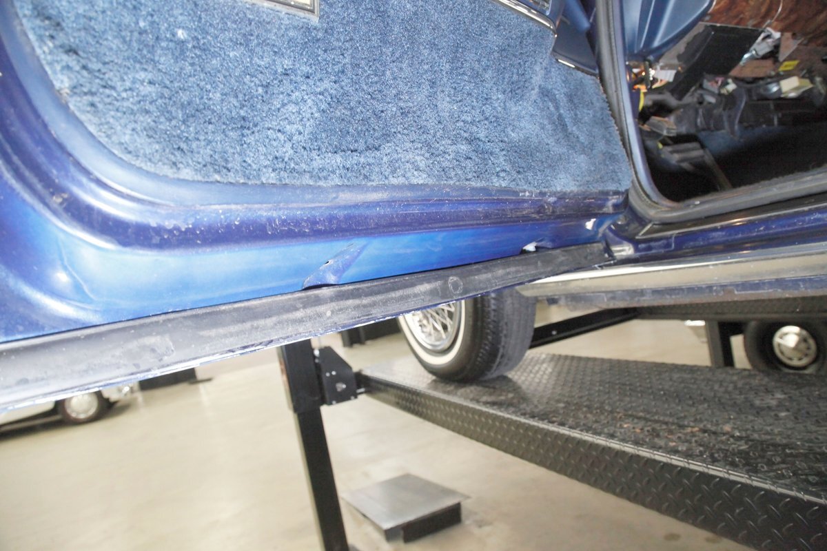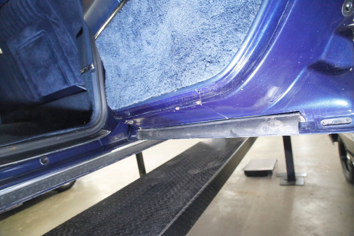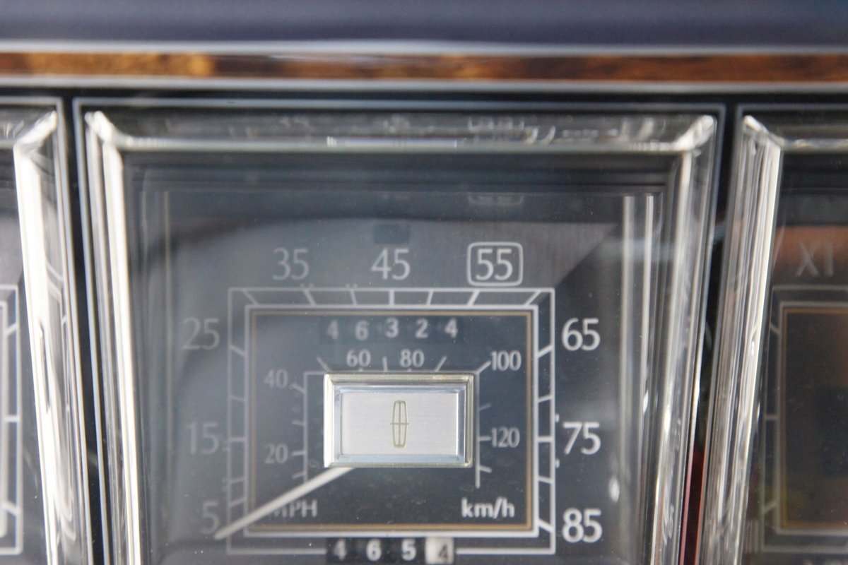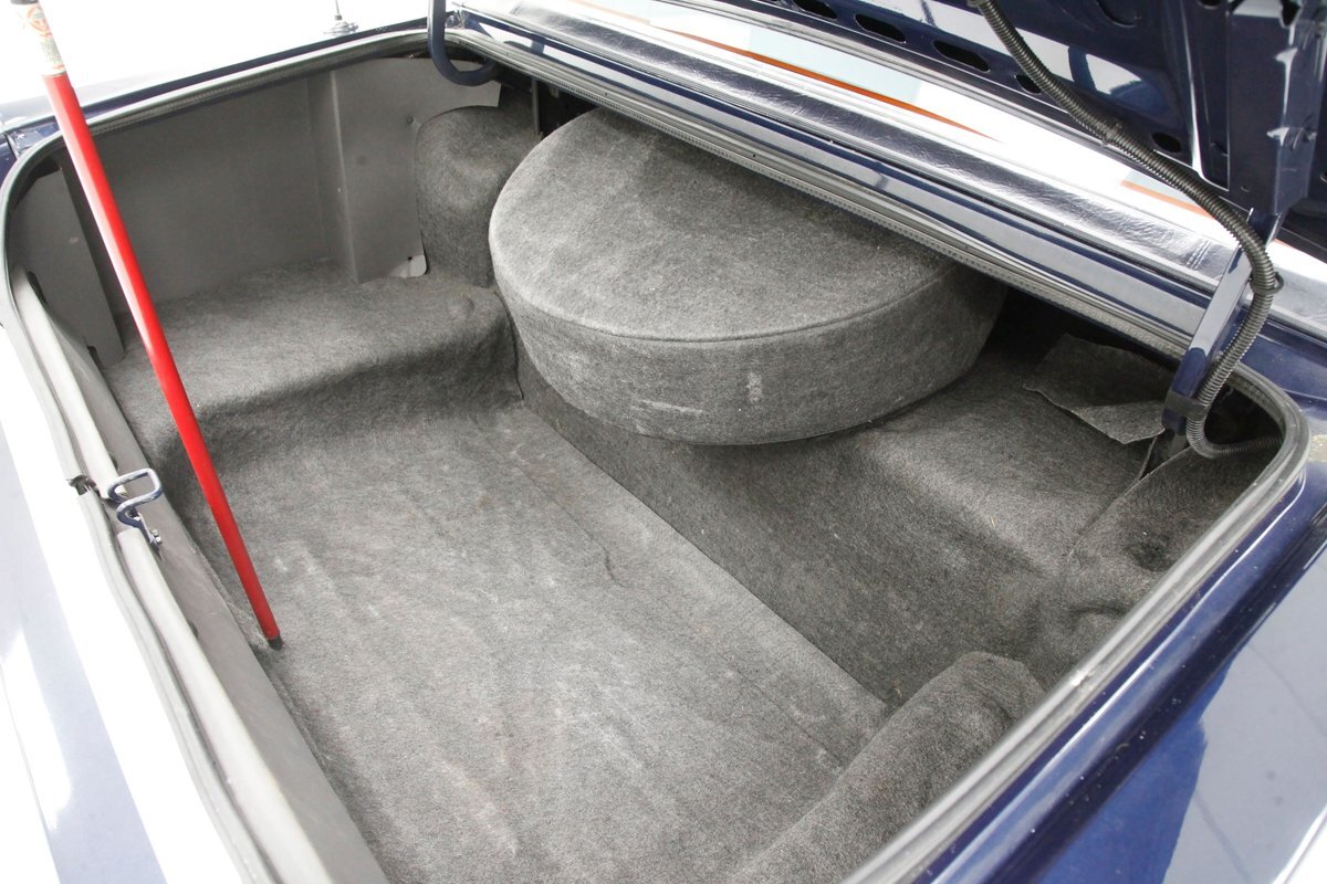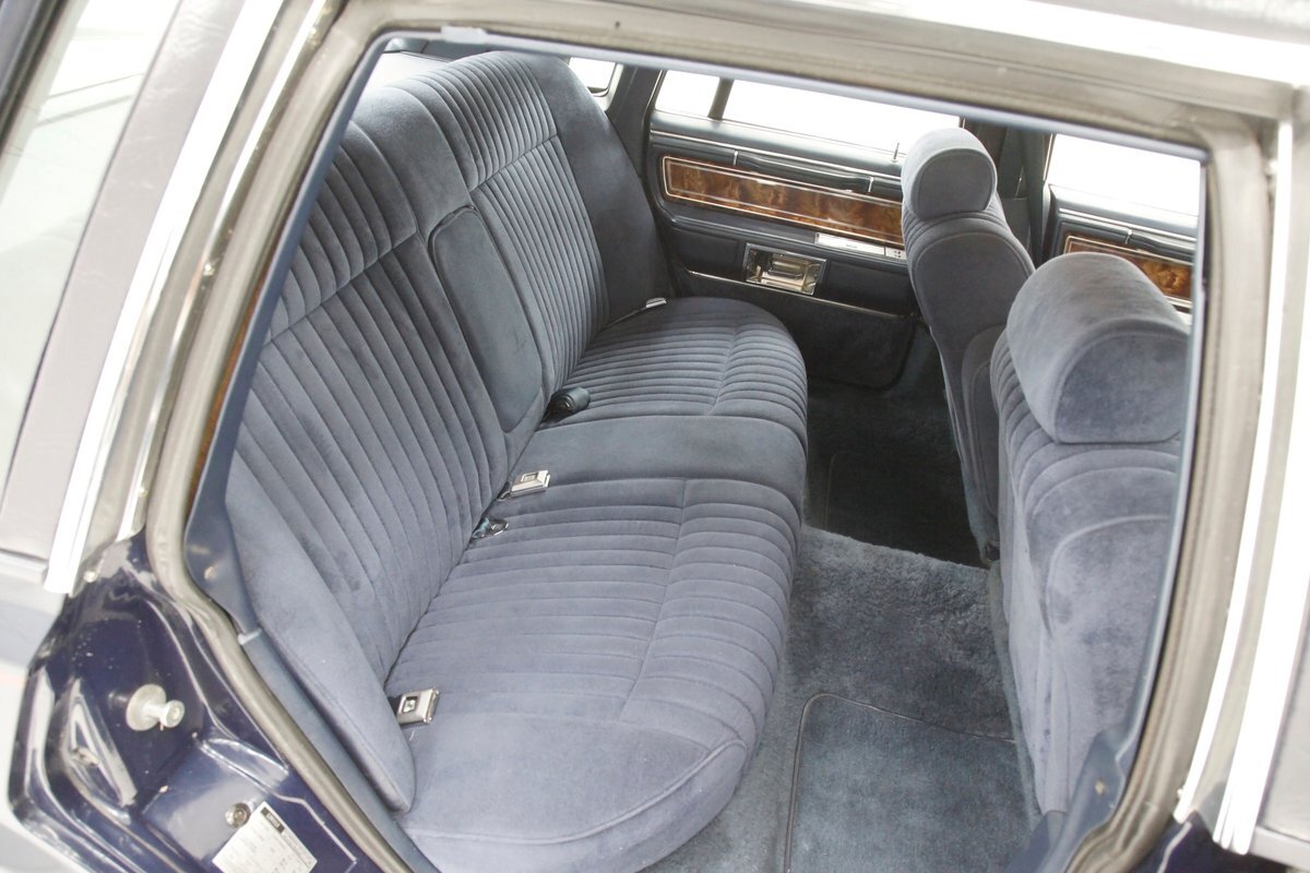 Beautiful and luxurious dark blue covers most of the interior surfaces. All controls are within the silver door panel inserts and have a wood applique background just above which adds some nice contrast to the dark blue vinyl and carpet below. Well preserved dark blue overstuffed large velour buckets are separated by a fold down armrest. If up, it could accommodate a 3rd passenger upfront. The rear bench is just as luxurious and affords plenty of legroom. The steering wheel has controls for the cruise control and on the dash is a mixture dark blue padded vinyl and faux burl surrounds the black faced analog gauges. This holds true for the radio/cassette player and climate control center. On top is padded blue vinyl and it is in very good condition. Dark blue deep pile carpeting is reserved for the floors and a new tight dark blue broadcloth headliner is above.