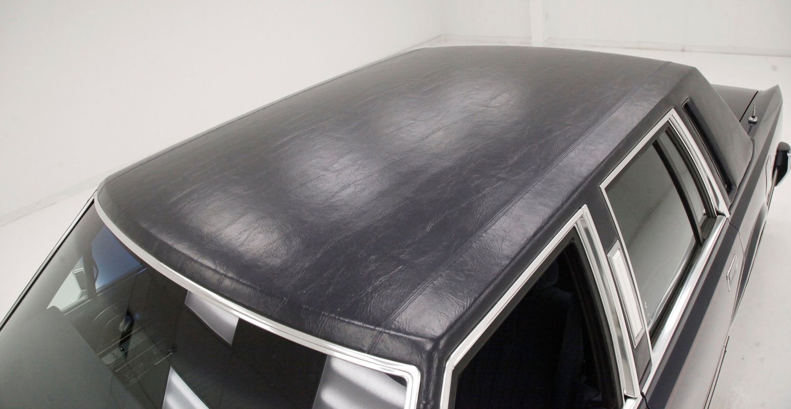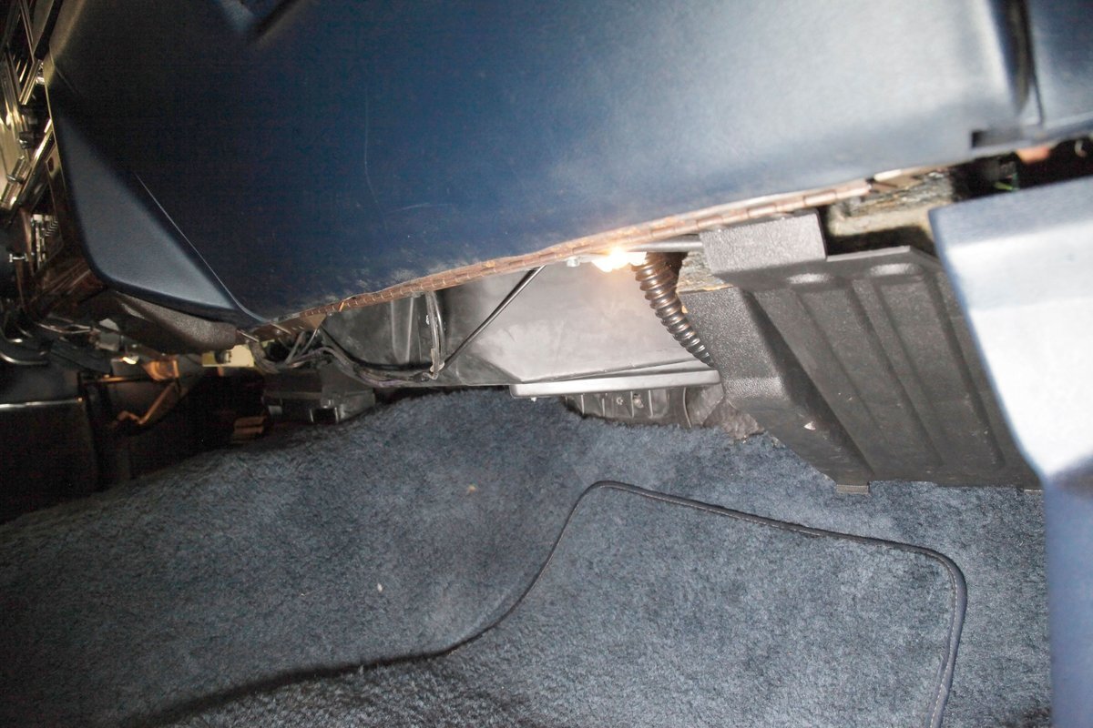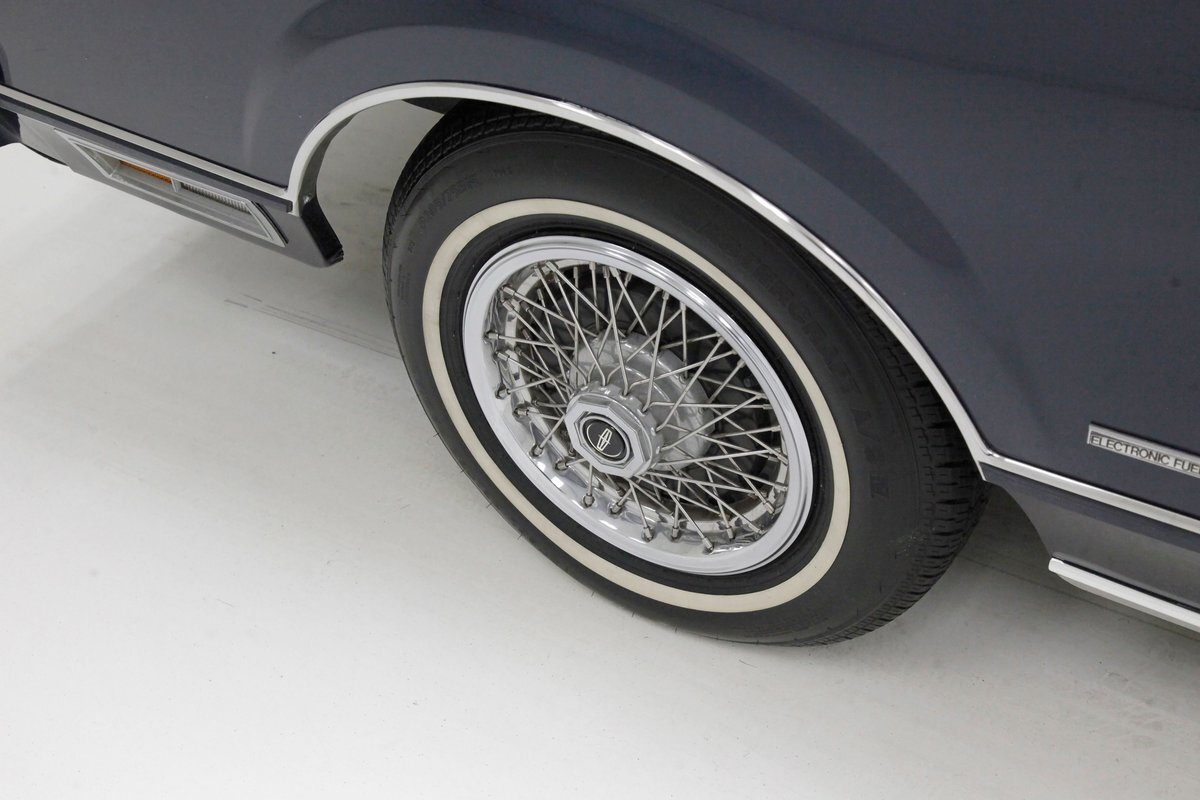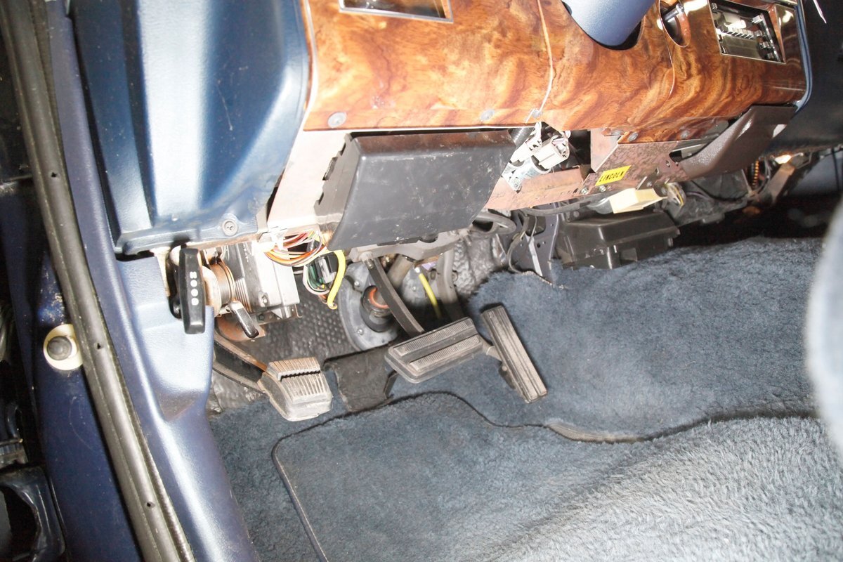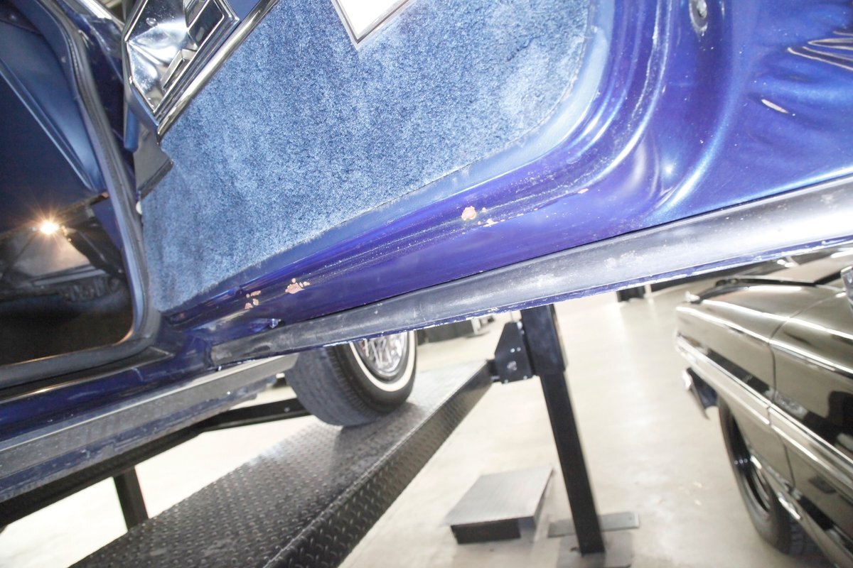 Beautiful and luxurious dark blue covers most of the interior surfaces. All controls are within the silver door panel inserts and have a wood applique background just above which adds some nice contrast to the dark blue vinyl and carpet below. Well preserved dark blue overstuffed large velour buckets are separated by a fold down armrest. If up, it could accommodate a 3rd passenger upfront. The rear bench is just as luxurious and affords plenty of legroom. The steering wheel has controls for the cruise control and on the dash is a mixture dark blue padded vinyl and faux burl surrounds the black faced analog gauges. This holds true for the radio/cassette player and climate control center. On top is padded blue vinyl and it is in very good condition. Dark blue deep pile carpeting is reserved for the floors and a new tight dark blue broadcloth headliner is above.