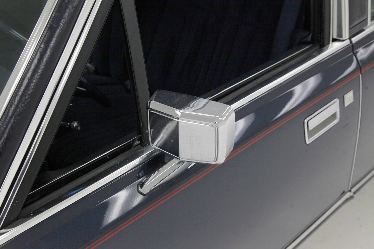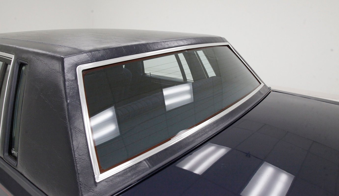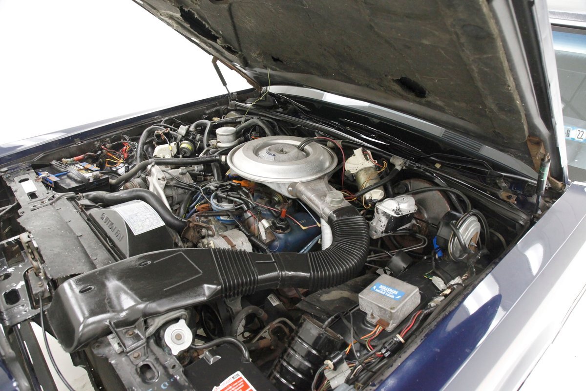 In a design that was ubiquitous in the early 1980's, straight lines are abundant. The radiator grille is rectangular in shape and has a shiny surround with vertical ribbed thin posts in the center. Dual rectangular headlights are on either side. Midnight Blue Metallic paint with some age spots, inclusions and dings are seen throughout. Also, some red pin striping shows up on the slab sided panels. Side moldings are on near the beltline, and there is some light age wear off damage to the vinyl caps that are on top of the stainless below. The roof of the passenger compartment is wrapped in dark blue vinyl and appears in very good condition. Plenty of trimmings abound within the blue field and most are in good condition adding highlighting throughout. The very squared off straight line trunk has side vertical angular tail lighting as well as some centered red light panels just below the trunk lid. Wire wheels covers are on all 4 corners and present nicely wrapped in thin white wall radials dating from 2015.