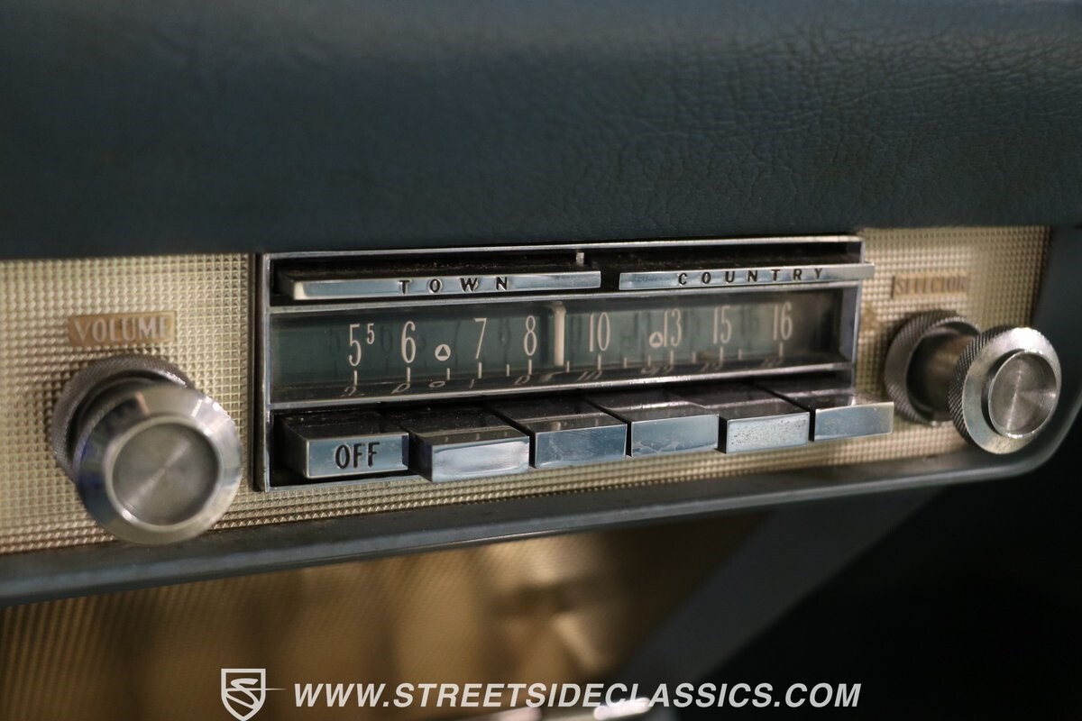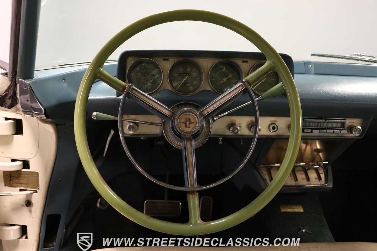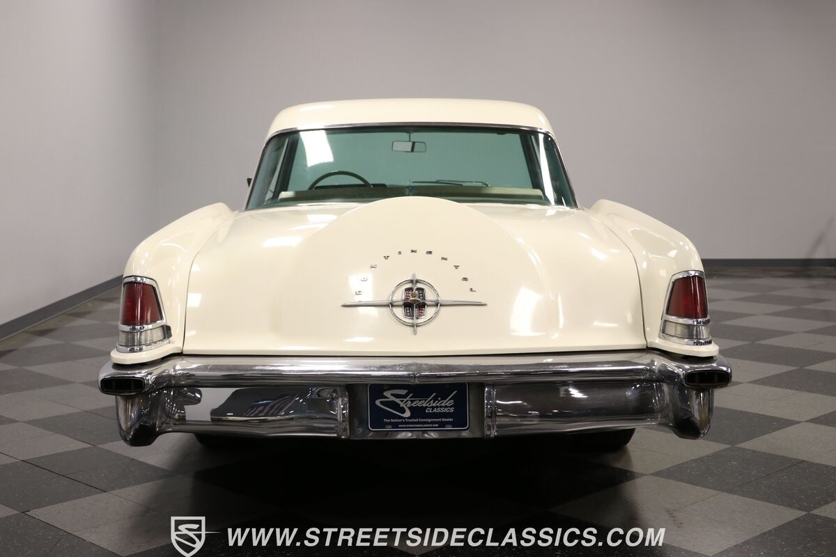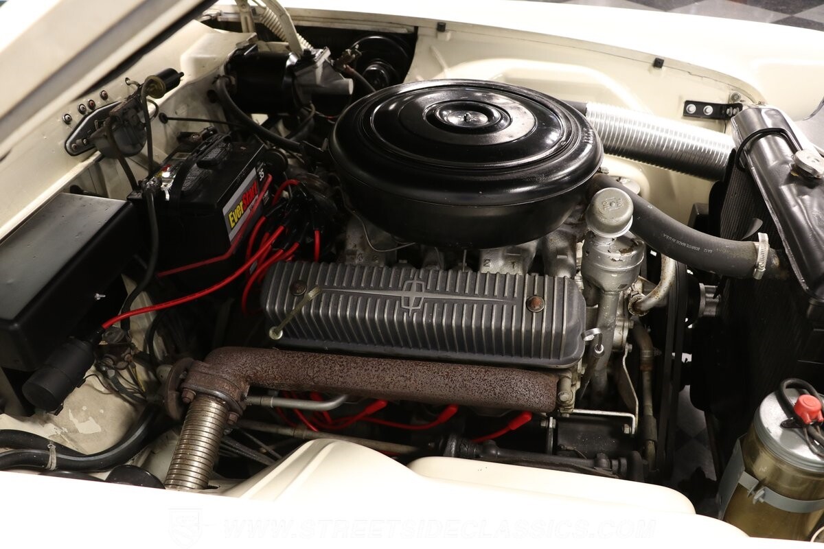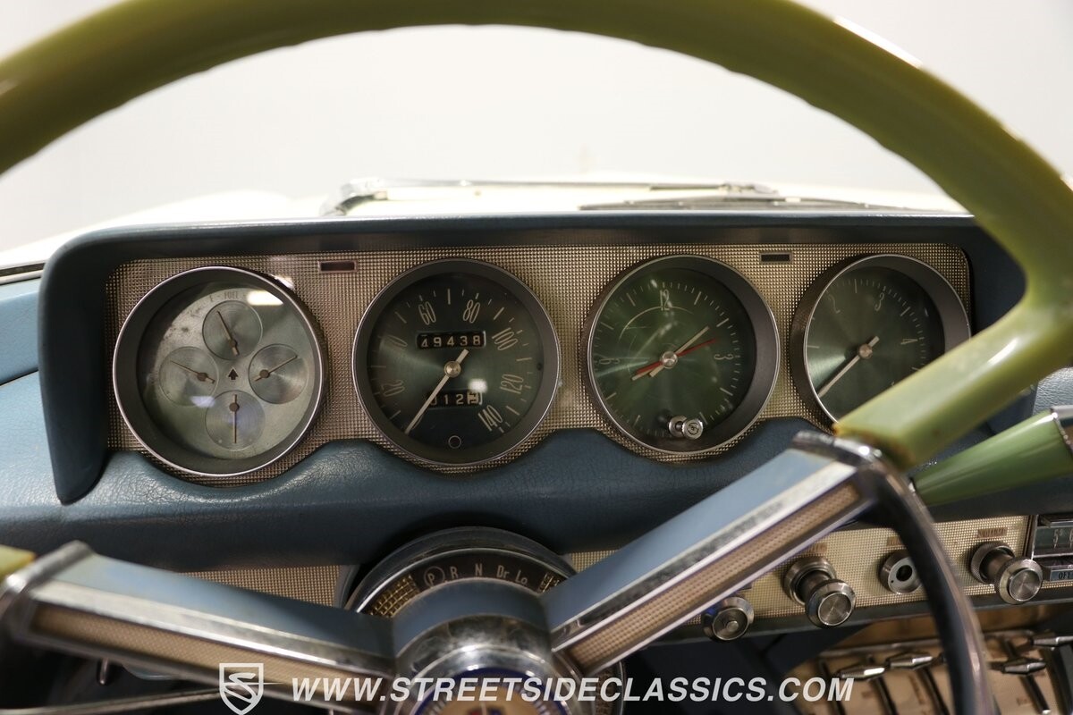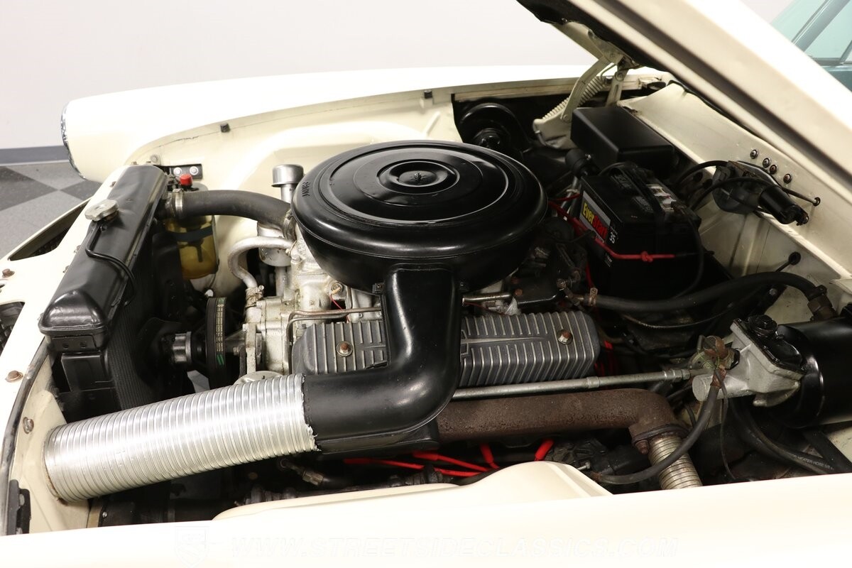 The light blue and white interior is a unique and beautiful combination that nicely coordinates with the seats, carpeting, door panels, and headliner to create a beautifully uniform appearance. It's hard to find anything of note that has been replaced over the decades, and we think that's a good thing. So while you may decide to update elements of this car, we like having plenty of originality here so you can choose what should be updated and what should represent the Eisenhower administration. The instrument panel was influenced by both aircraft and clocks. It has wonderfully detailed dials and levers for the heater controls, making for a unique driving experience. Beyond the intricate factory wheel is a full gauge panel with a tachometer. It's a highly original presentation with terrific luxuries for its era, like the AM radio and a power seat.