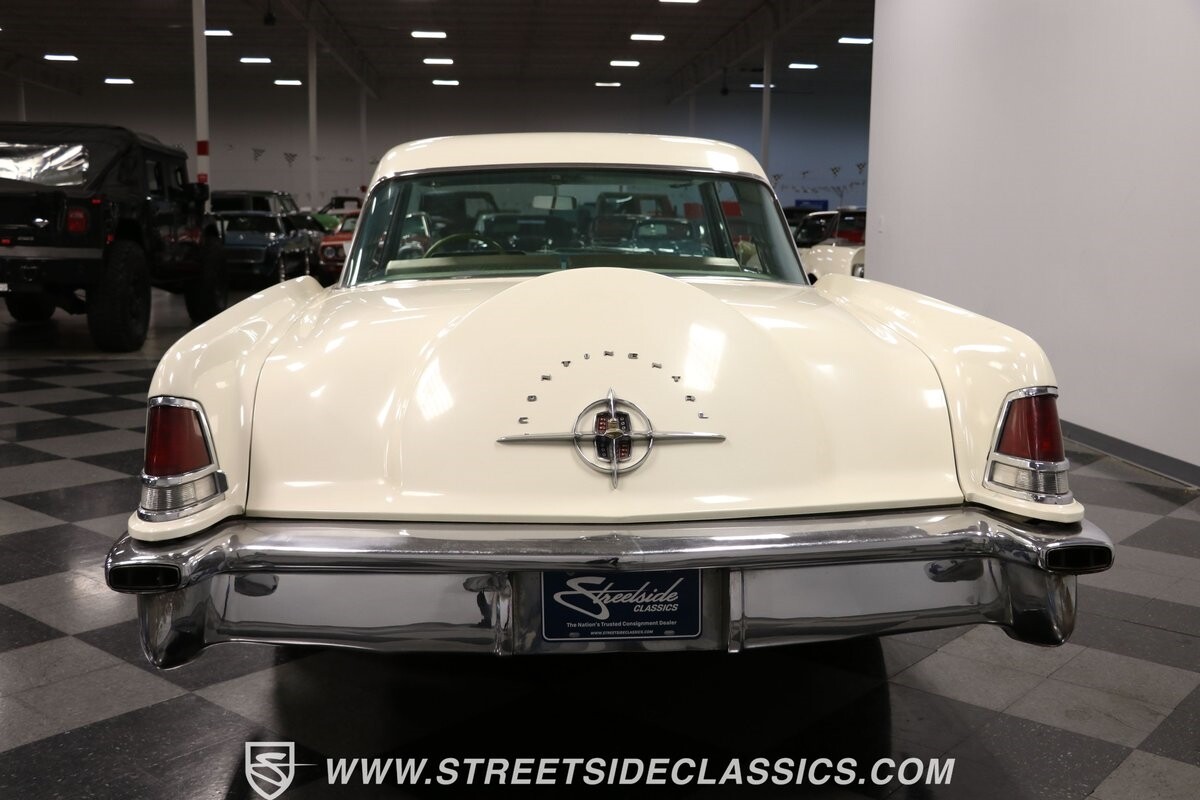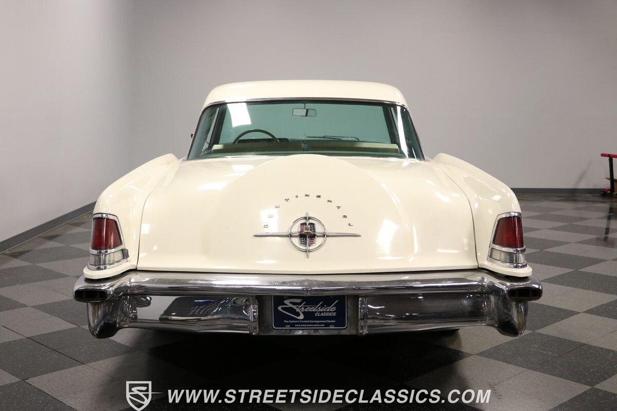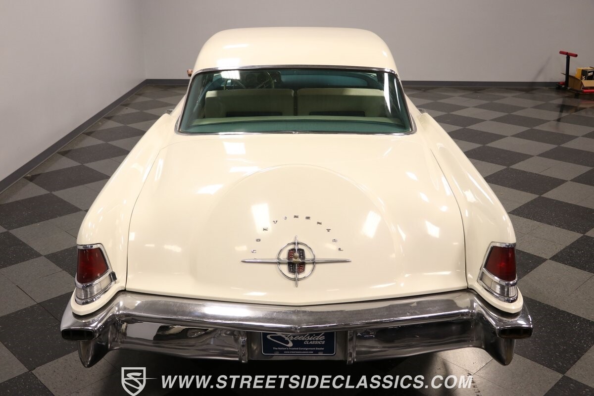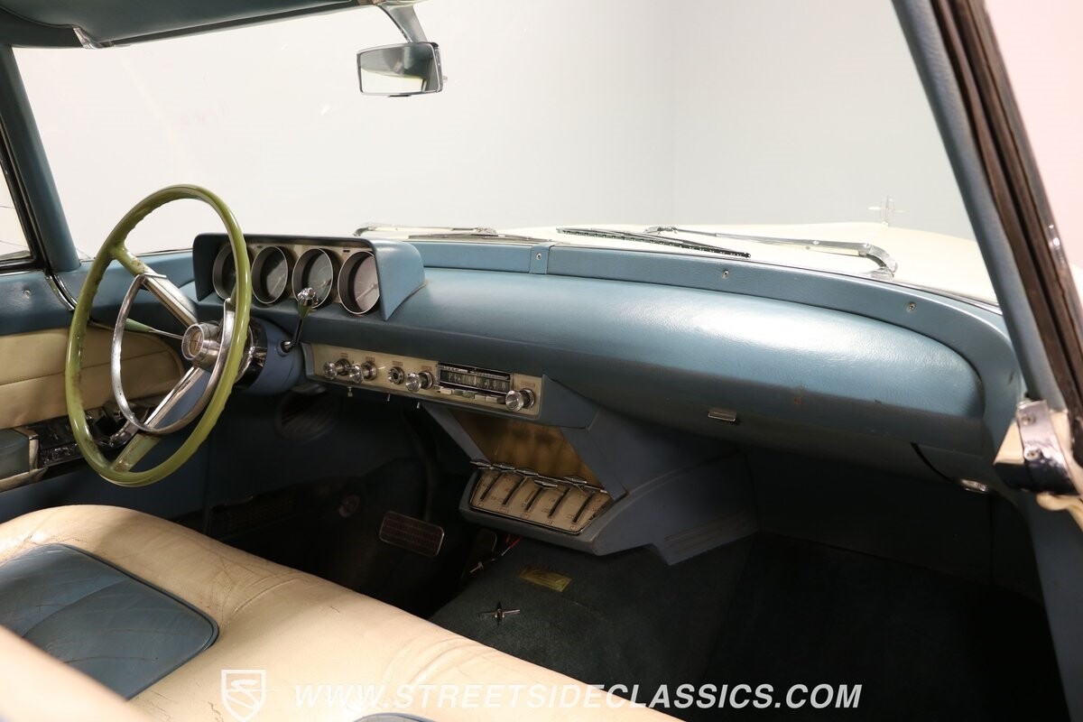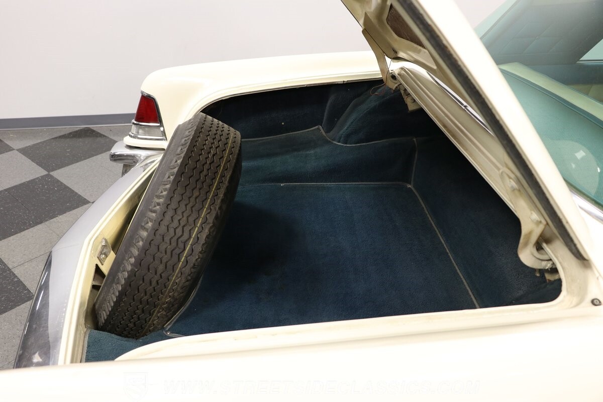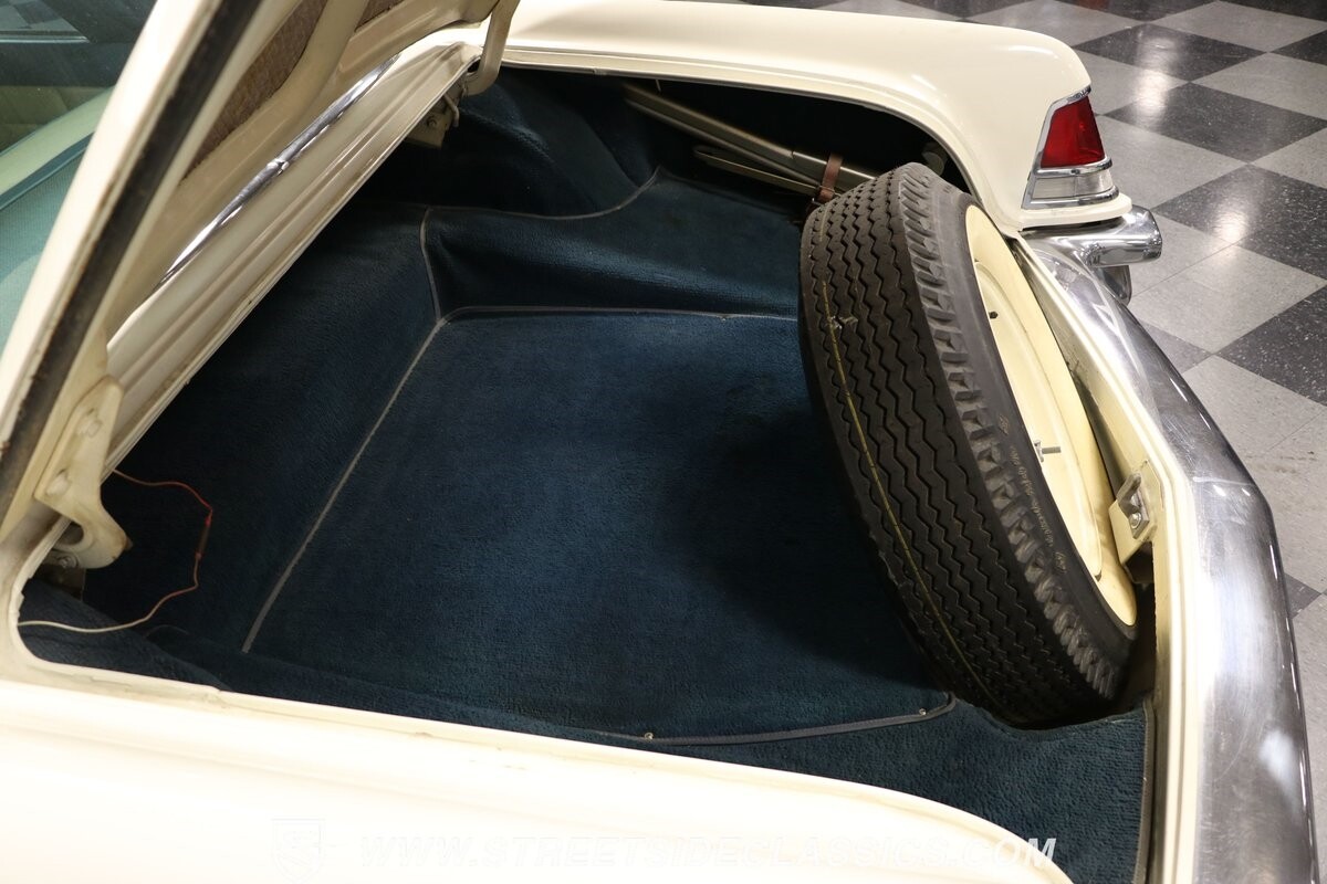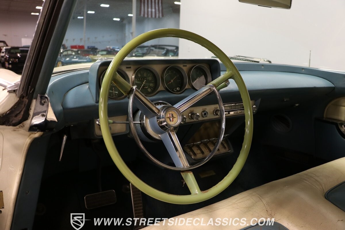 The light blue and white interior is a unique and beautiful combination that nicely coordinates with the seats, carpeting, door panels, and headliner to create a beautifully uniform appearance. It's hard to find anything of note that has been replaced over the decades, and we think that's a good thing. So while you may decide to update elements of this car, we like having plenty of originality here so you can choose what should be updated and what should represent the Eisenhower administration. The instrument panel was influenced by both aircraft and clocks. It has wonderfully detailed dials and levers for the heater controls, making for a unique driving experience. Beyond the intricate factory wheel is a full gauge panel with a tachometer. It's a highly original presentation with terrific luxuries for its era, like the AM radio and a power seat.