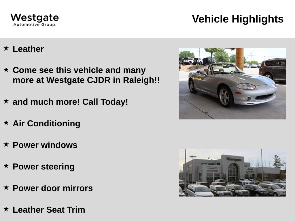 Leather, Come see this vehicle and many more at Westgate CJDR in Raleigh!!, and much more! Call Today!, Air Conditioning, Alloy wheels, Front Bucket Seats, Leather Seat Trim, Power door mirrors, Power steering, Power windows.