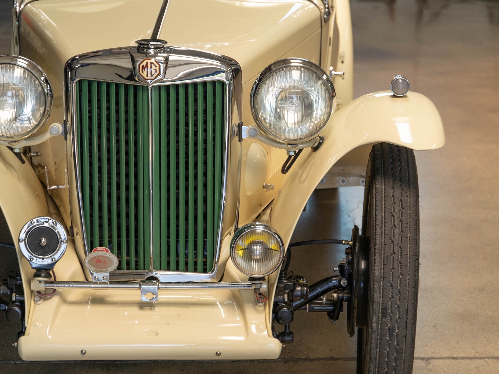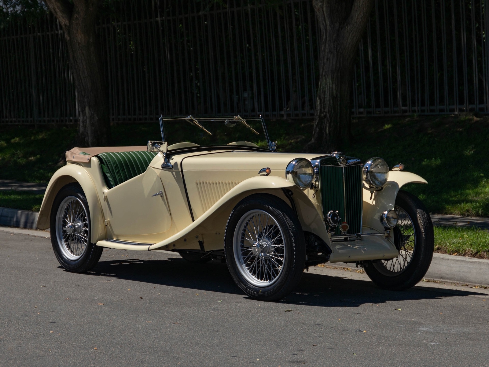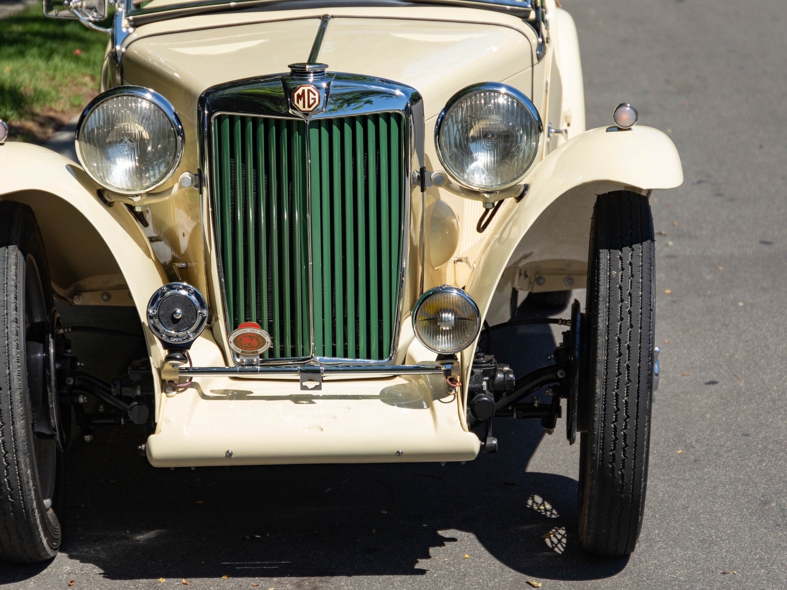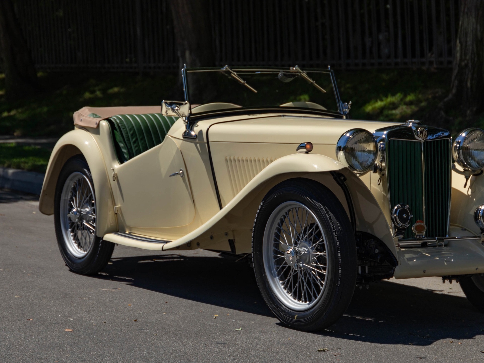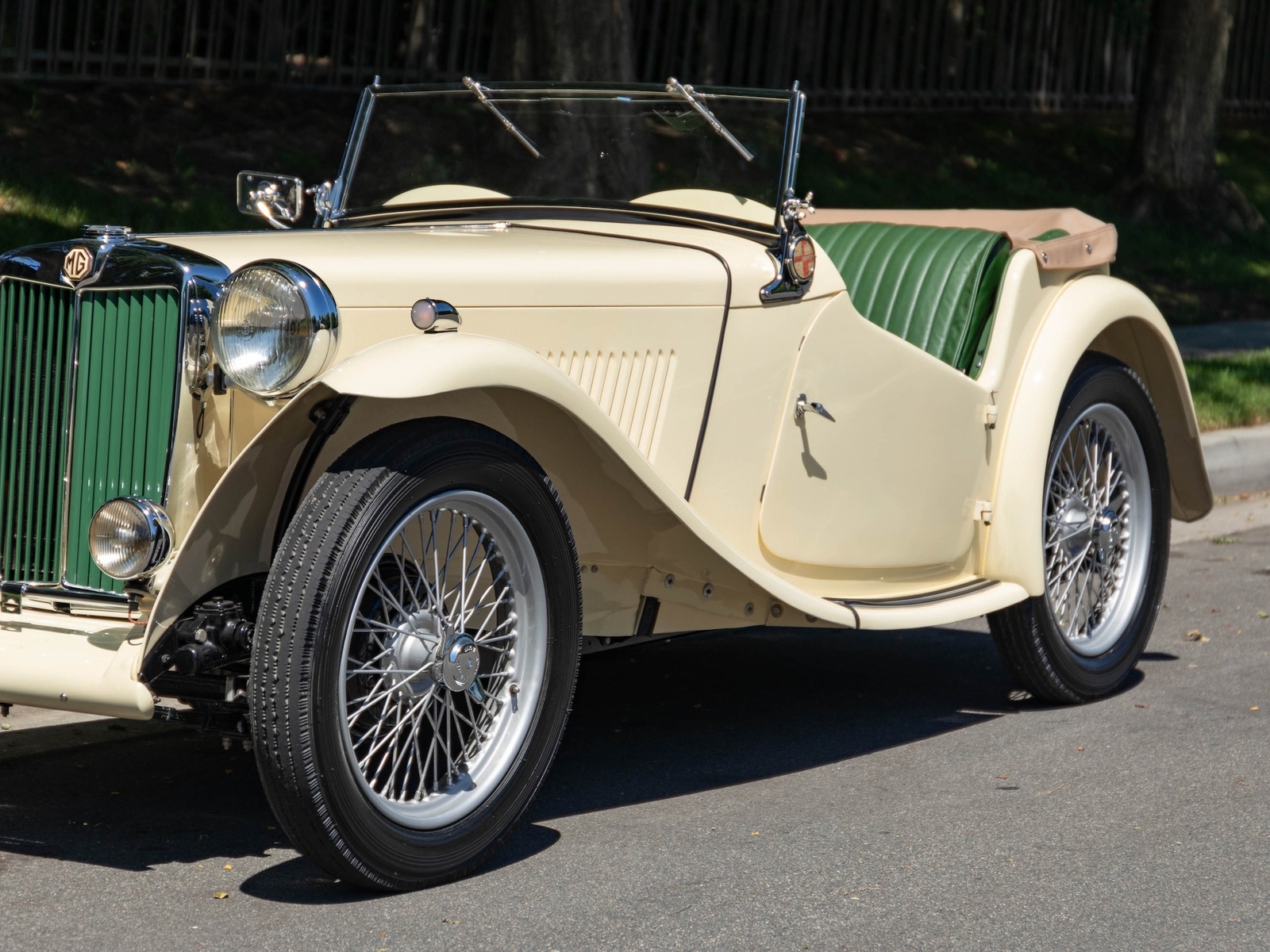This 1948 MG TC, chassis TC4881, benefits handsomely from a well-maintained, nut-and-bolt restoration. Featuring glossy 'Sequoia Cream' paint over supple 'Shires Green' upholstery, it retains its original XPAG 1,250 cc engine and correct mechanicals, plus excellent ash wooden body framing and a clean undercarriage. Period-correct accessories include proper Lucas lamps, signals and hardware, a matching canvas full cab and side curtains. In addition to an instruction manual, this high-quality TC is accompanied by correct tools including a restored jack plus an auxiliary starting crank and Thor wheel hammer.