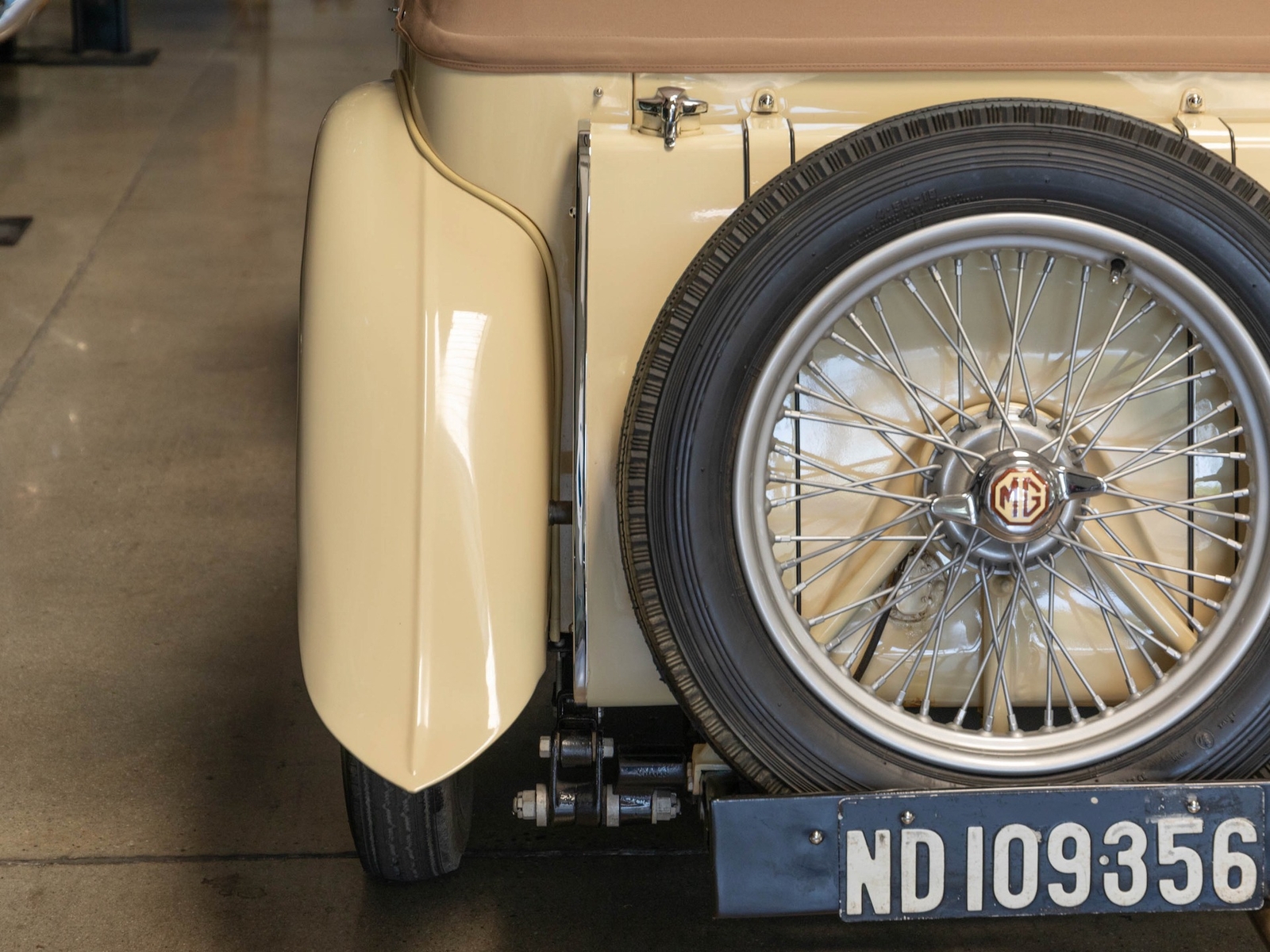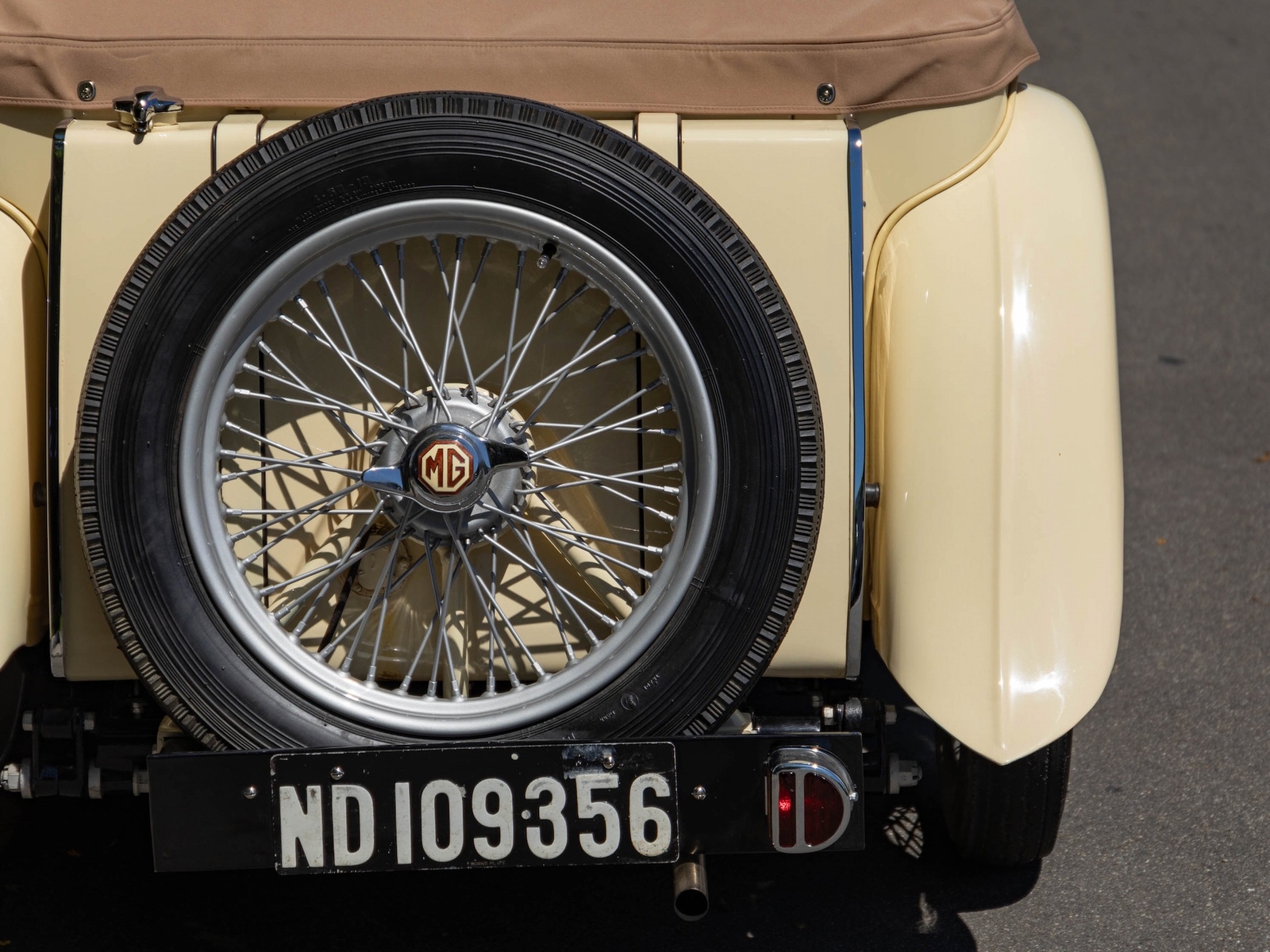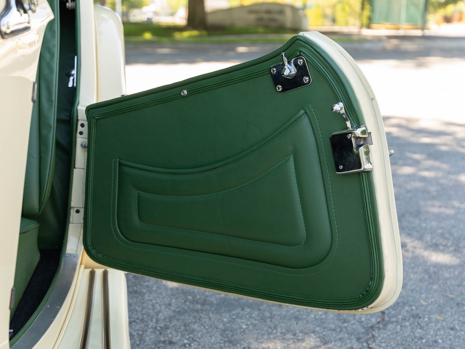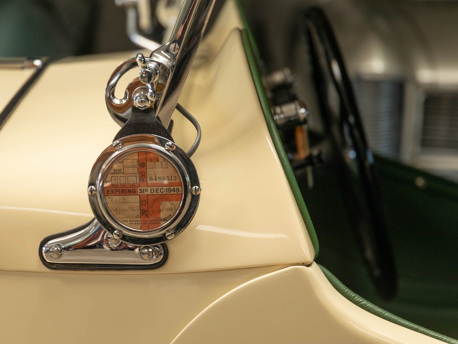 This 1948 MG TC, chassis TC4881, benefits handsomely from a well-maintained, nut-and-bolt restoration. Featuring glossy 'Sequoia Cream' paint over supple 'Shires Green' upholstery, it retains its original XPAG 1,250 cc engine and correct mechanicals, plus excellent ash wooden body framing and a clean undercarriage. Period-correct accessories include proper Lucas lamps, signals and hardware, a matching canvas full cab and side curtains. In addition to an instruction manual, this high-quality TC is accompanied by correct tools including a restored jack plus an auxiliary starting crank and Thor wheel hammer.
