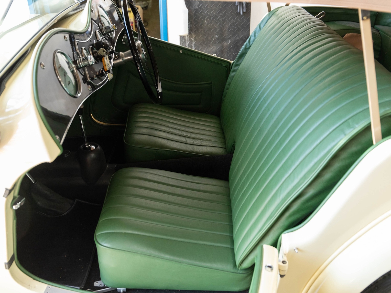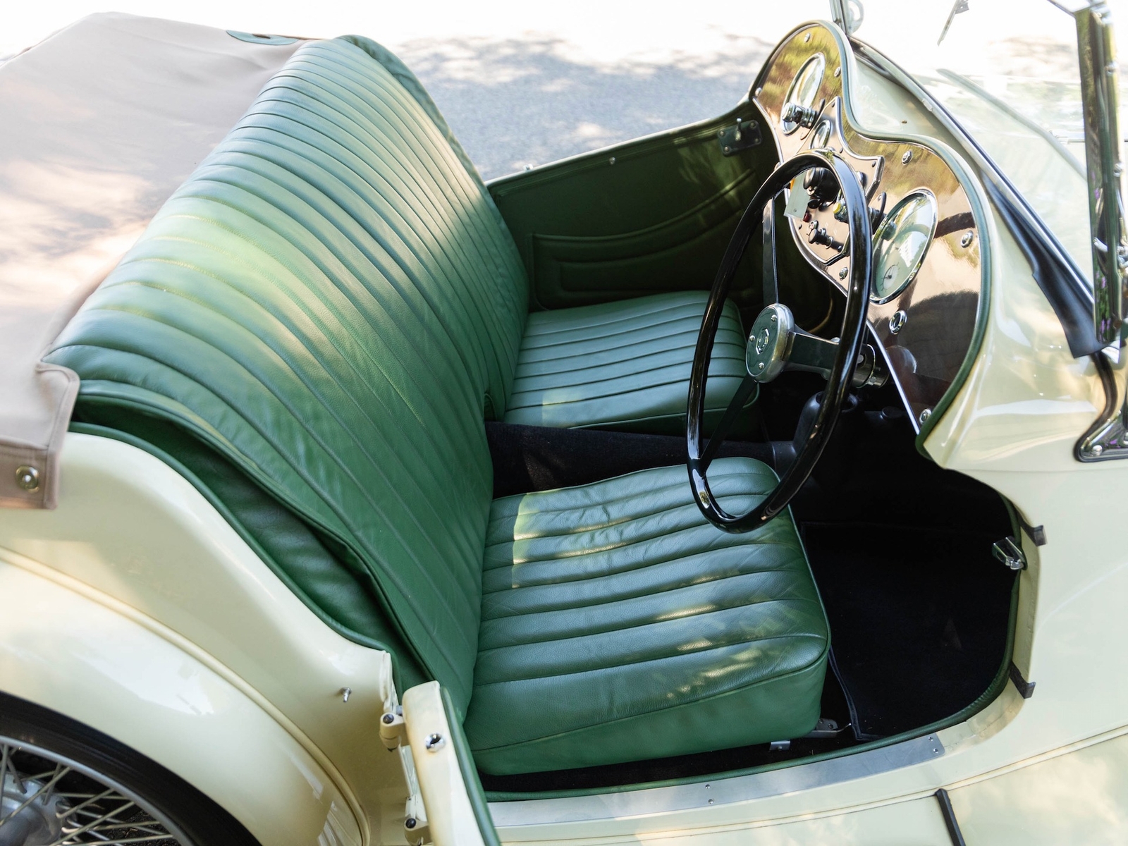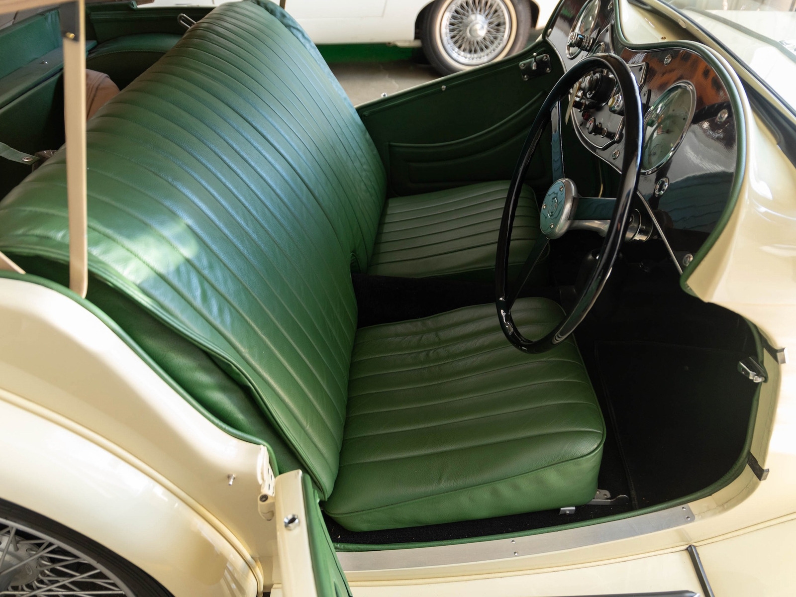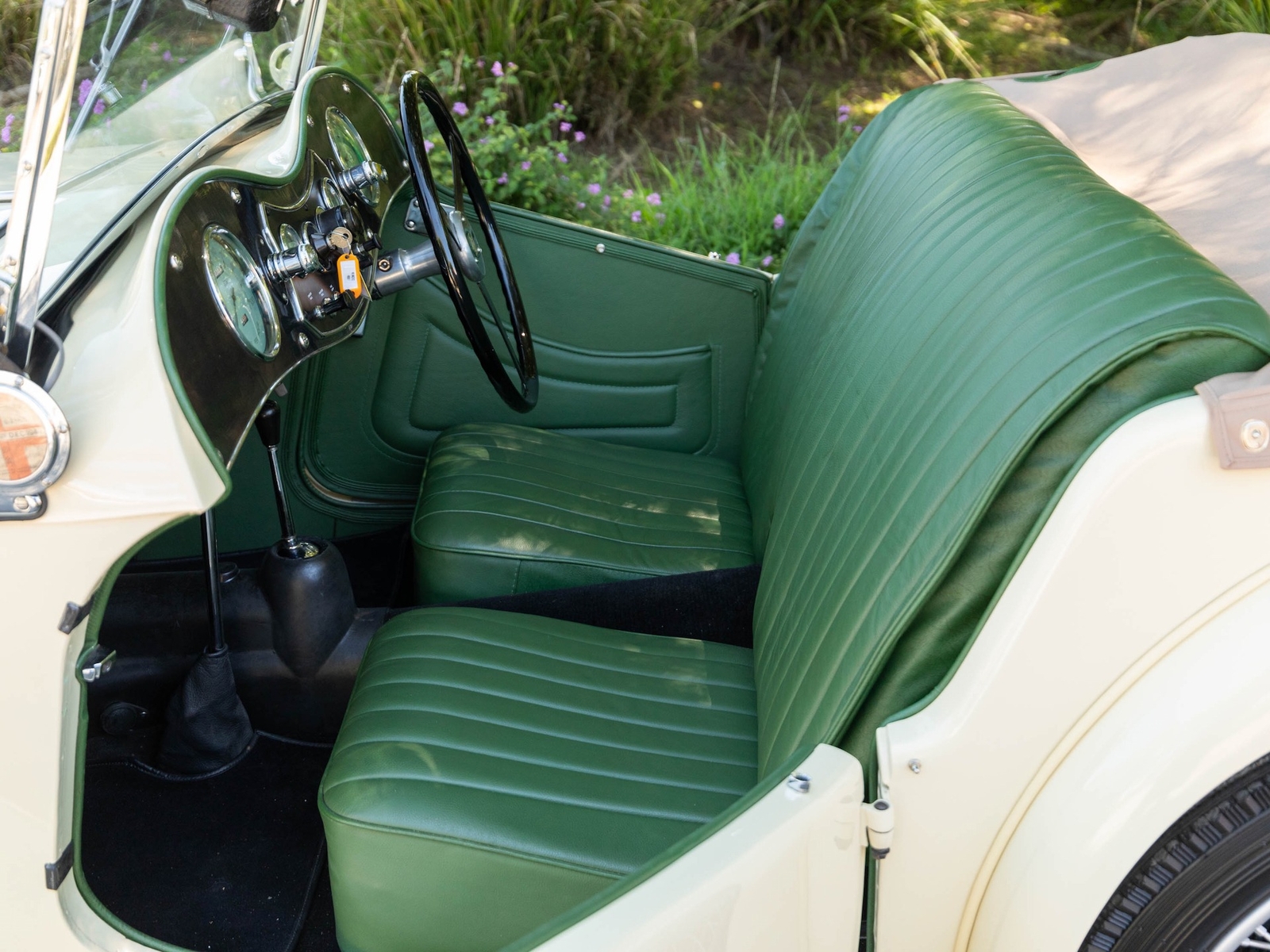 The offered TC looks every bit the British sports car that it should and has clearly had the benefit of a considerable no expense spared refurbishment both prior to and within the previous ownership. The extraordinarily striking and lesser seen hue of 'Sequoia Cream', which is both handsome and very appealing. Providing aesthetic contrast is a 'Shires Green' leather interior which has evidently been renewed to an equally high standard, and the large wire wheels are finished in silver and shod with period style Blockley tires and the interior is completed with the plethora of chrome trim, from radiator to windshield and lamps, and dashboard instrumentation.