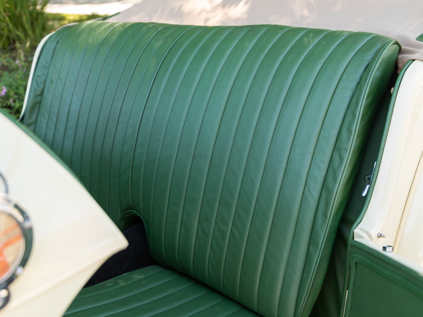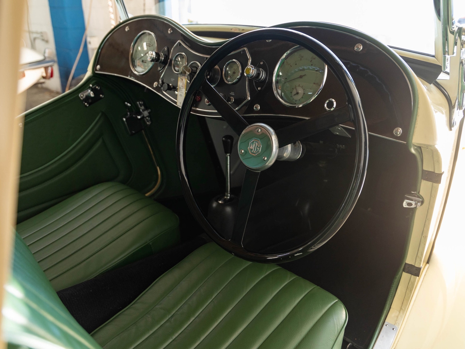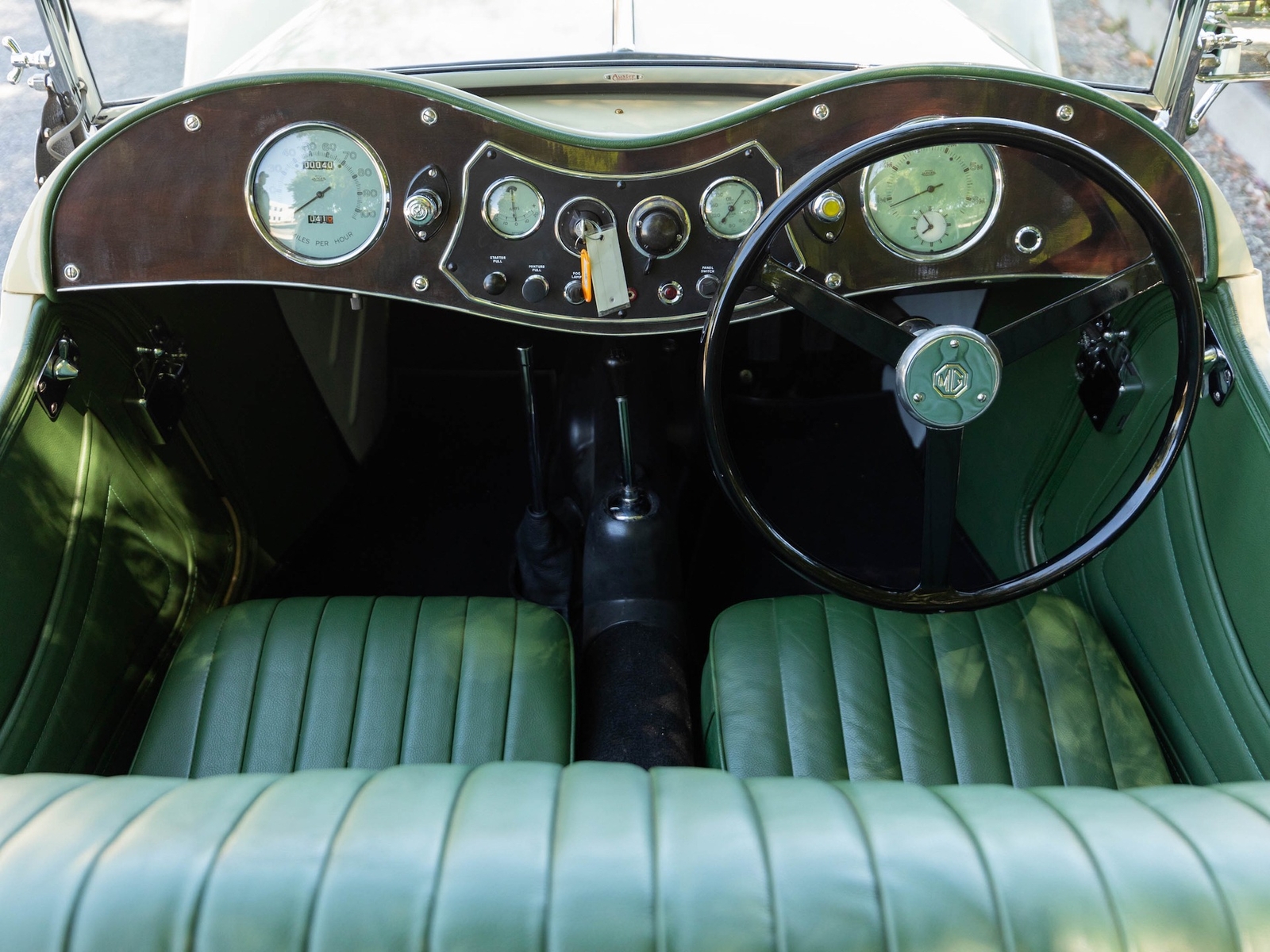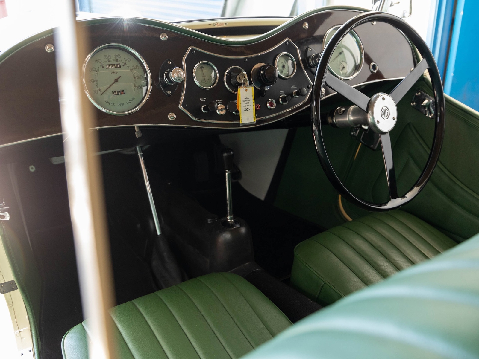 The offered TC looks every bit the British sports car that it should and has clearly had the benefit of a considerable no expense spared refurbishment both prior to and within the previous ownership. The extraordinarily striking and lesser seen hue of 'Sequoia Cream', which is both handsome and very appealing. Providing aesthetic contrast is a 'Shires Green' leather interior which has evidently been renewed to an equally high standard, and the large wire wheels are finished in silver and shod with period style Blockley tires and the interior is completed with the plethora of chrome trim, from radiator to windshield and lamps, and dashboard instrumentation.