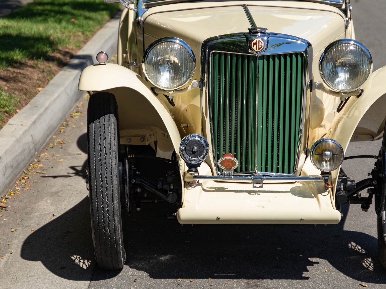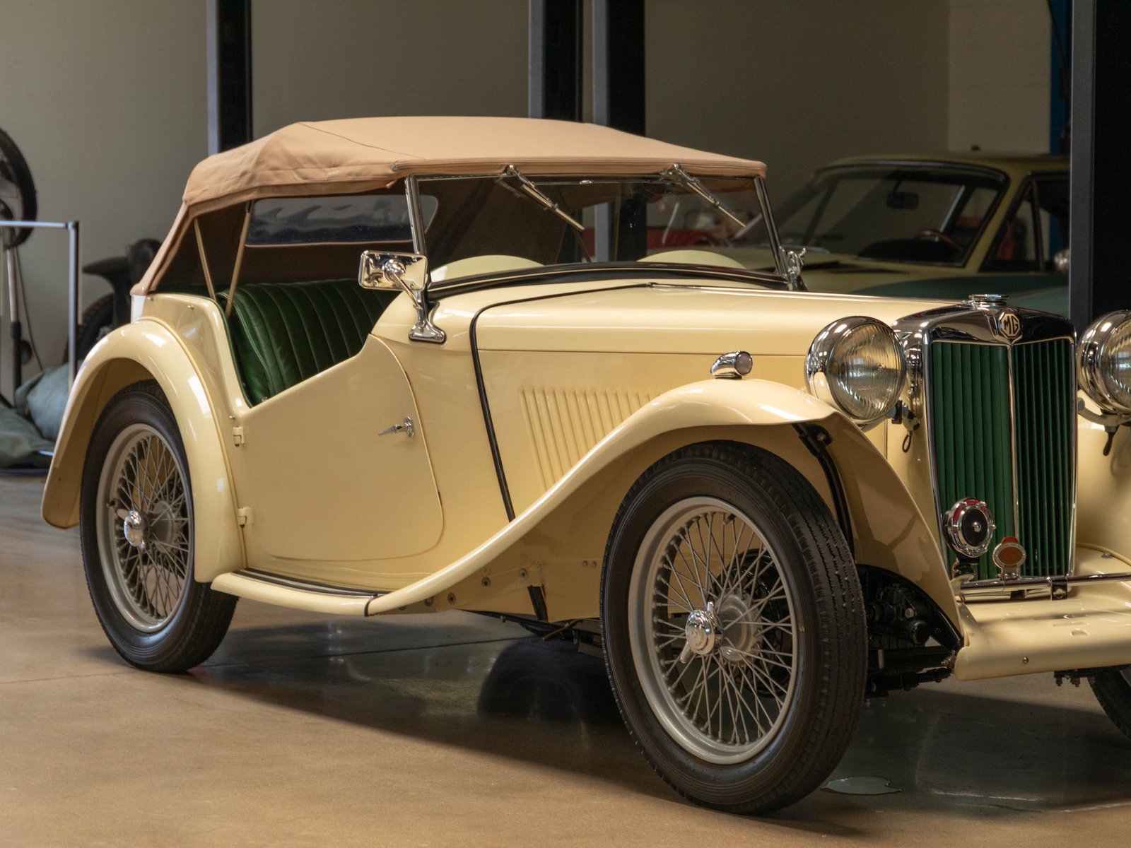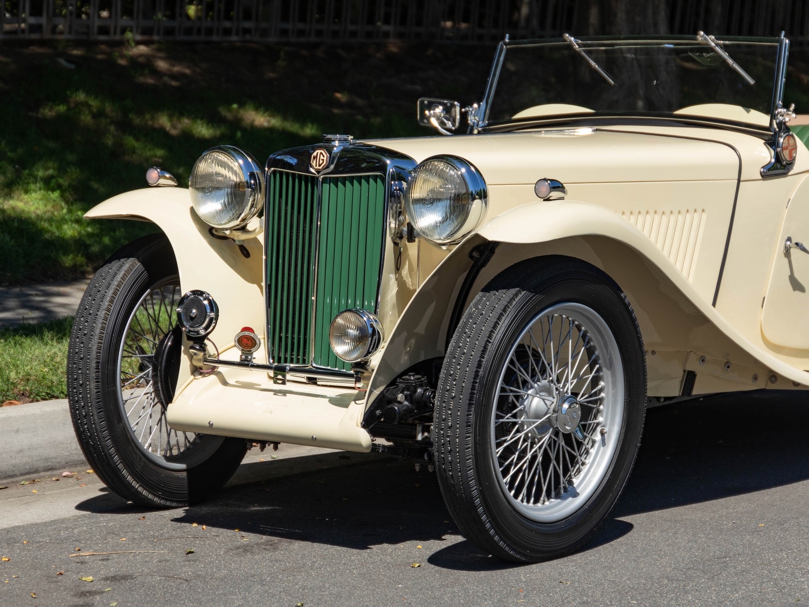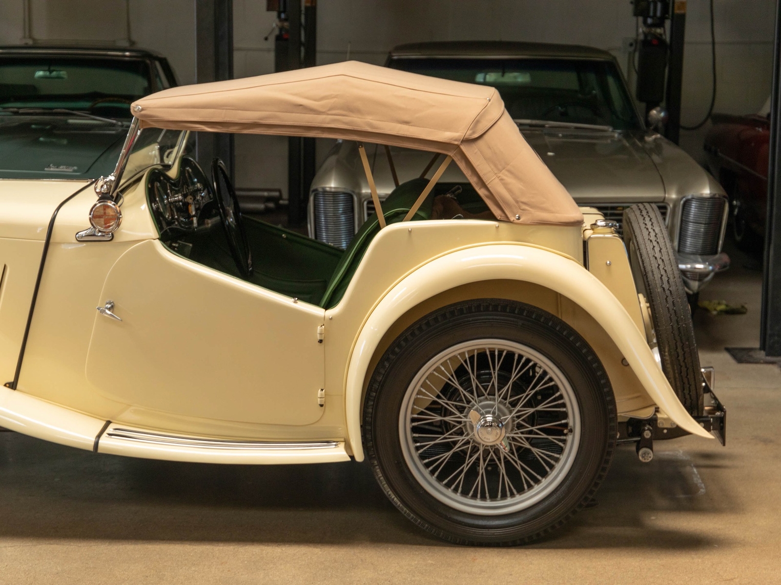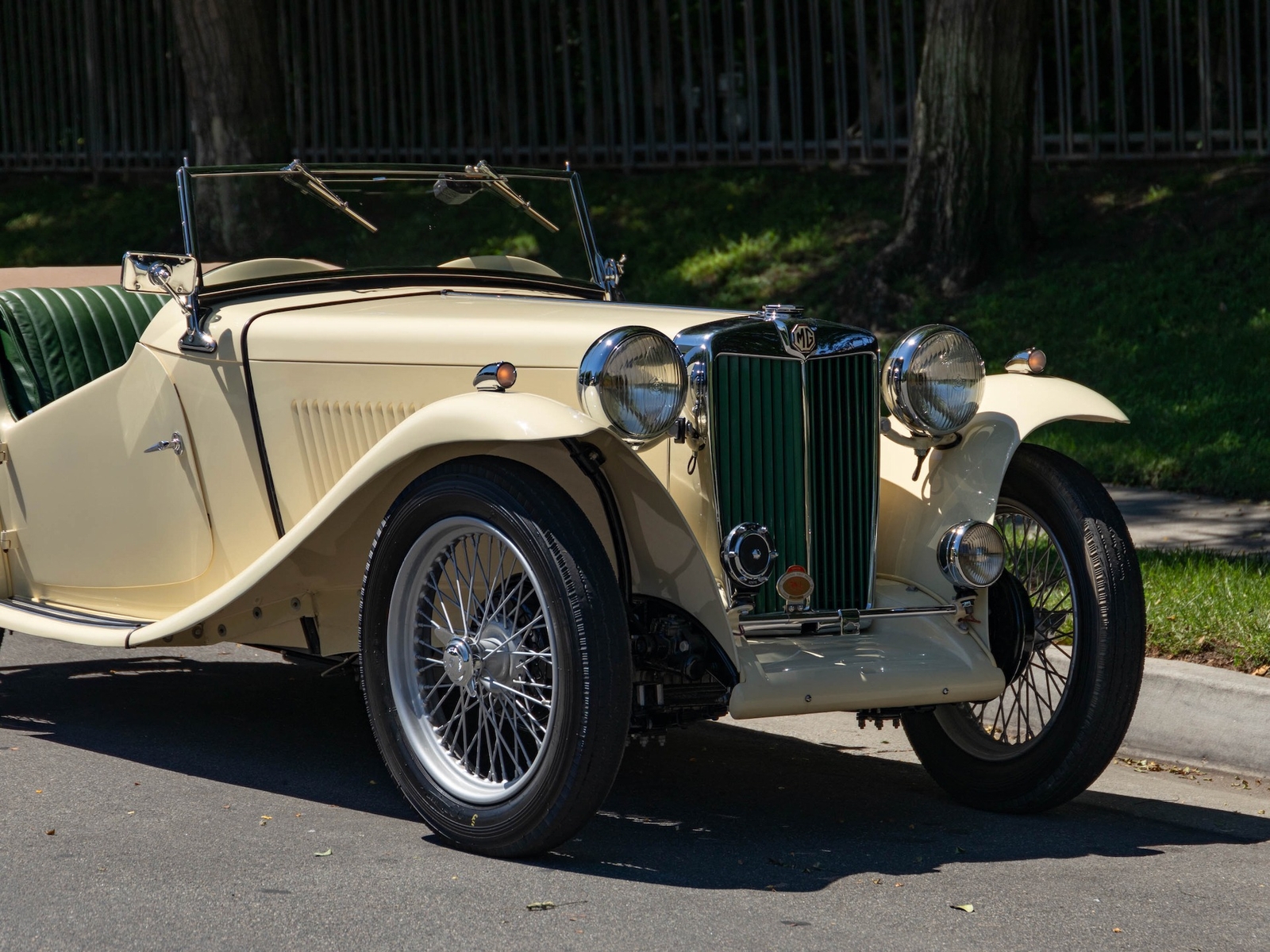 Riding on correct painted wire wheels with period style 4.50-19 Blockley tires, this 1948 MG TC is a wonderful example of one of the worlds all-time most important sports cars and an archetypal prewar British sports car design that carried over into the postwar period. The TC was built between 1945-49 and was the primary influence in turning Americans onto European sports cars. It has since achieved rare 'Milestone' status and with its classic lines, freestanding headlamps, upright radiator shell, sweeping front fenders, rakish cutaway doors, fold down windshield, abbreviated tail which houses the fuel tank and spare tire, and 19" diameter wire wheels with knock off hubs.