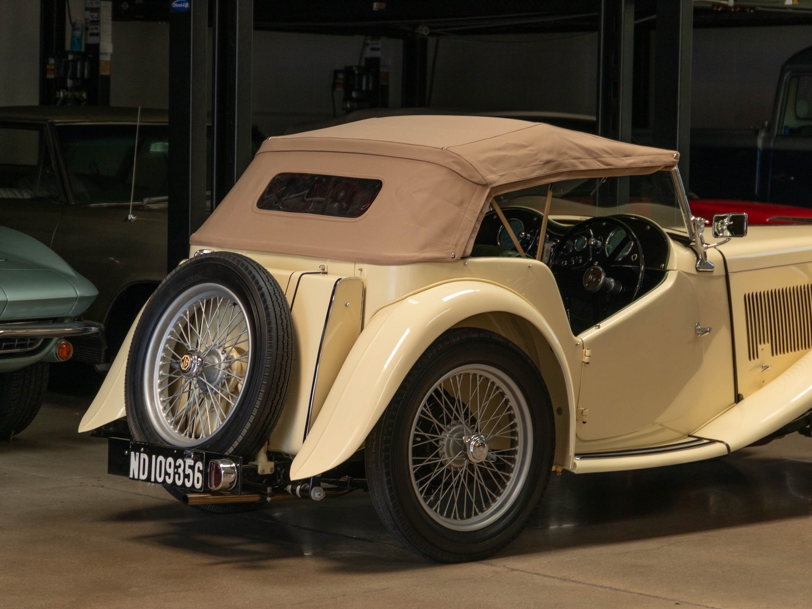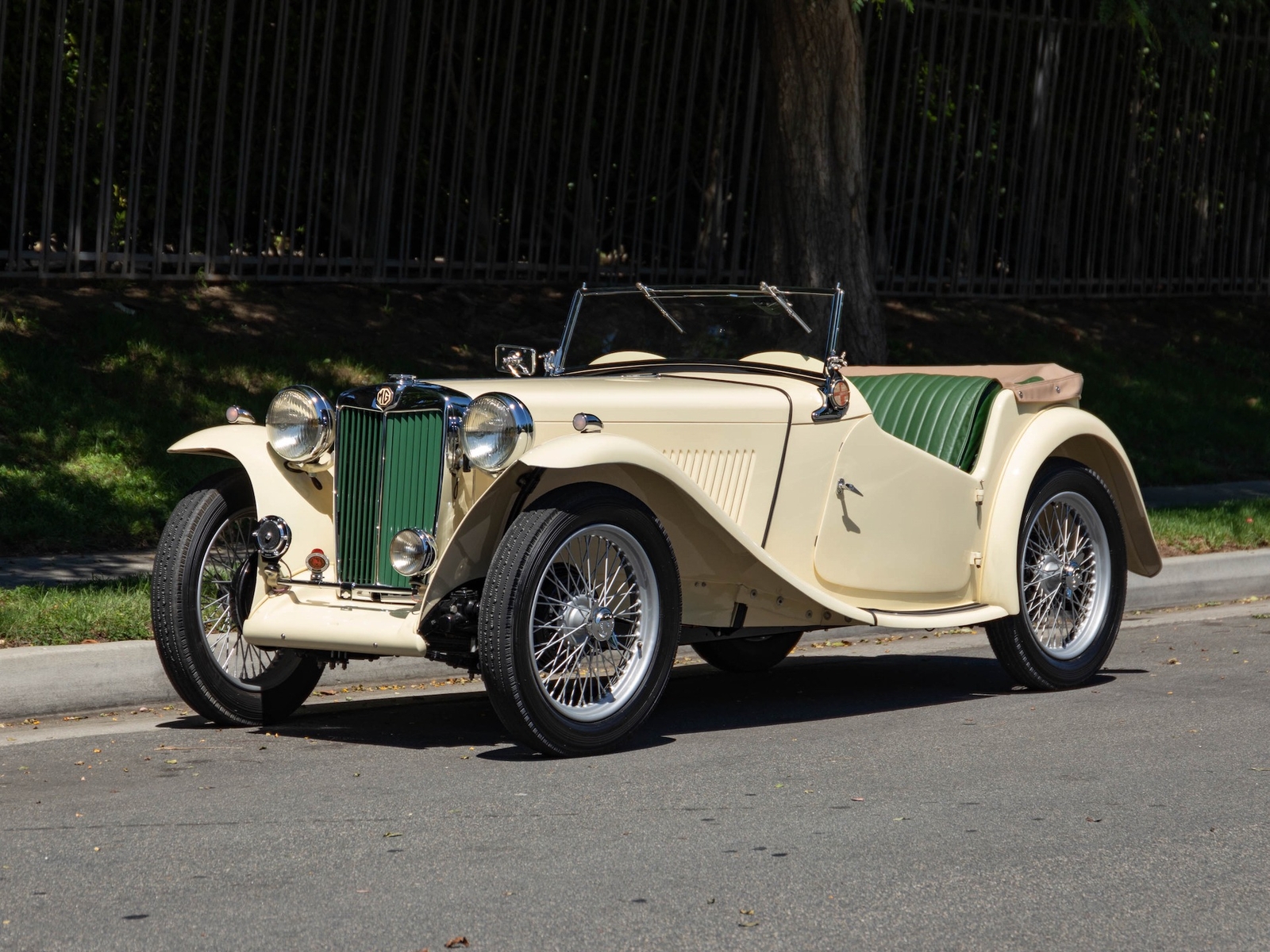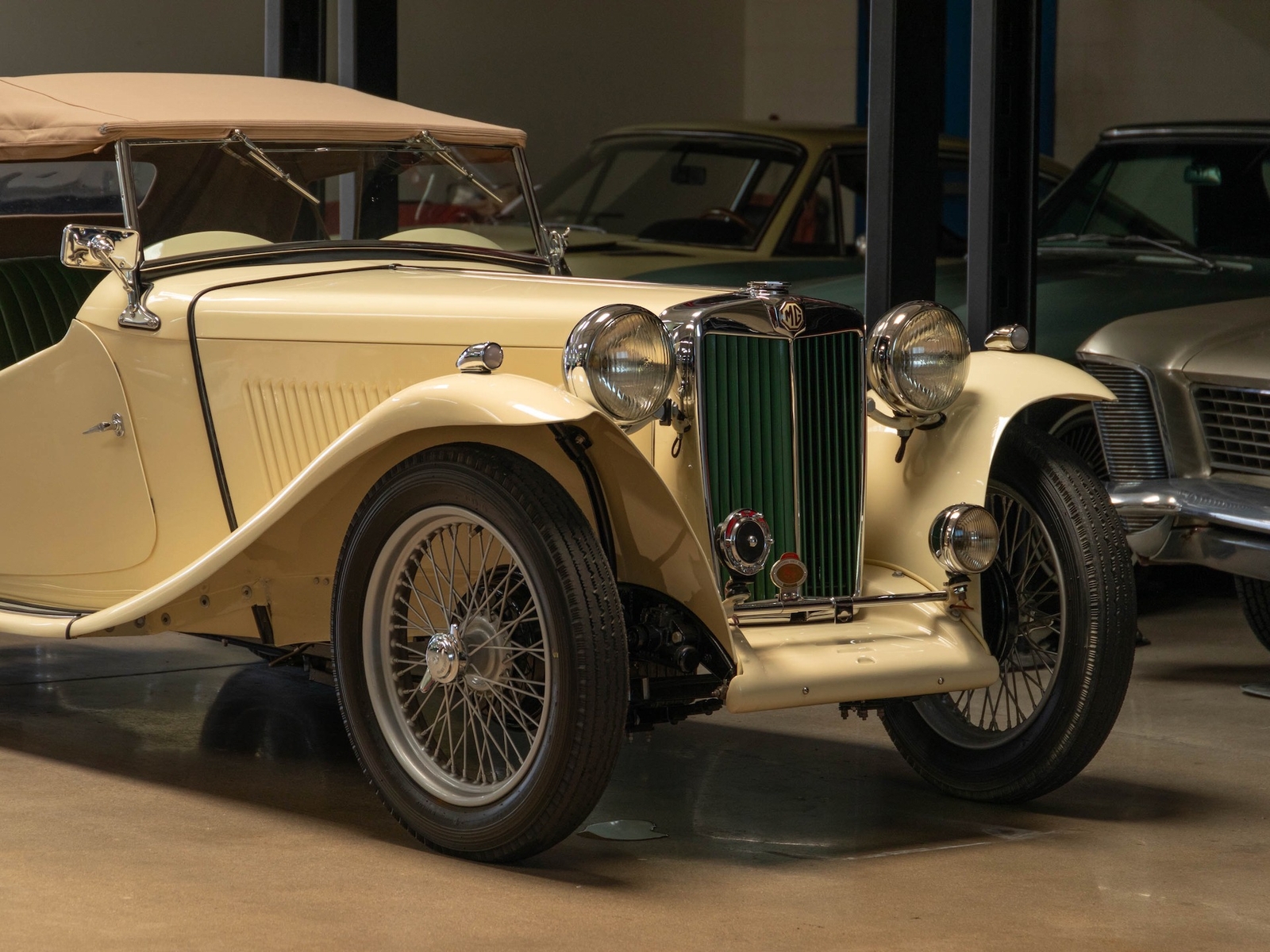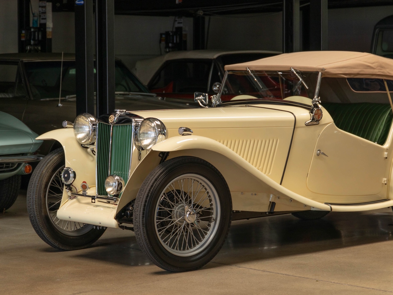 Riding on correct painted wire wheels with period style 4.50-19 Blockley tires, this 1948 MG TC is a wonderful example of one of the worlds all-time most important sports cars and an archetypal prewar British sports car design that carried over into the postwar period. The TC was built between 1945-49 and was the primary influence in turning Americans onto European sports cars. It has since achieved rare 'Milestone' status and with its classic lines, freestanding headlamps, upright radiator shell, sweeping front fenders, rakish cutaway doors, fold down windshield, abbreviated tail which houses the fuel tank and spare tire, and 19" diameter wire wheels with knock off hubs.