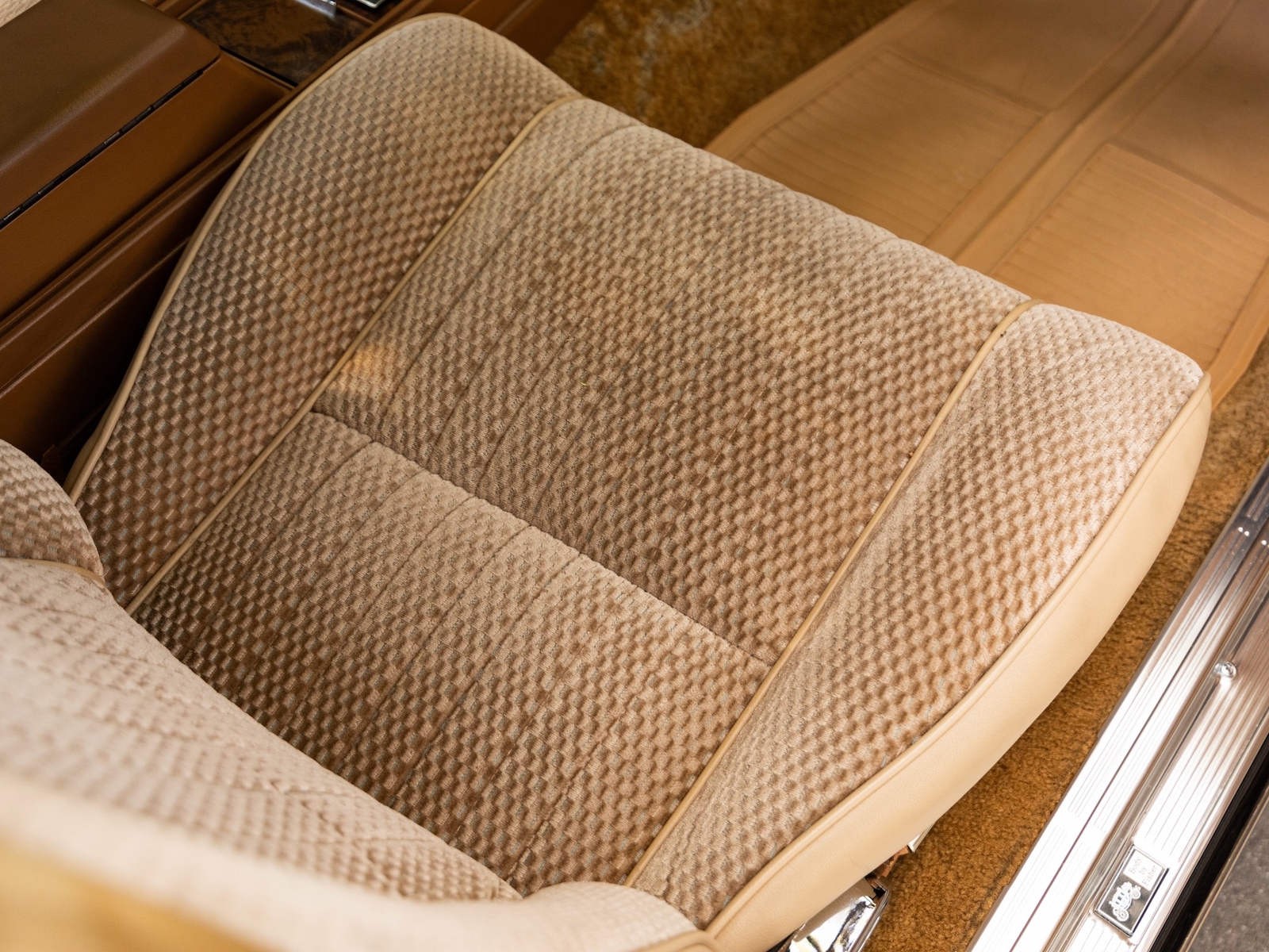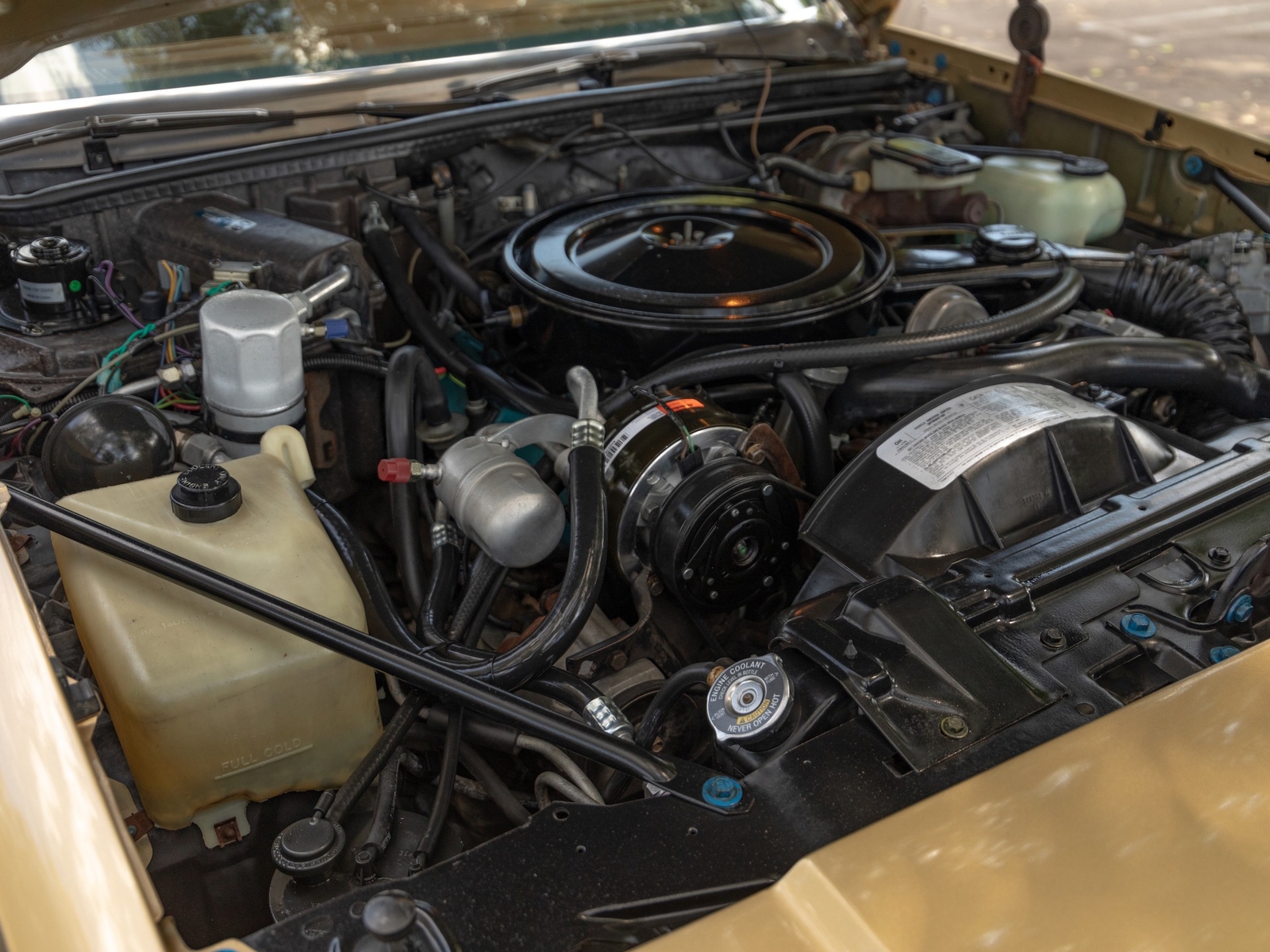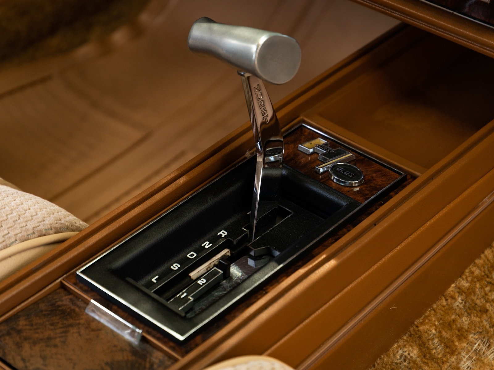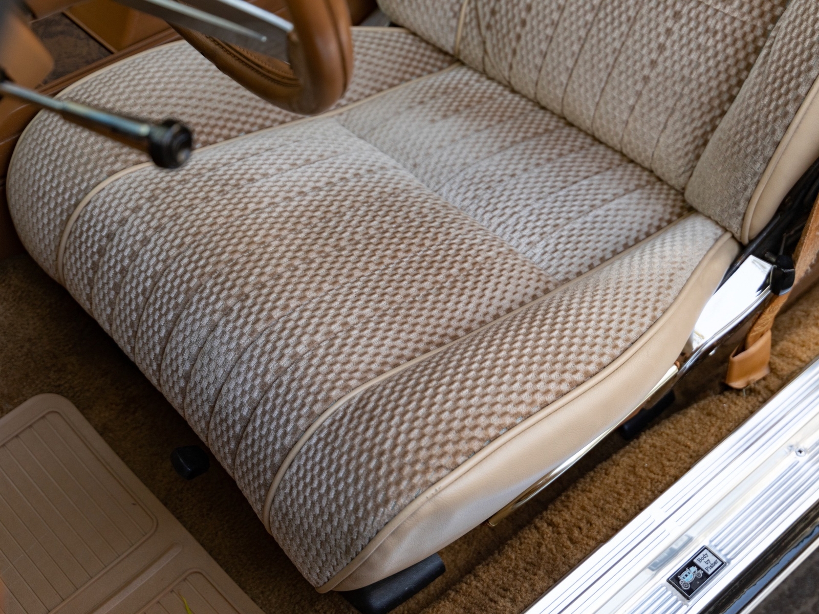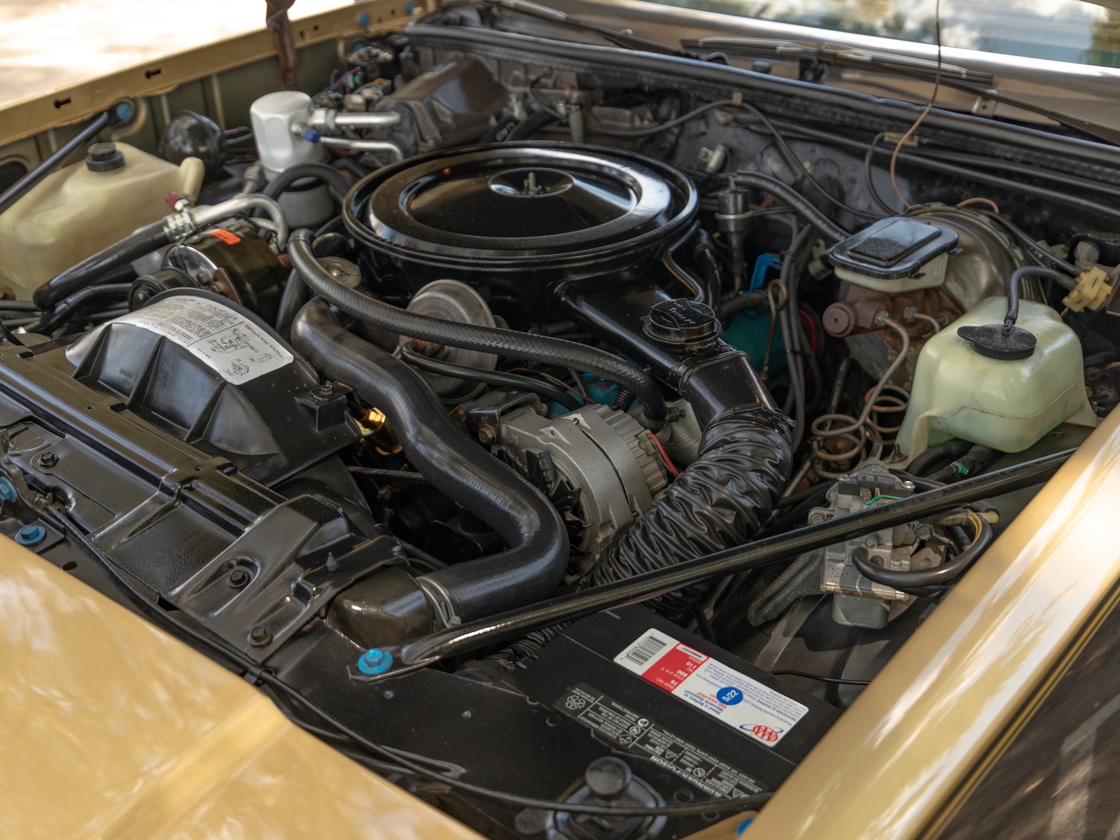 The car was repainted in its original factory two-tone color combination (with a much better finish than any of the original cars sold off the line!) with the original interior trimmed in 'Camel Tan Lochland Velour' with matching carpets, door panels, and plastics. Amenities include crank windows, air conditioning, a later Alpine cassette stereo, and a Hurst dual-gate console shifter. The air conditioning system has been converted to R134a refrigerant and the 350ci L34 V8 features a blue block, matching metric-bolt cylinder heads, and a plain black air cleaner from the factory for 1979. Power is sent to the rear wheels though a three-speed TH-350 automatic transmission and a 7.5 10-bolt rear axle with 2.56:1 gearing. The car brand new BF Goodrich steel belted radial tires mounted on the original wheels, new Bilstein shocks, and every option in the car is working as it should including the fully rebuilt AC system.