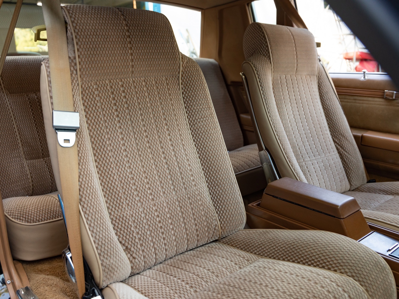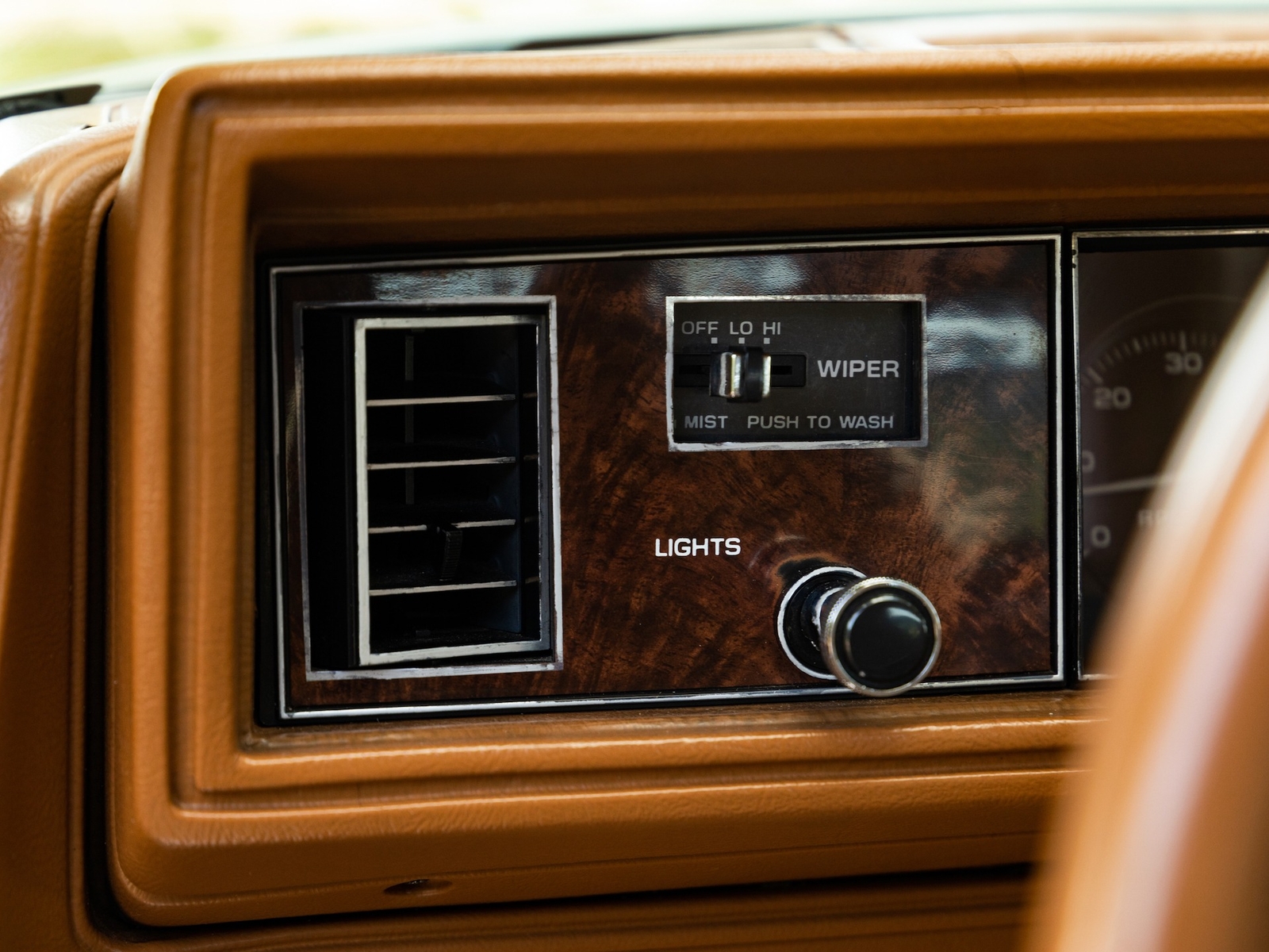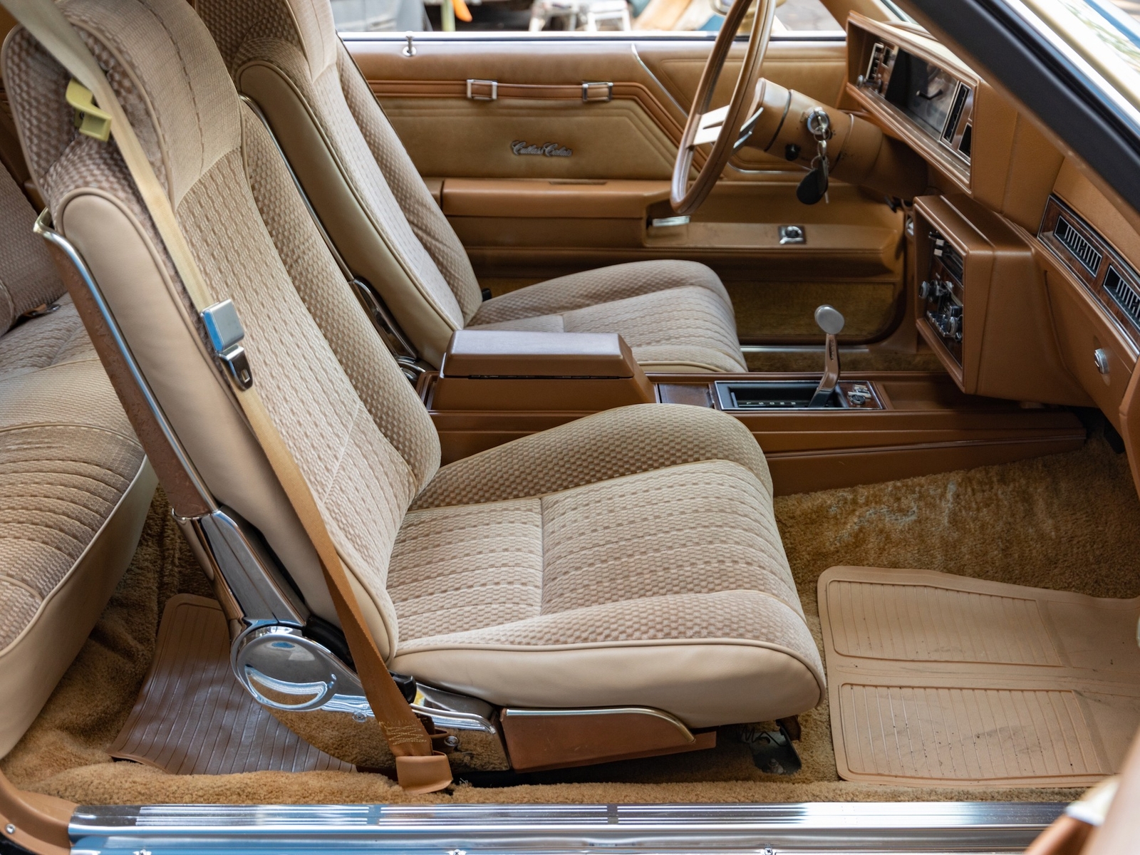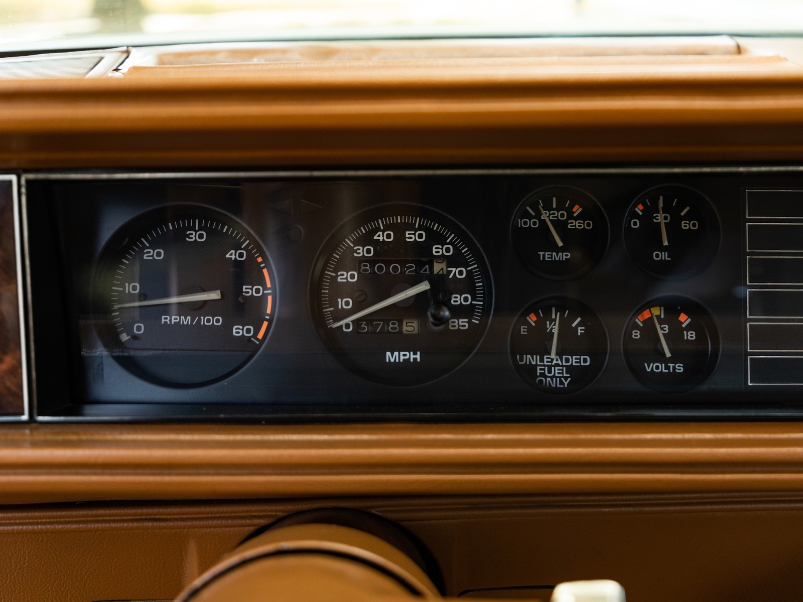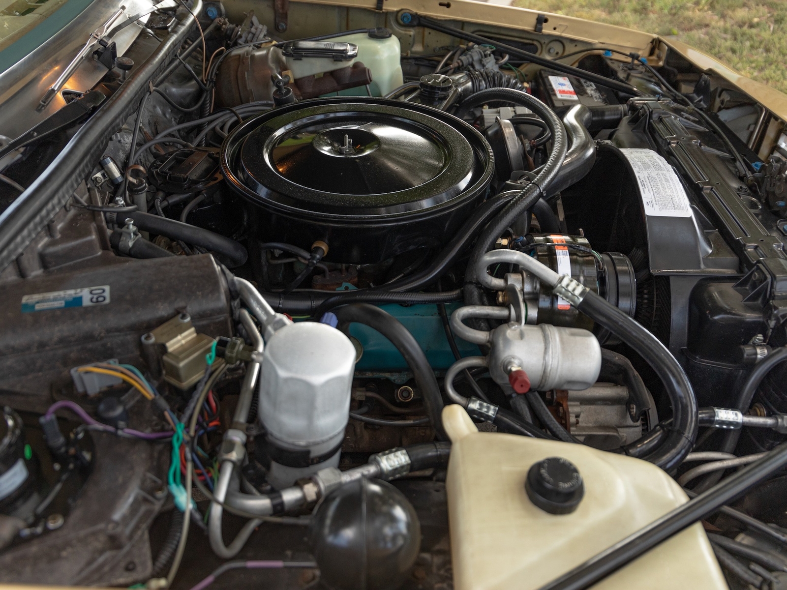 The car was repainted in its original factory two-tone color combination (with a much better finish than any of the original cars sold off the line!) with the original interior trimmed in 'Camel Tan Lochland Velour' with matching carpets, door panels, and plastics. Amenities include crank windows, air conditioning, a later Alpine cassette stereo, and a Hurst dual-gate console shifter. The air conditioning system has been converted to R134a refrigerant and the 350ci L34 V8 features a blue block, matching metric-bolt cylinder heads, and a plain black air cleaner from the factory for 1979. Power is sent to the rear wheels though a three-speed TH-350 automatic transmission and a 7.5 10-bolt rear axle with 2.56:1 gearing. The car brand new BF Goodrich steel belted radial tires mounted on the original wheels, new Bilstein shocks, and every option in the car is working as it should including the fully rebuilt AC system.