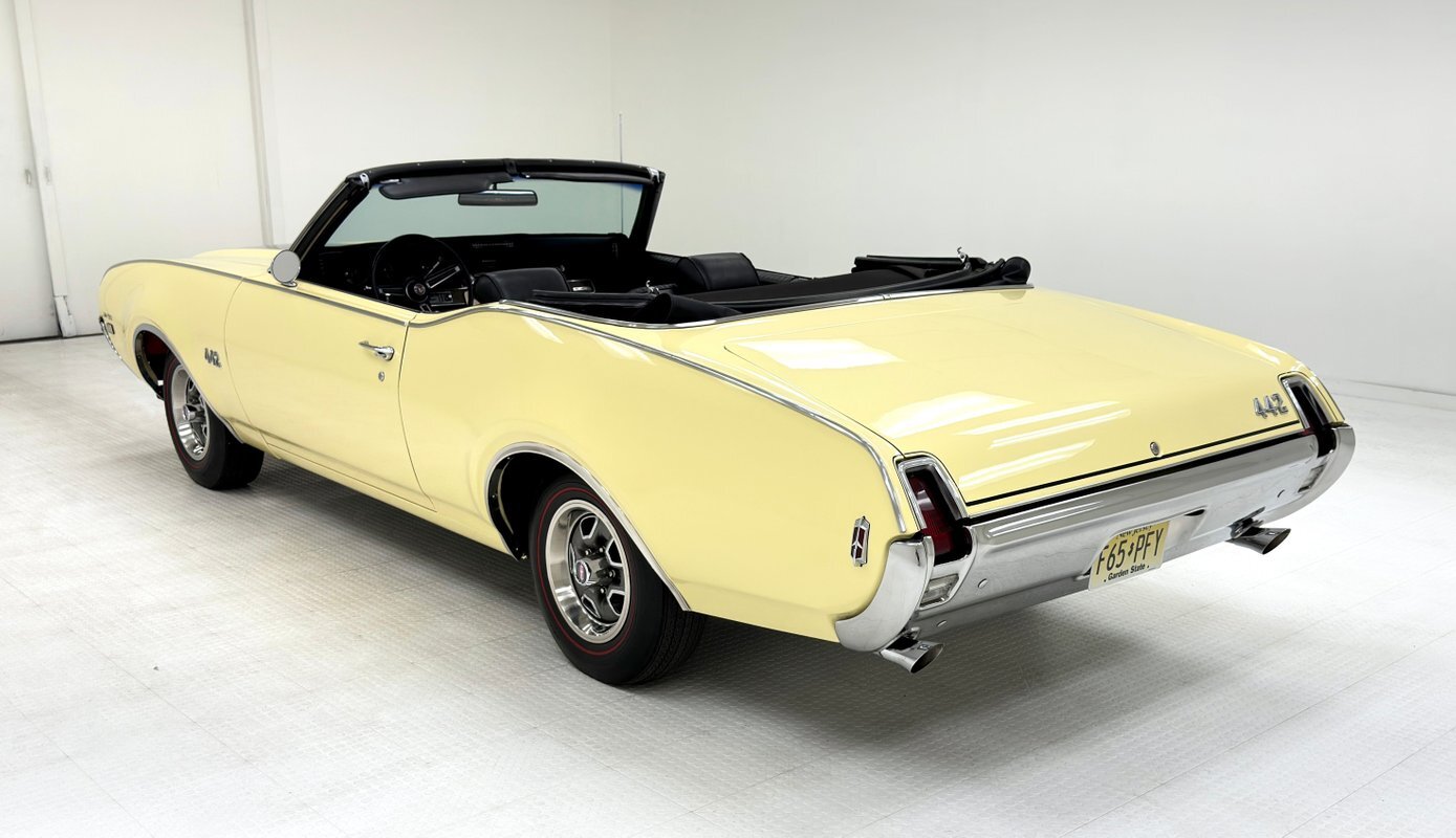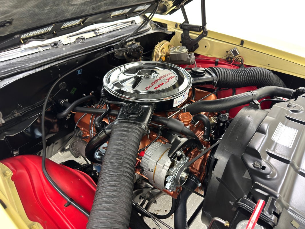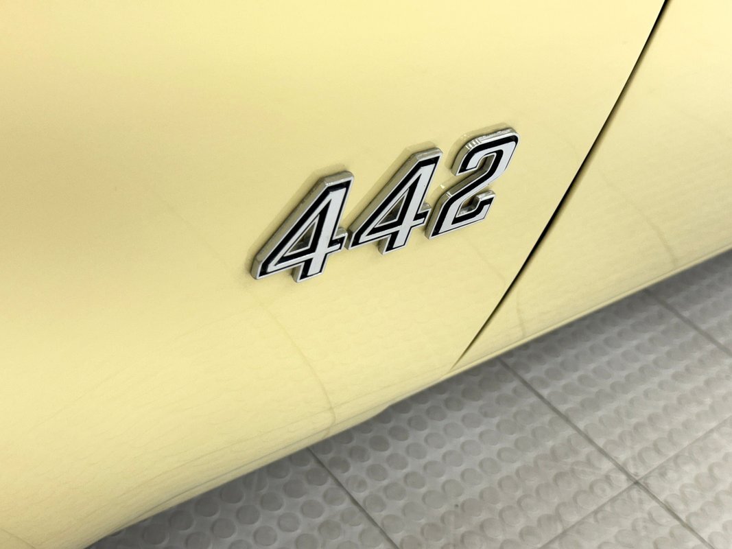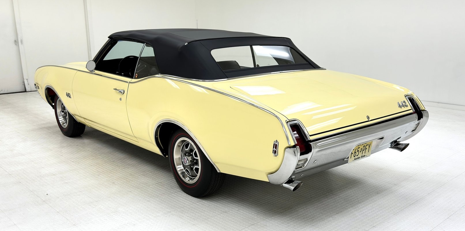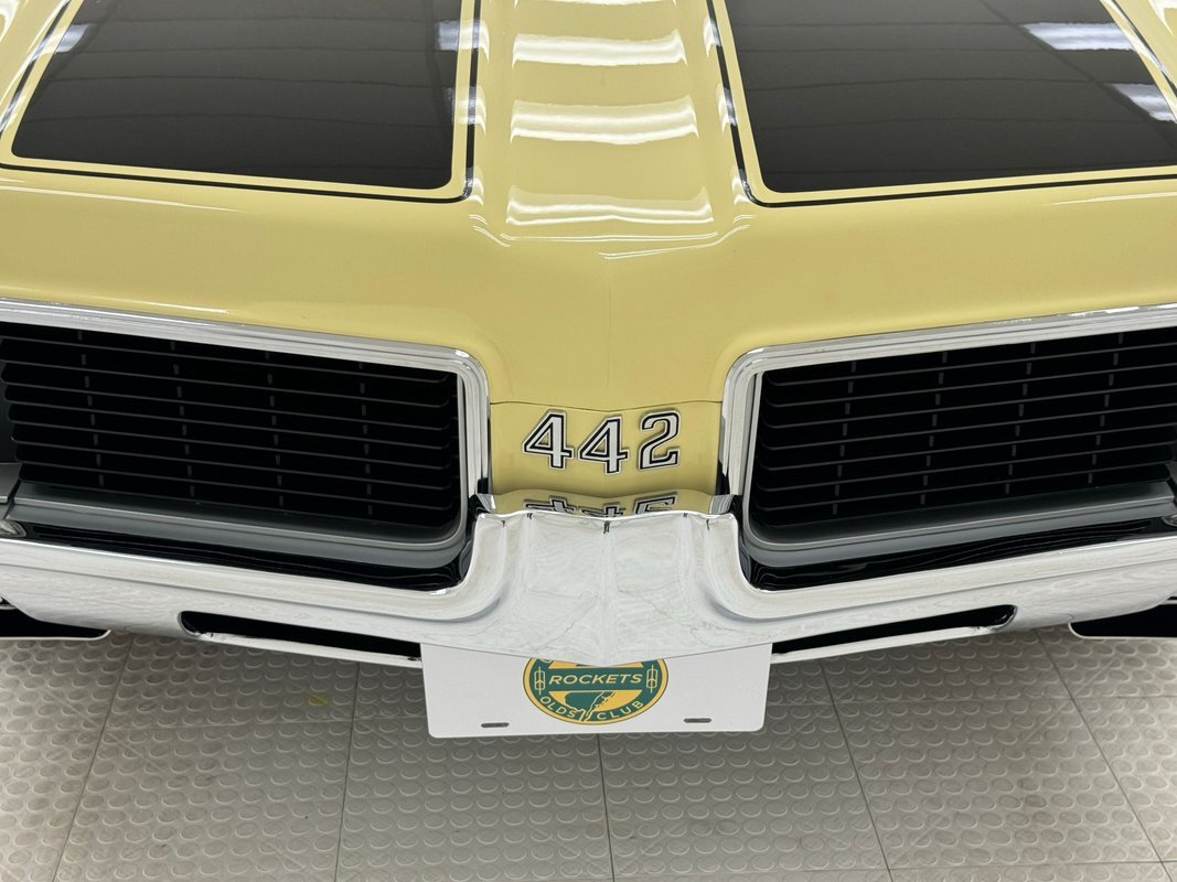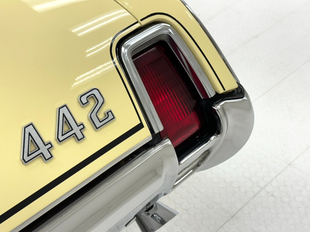 A respray in the correct Saffron covers the bulged hood that is complemented with twin black stripes. This hood is flanked by coke bottle-esque fenders flow into the rest of the undulating body, but the star of the show is the split blacked out grille and hood tooth that drops down to meet the integrated front bumper. While the 442 callout on the tooth gives an idea of what lurks under the hood, very few will spot the twin ram air scoops below the bumper. The gaps are well minded and the paint presents as show worthy with minor orange peel in one section and some very minor rust bubbling evident on the bottom of the passenger's door, but one must get on their knees or have the car on a lift to find these flaws. Shiny trimmings grace the wheel openings, windshield frame and body beltline trimmings to add a nice highlight to the curved early coke bottle design. A showroom fresh black canvas convertible roof with a glass rear window is highlighted by polished stainless trimmings around the rear base. Pointy bullet-like curves for the front and rear of this car and the rocket dressed rear side marker lights with another integrated chrome bumper finish off the look at the rear and is perfected by the fluted exhaust tips and inset cathedral style tail lights. 14-inch Oldsmobile Super Stock II wheels are on all 4 corners and are wrapped in like F70 rubber.