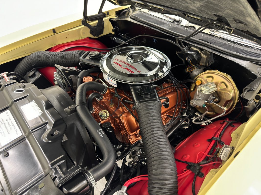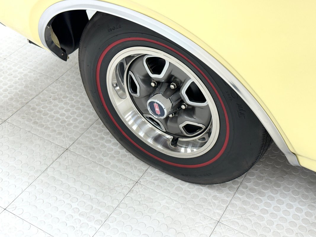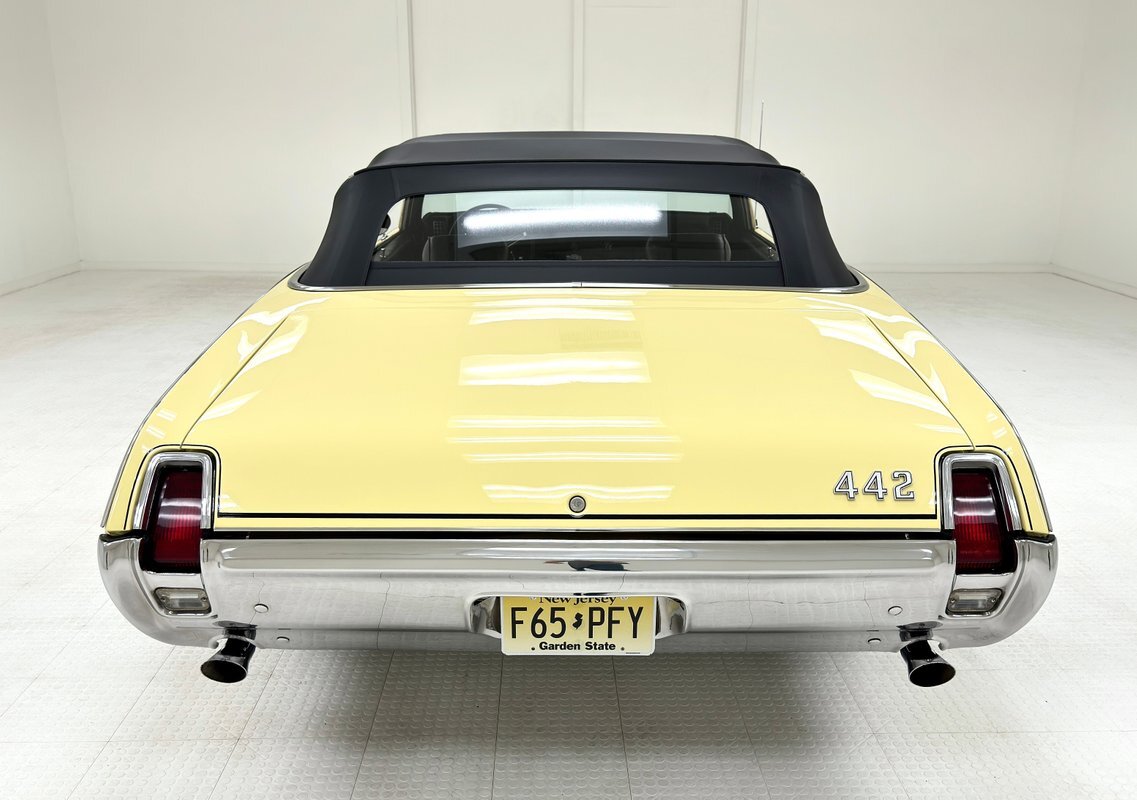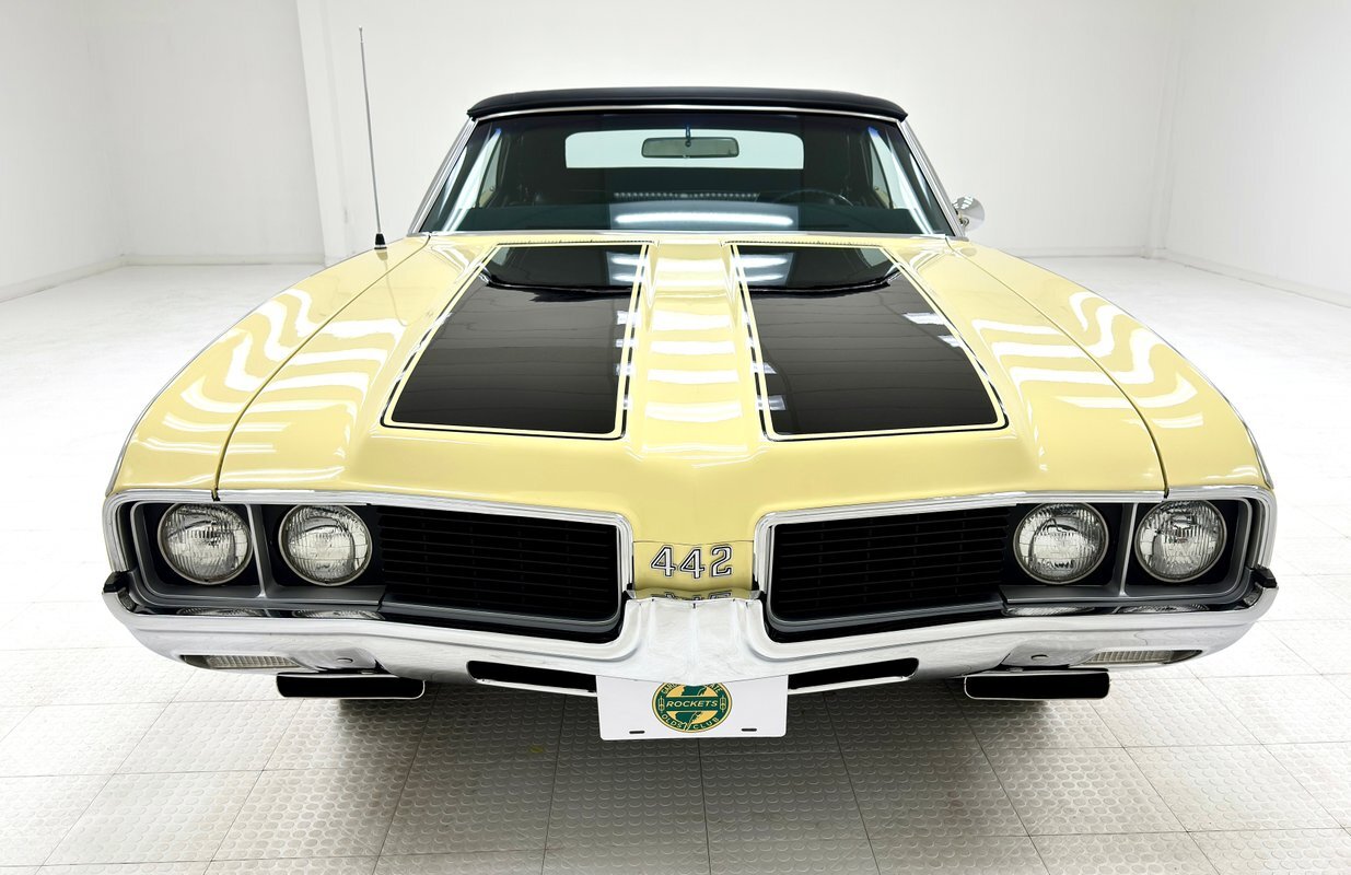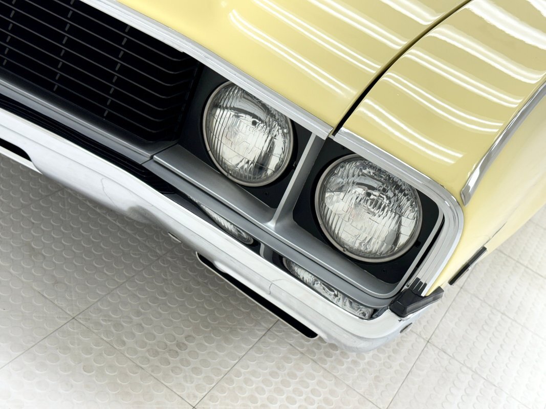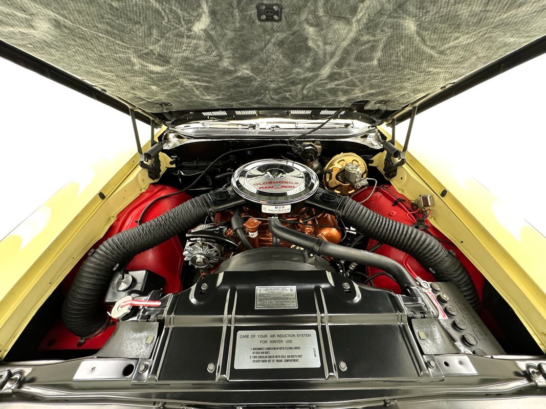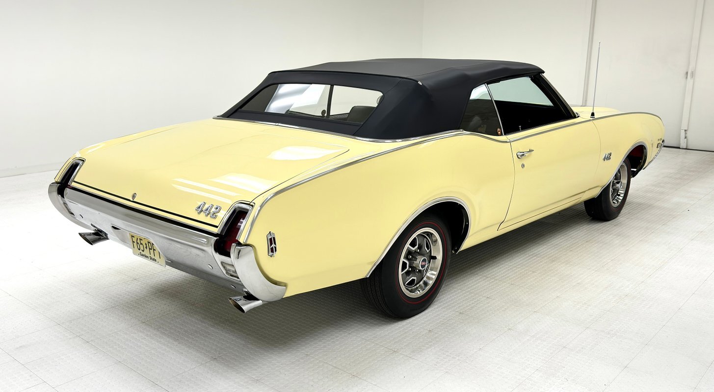 A respray in the correct Saffron covers the bulged hood that is complemented with twin black stripes. This hood is flanked by coke bottle-esque fenders flow into the rest of the undulating body, but the star of the show is the split blacked out grille and hood tooth that drops down to meet the integrated front bumper. While the 442 callout on the tooth gives an idea of what lurks under the hood, very few will spot the twin ram air scoops below the bumper. The gaps are well minded and the paint presents as show worthy with minor orange peel in one section and some very minor rust bubbling evident on the bottom of the passenger's door, but one must get on their knees or have the car on a lift to find these flaws. Shiny trimmings grace the wheel openings, windshield frame and body beltline trimmings to add a nice highlight to the curved early coke bottle design. A showroom fresh black canvas convertible roof with a glass rear window is highlighted by polished stainless trimmings around the rear base. Pointy bullet-like curves for the front and rear of this car and the rocket dressed rear side marker lights with another integrated chrome bumper finish off the look at the rear and is perfected by the fluted exhaust tips and inset cathedral style tail lights. 14-inch Oldsmobile Super Stock II wheels are on all 4 corners and are wrapped in like F70 rubber.