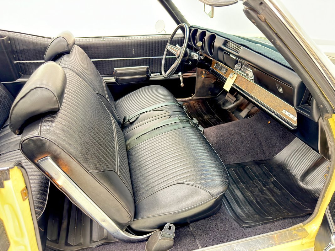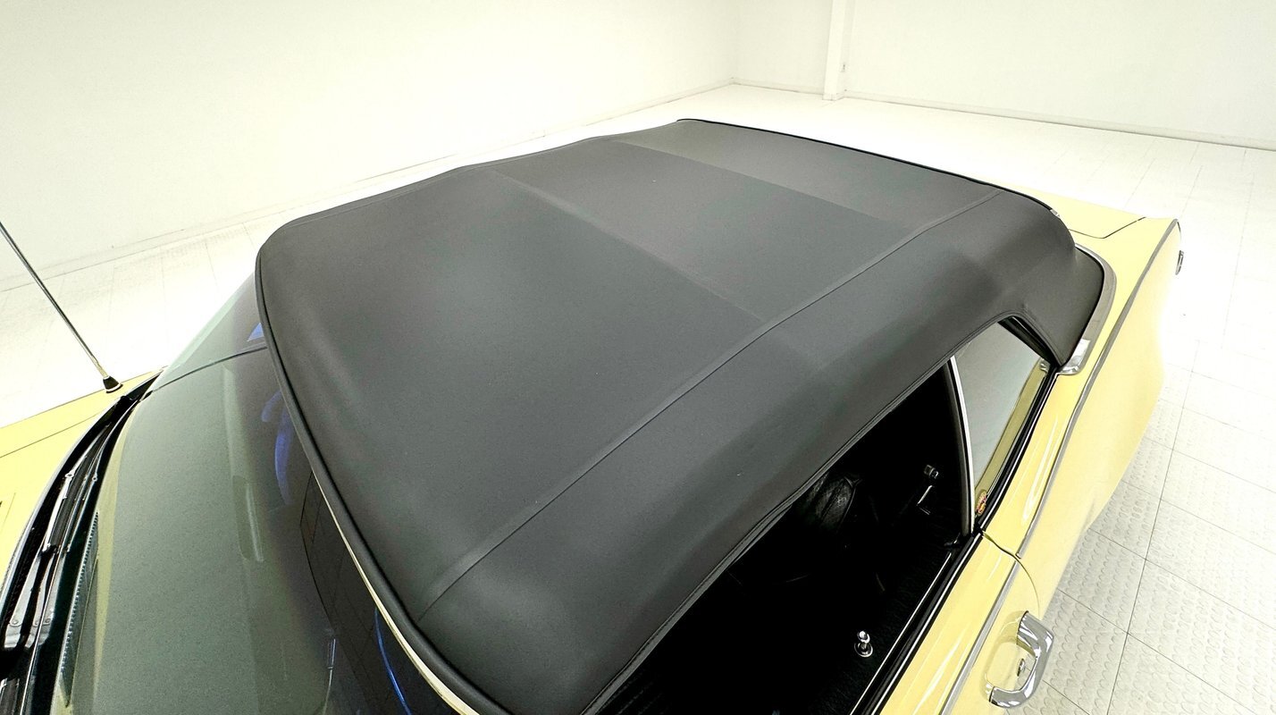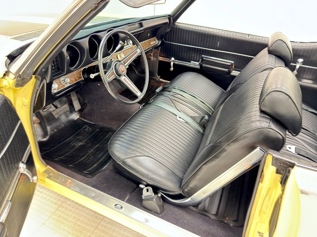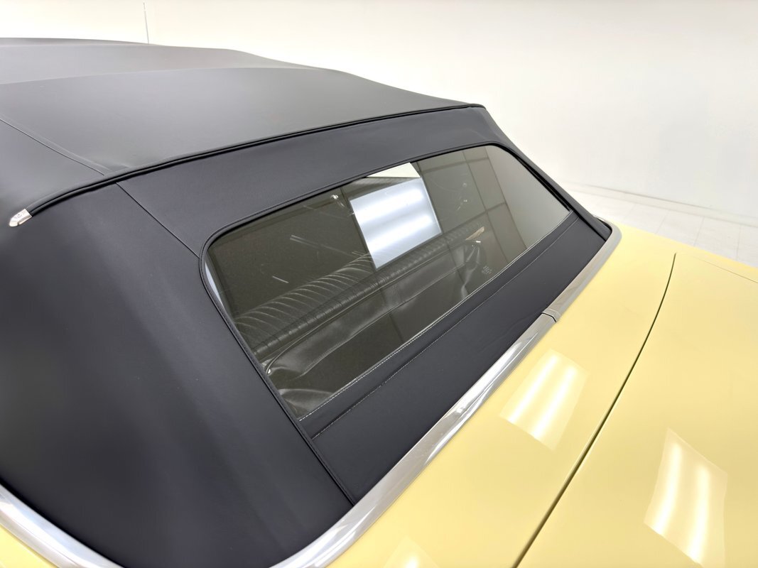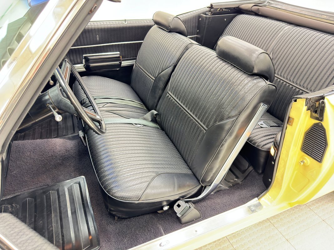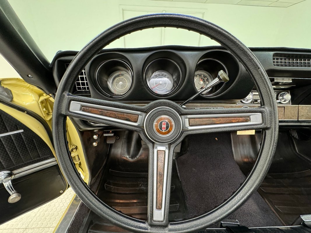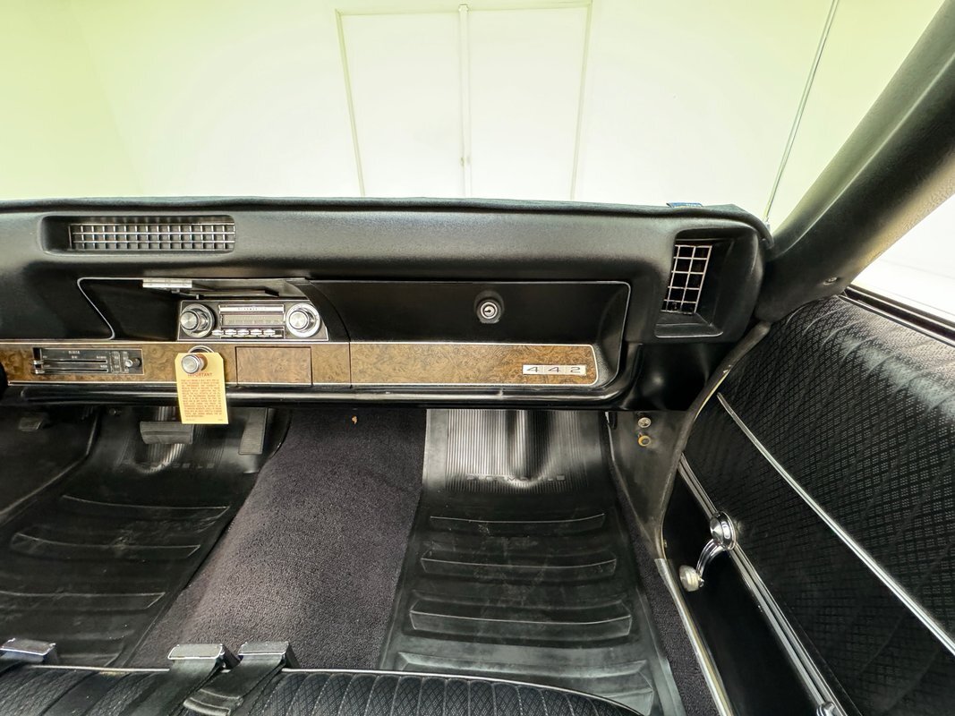 A respray in the correct Saffron covers the bulged hood that is complemented with twin black stripes. This hood is flanked by coke bottle-esque fenders flow into the rest of the undulating body, but the star of the show is the split blacked out grille and hood tooth that drops down to meet the integrated front bumper. While the 442 callout on the tooth gives an idea of what lurks under the hood, very few will spot the twin ram air scoops below the bumper. The gaps are well minded and the paint presents as show worthy with minor orange peel in one section and some very minor rust bubbling evident on the bottom of the passenger's door, but one must get on their knees or have the car on a lift to find these flaws. Shiny trimmings grace the wheel openings, windshield frame and body beltline trimmings to add a nice highlight to the curved early coke bottle design. A showroom fresh black canvas convertible roof with a glass rear window is highlighted by polished stainless trimmings around the rear base. Pointy bullet-like curves for the front and rear of this car and the rocket dressed rear side marker lights with another integrated chrome bumper finish off the look at the rear and is perfected by the fluted exhaust tips and inset cathedral style tail lights. 14-inch Oldsmobile Super Stock II wheels are on all 4 corners and are wrapped in like F70 rubber.