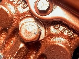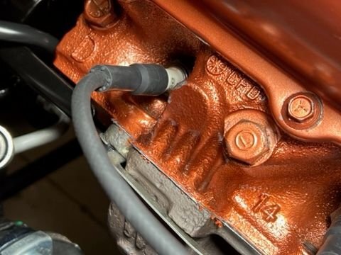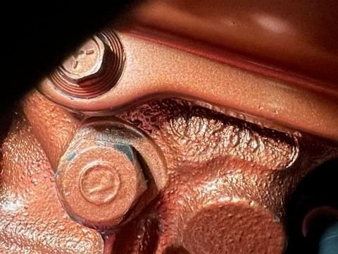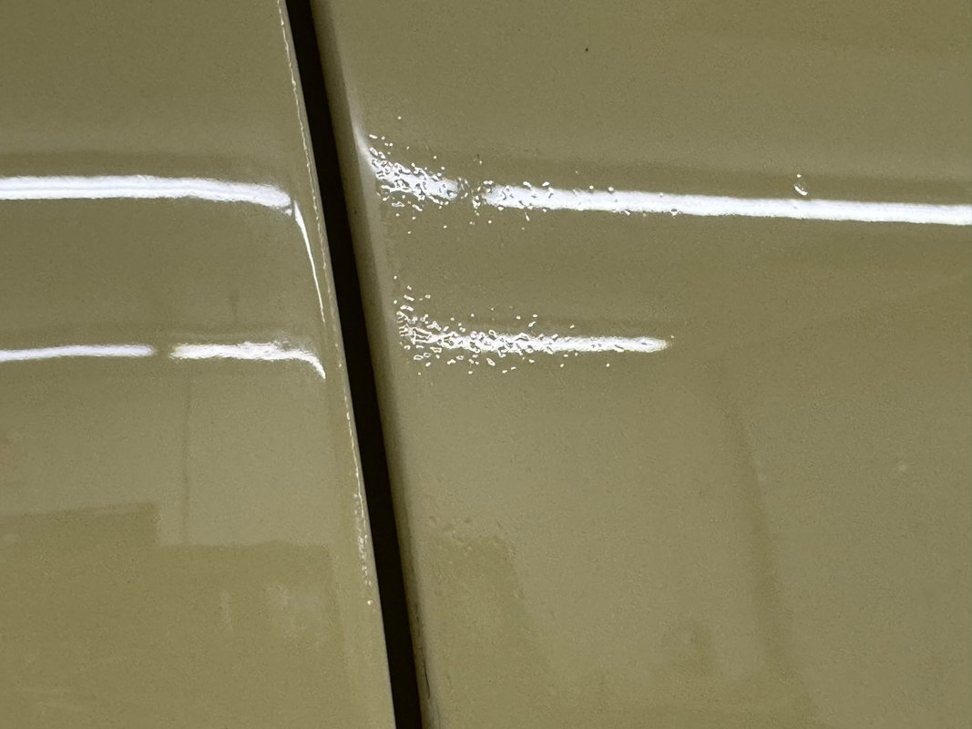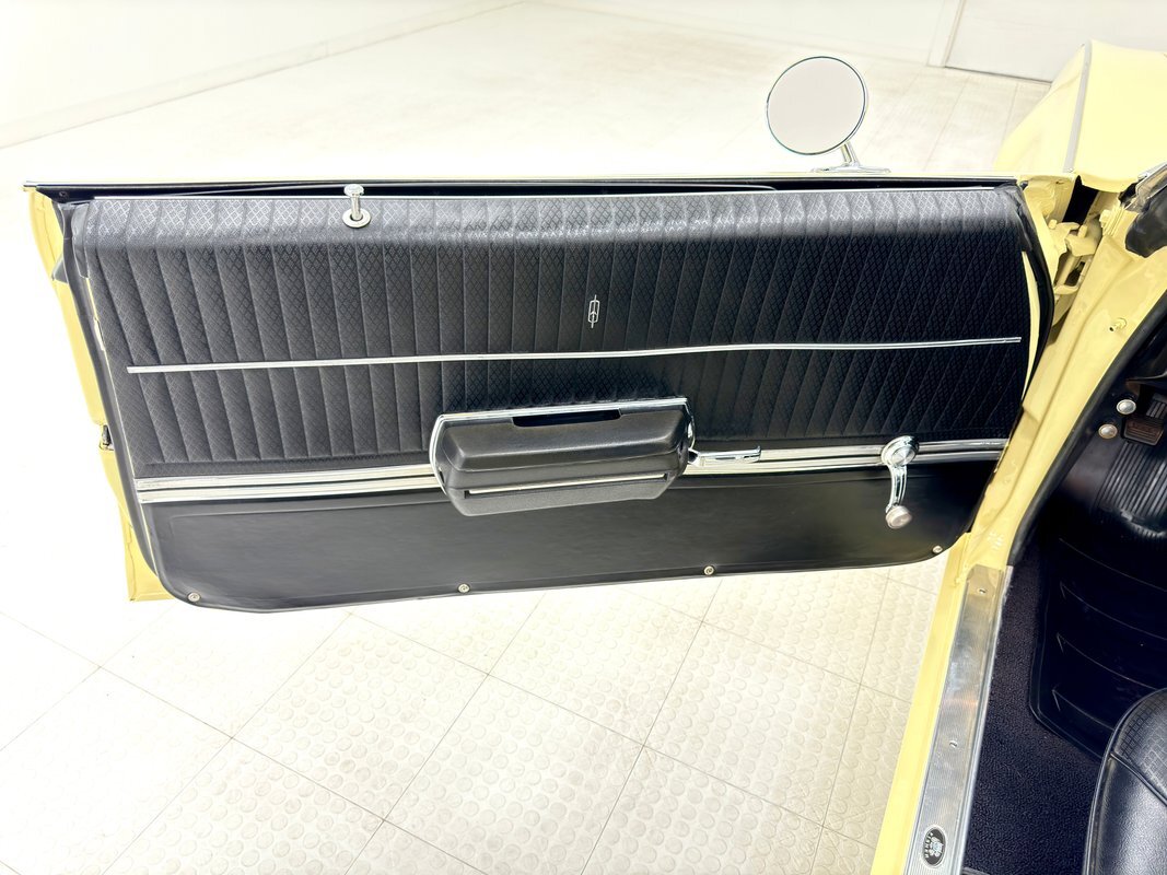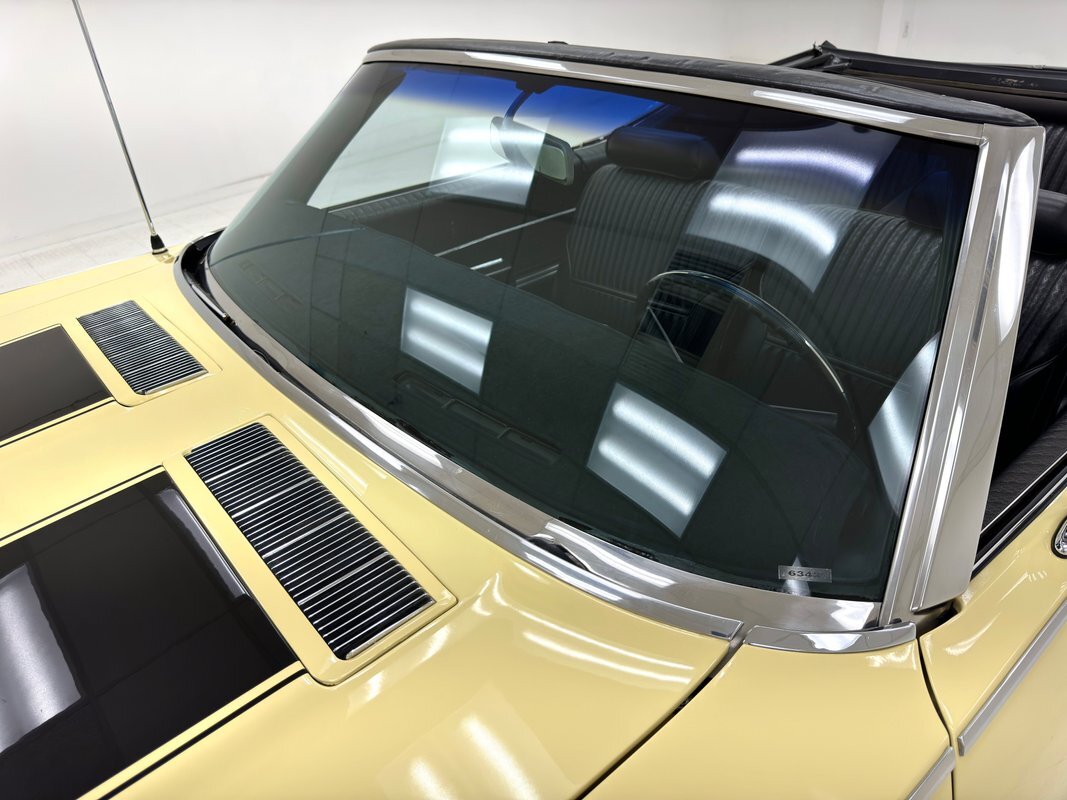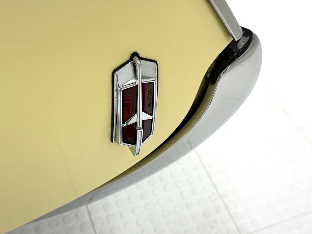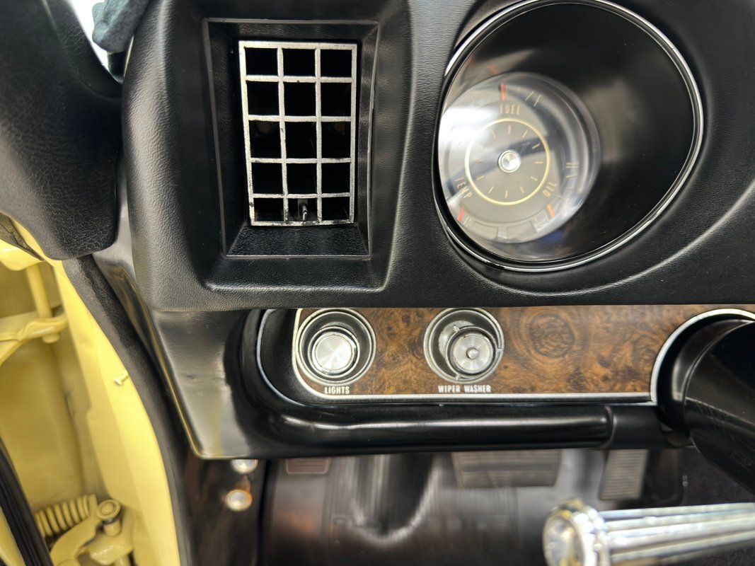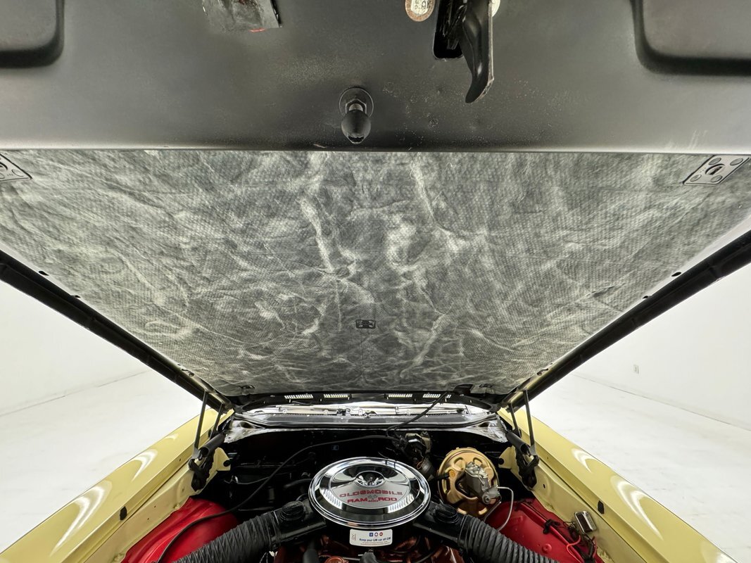 A respray in the correct Saffron covers the bulged hood that is complemented with twin black stripes. This hood is flanked by coke bottle-esque fenders flow into the rest of the undulating body, but the star of the show is the split blacked out grille and hood tooth that drops down to meet the integrated front bumper. While the 442 callout on the tooth gives an idea of what lurks under the hood, very few will spot the twin ram air scoops below the bumper. The gaps are well minded and the paint presents as show worthy with minor orange peel in one section and some very minor rust bubbling evident on the bottom of the passenger's door, but one must get on their knees or have the car on a lift to find these flaws. Shiny trimmings grace the wheel openings, windshield frame and body beltline trimmings to add a nice highlight to the curved early coke bottle design. A showroom fresh black canvas convertible roof with a glass rear window is highlighted by polished stainless trimmings around the rear base. Pointy bullet-like curves for the front and rear of this car and the rocket dressed rear side marker lights with another integrated chrome bumper finish off the look at the rear and is perfected by the fluted exhaust tips and inset cathedral style tail lights. 14-inch Oldsmobile Super Stock II wheels are on all 4 corners and are wrapped in like F70 rubber.