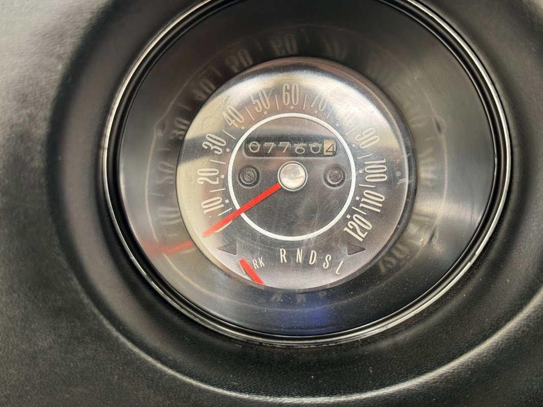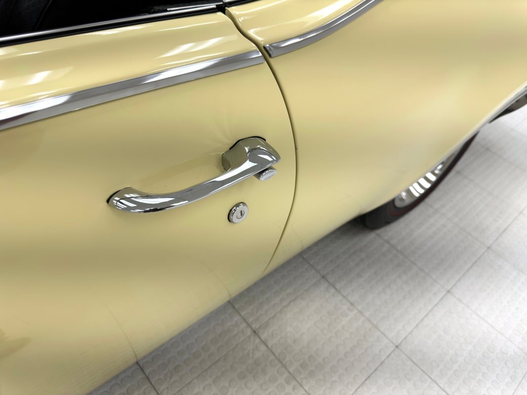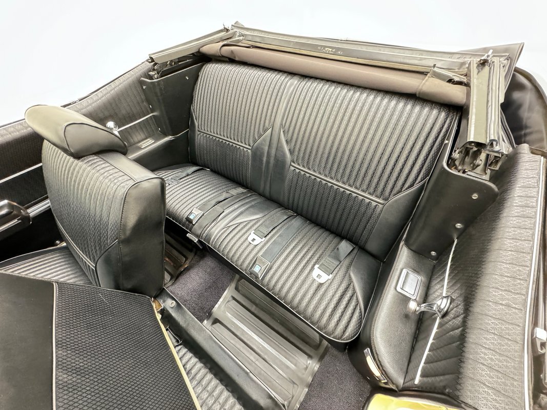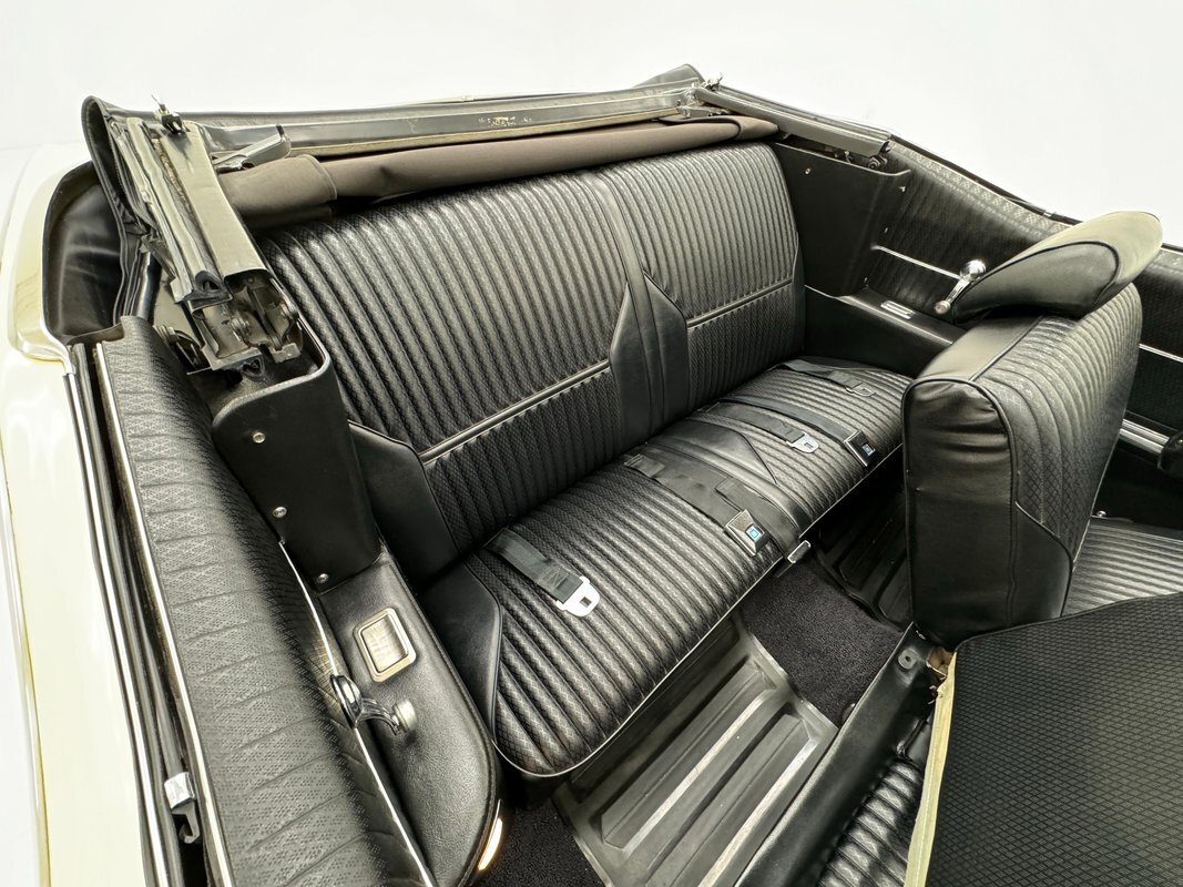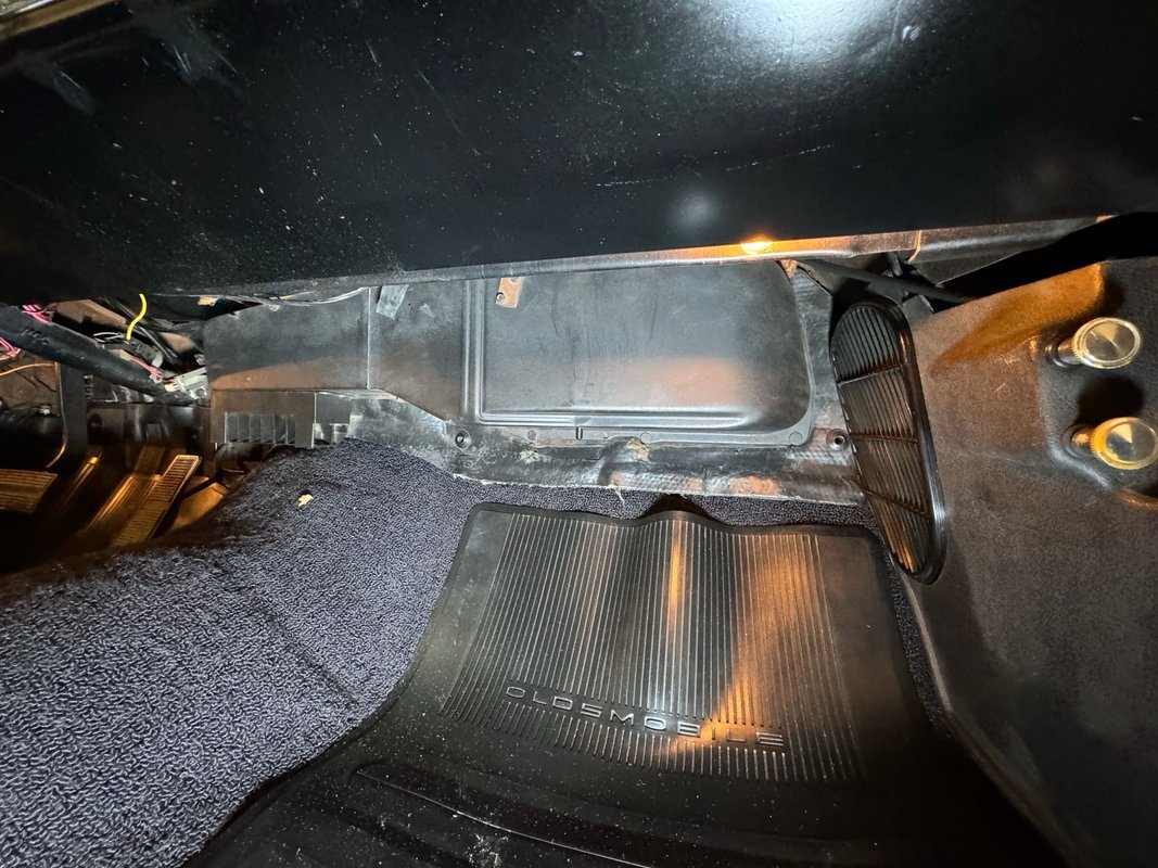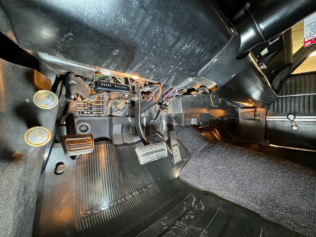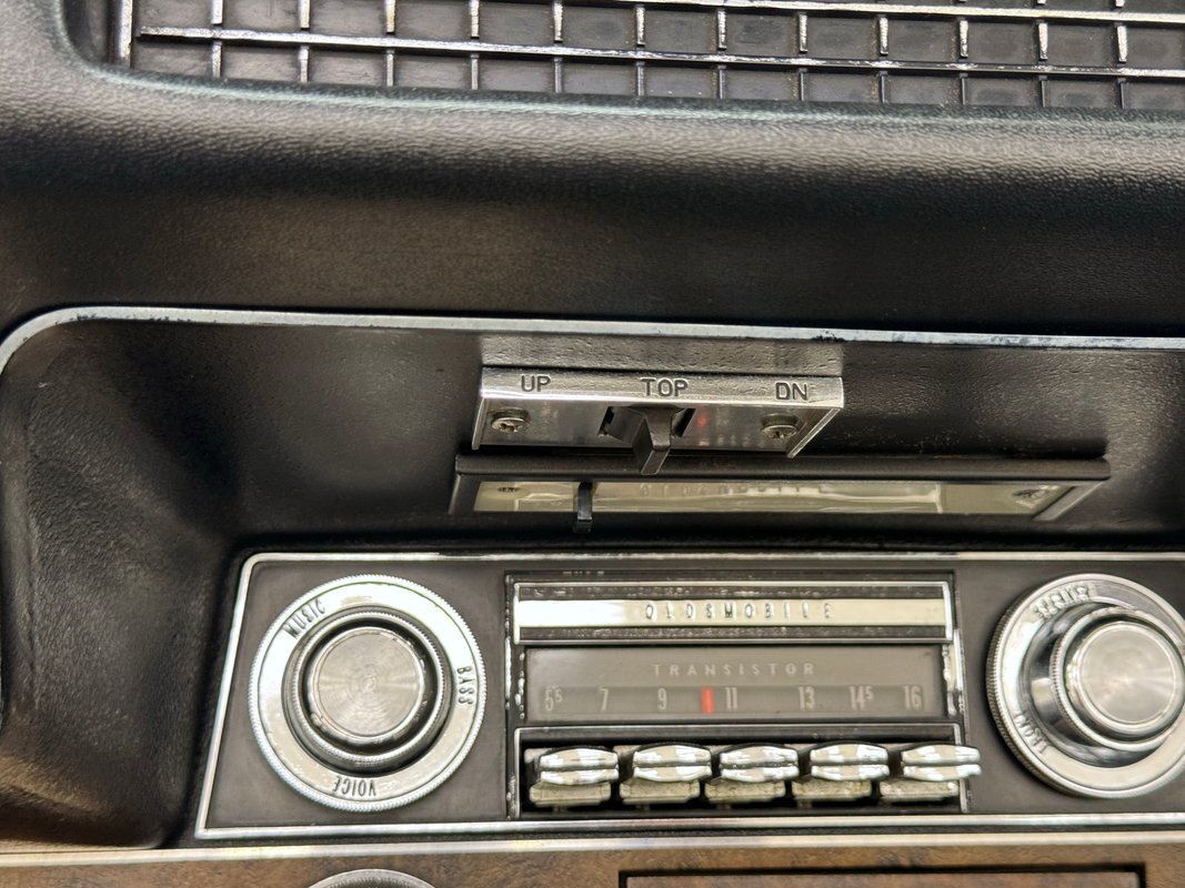 A swing of the door and we are in black vinyl interior heaven. The door panels have a vertical stitched vinyl pattern that cascades downward from the top of the door to a polished spear before where black vinyl takes over. All of this, along with the small rocket emblem give an elegant classy look. A split back front bench seat races between the door panels, and for the rear, a full bench sprawls across with all dressed in factory fresh stitched vinyl that emulates the door panels perfectly. The molded vinyl dash has a trio of deeply inset large circular gauges, with monitoring gauges to the left of the center speedo and the Tic-Toc-Tach to the right, also known as the Rally Pack. Control knobs and sliders for the heat, lights and wipers are mounted in a wood applique strip just below, all well within ergonomic reach of the driver. In the center of the dash is the factory AM radio with the chrome toggle for the power top just above. All of this floats in on black carpeting that is protected by Oldsmobile badged black rubber mats.