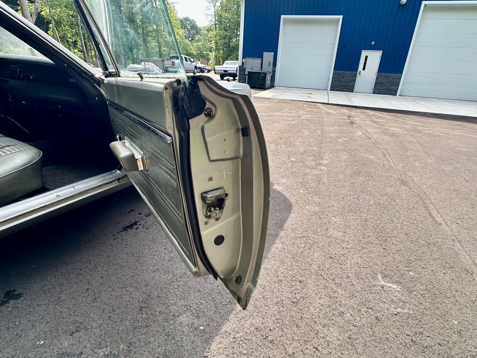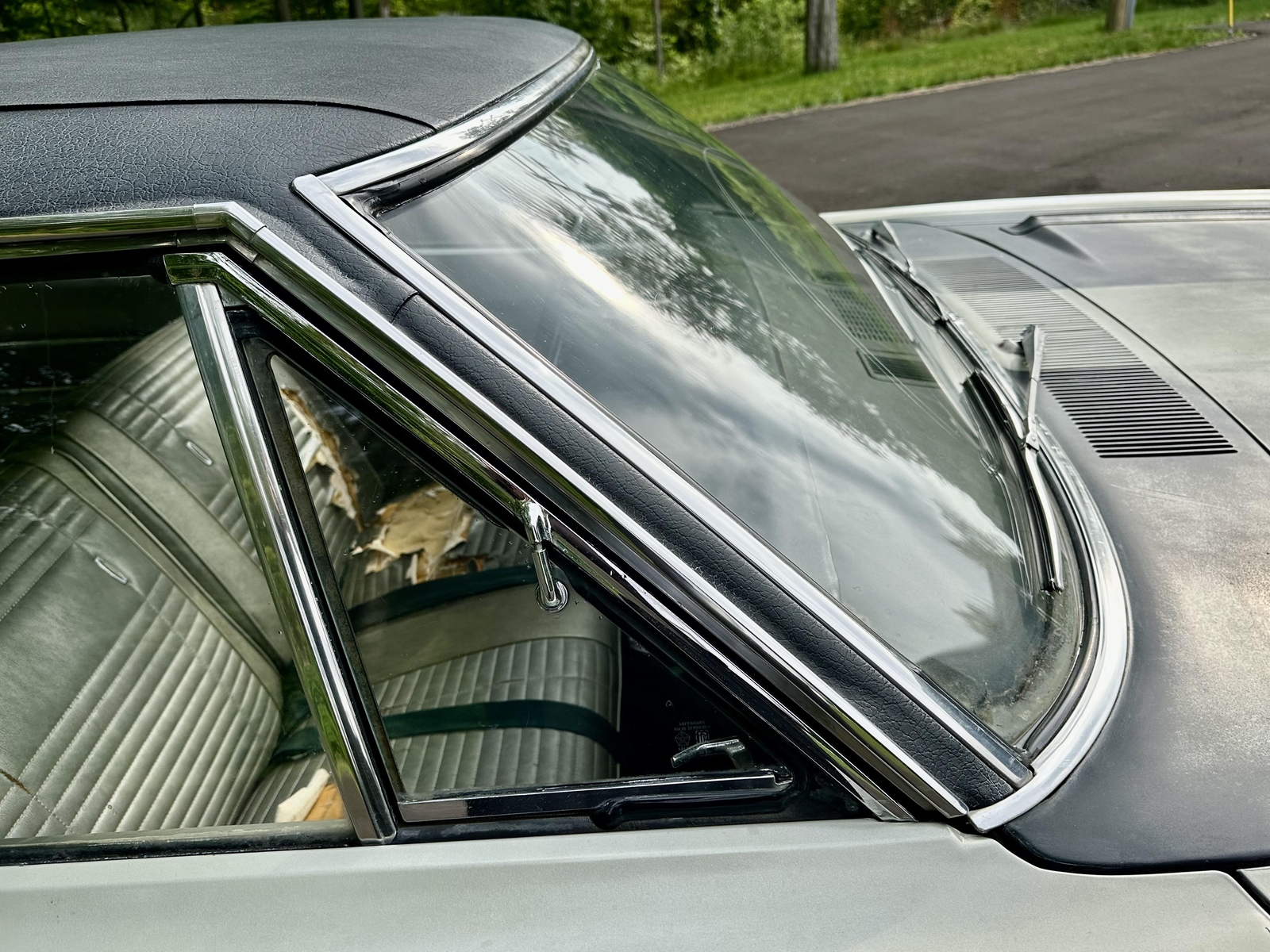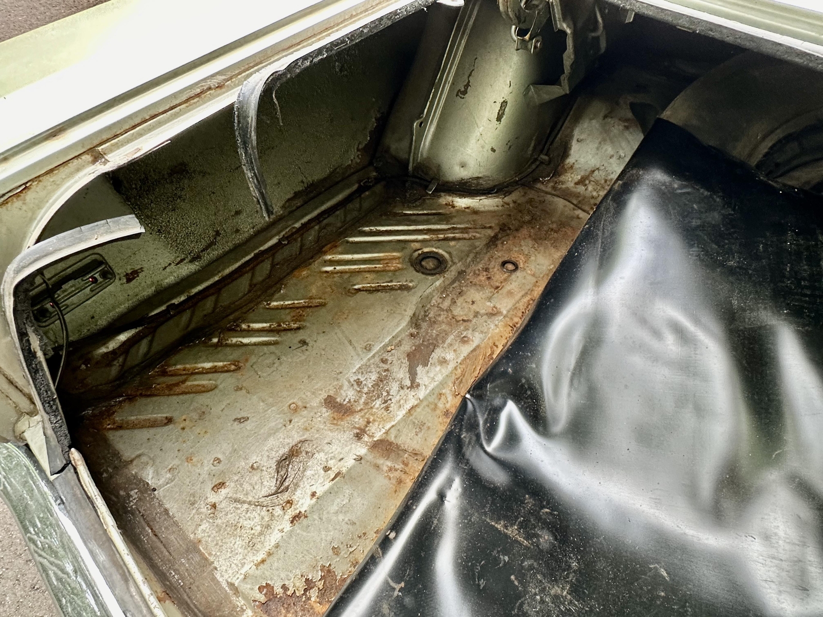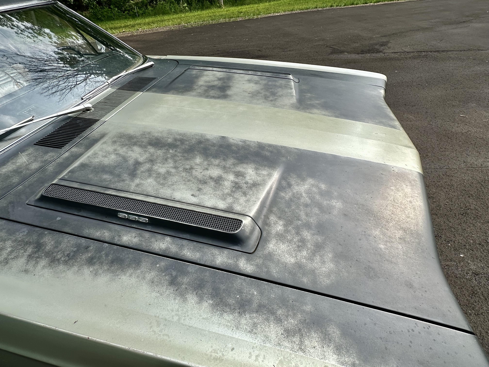The exterior of this Road Runner presents well and is consistent throughout, ready for its next restoration project. The car was resprayed over 40 years ago and is now ready to be repaired and repainted. The original metals are in place with some areas of rust, but they are overall solid and repairable. The car is straight with no signs of structural repairs. The Air Grabber hood is in great shape and complete. The doors, decklid, hood, and glass all line up nicely. The car will need new floor pans, but the wheels are in good shape. A replacement windshield is ready to be installed.