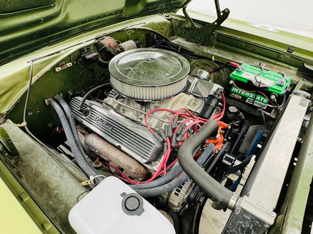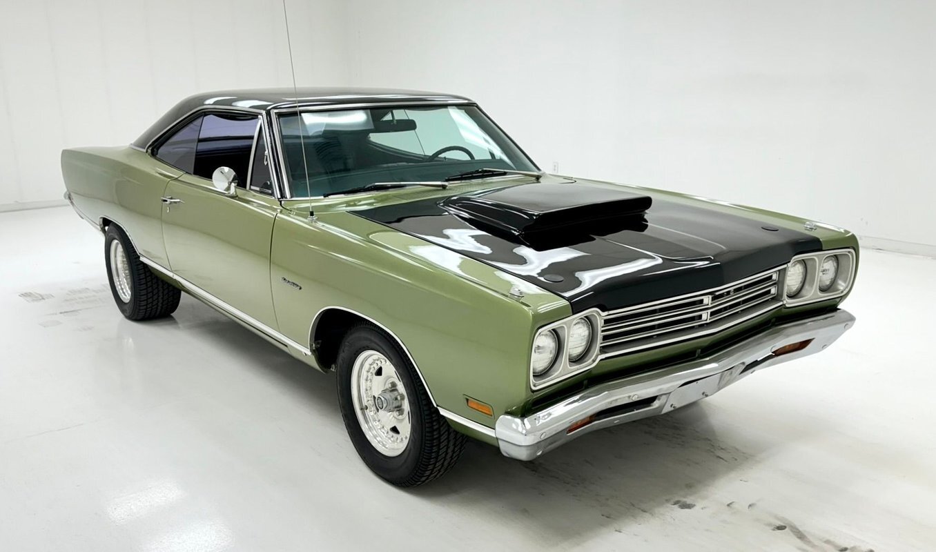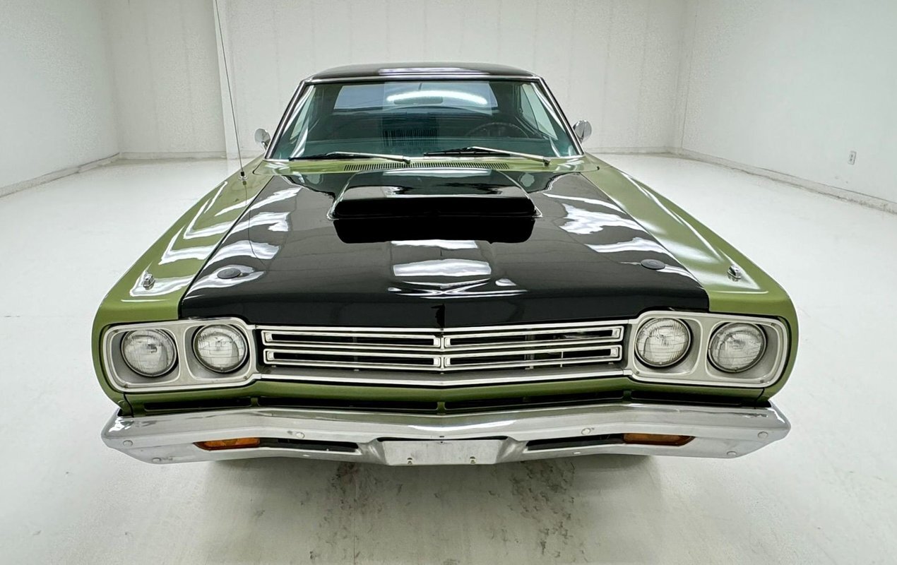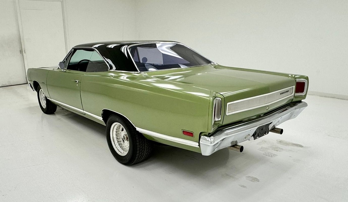 Thanks to lessons learned in both packaging and branding, Plymouth outfitted their hottest 1969 mid-size with a number of fresh styling cues that served to better differentiate the car from its more pedestrian Belvedere siblings. At the front of this Satellite's long Limelight Green Metallic and black accented body a stainless steel Satellite grille hangs below the black painted and custom fabricated 6-pack style scooped hood. On either front side are dual circular head lighting. At the sides of that stainless, dent-free rocker moldings combine with like-new wheel well trim to anchor Satellite fender emblems between traditional chrome door handles and what appear to be original side mirrors. And at the back of the car's body, branded pot metal trunk trim aligns perfectly between clear factory square shaped angled from back edge to trunk lid edge tail lights, a second small "PLYMOUTH" script and a second chrome bumper. Dual tail pipes peek out the back near the center. A shout out to the B pillar which gives the black painted roofline the illusion of moving forward while just literally sitting there. A slightly jacked up stance is showing off some 15-inch polished Centerline wheels wrapped in front by 215/70R15 black walls, and in back are hefty 295/50R15 black wall rubber wrappings . Smoke 'em if ya got 'em!