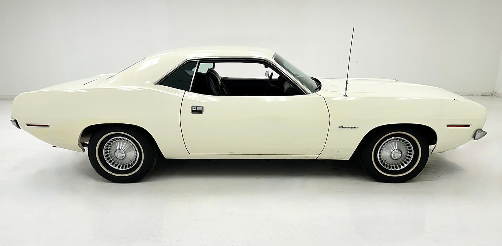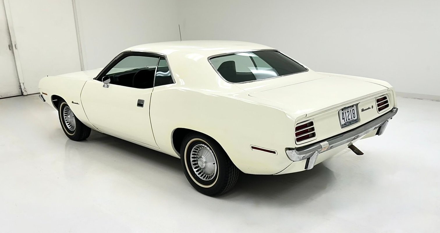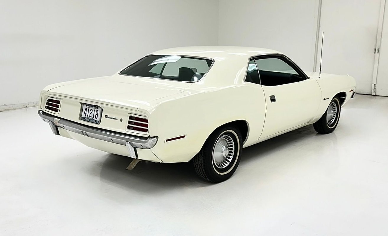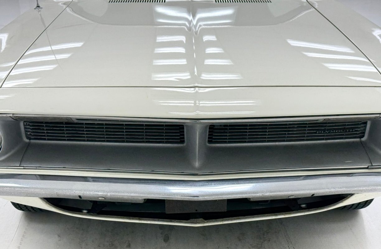 At the front of the car, a traditional satin silver split grille with argent surrounds with single satin silver bezel headlights flanking on either side lead the way. Top mounted signal markers hover on the tops of the quarters and a mustache thin bumper in chrome is just below to frame the grille bottom. A non scooped, non striped steel hood runs from the grille rearward to a pristine stainless framed windshield. Inset chromed door handles are all mounted nicely in the field of white. Moving to the rear quarter on our way we note extremely well minded gaps, and all straight worry free steel, and pure Alpine White paint, no decals just simple straight steel. There are a few chips and dents and dings on this car along with a few drips on the lower painted surfaces. The white paint which also covers the quarter sides and doors continues rust free, and at the back of the car, a traditional white painted valence housing the iconic Plymouth 3 bar tail lights, and a chromed Barracuda badge. The rear showroom quality bumper hangs below the valance, and has a nice inset line. A single standard exhaust plays downward to the road surface on the passengers side only. No dual loud exhaust, just the mile exhale of the 318 cubes. On all 4 corners are standard Plymouth factory hub caps covering 14-inch wheels and wrapped by 205/75R14 thin whitewall rubber from the 15th week of 2010. What a breath of pure fresh air.