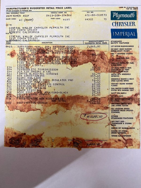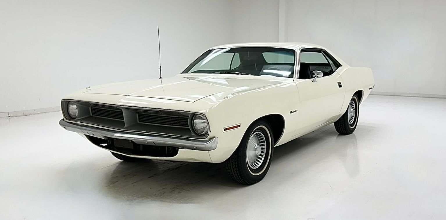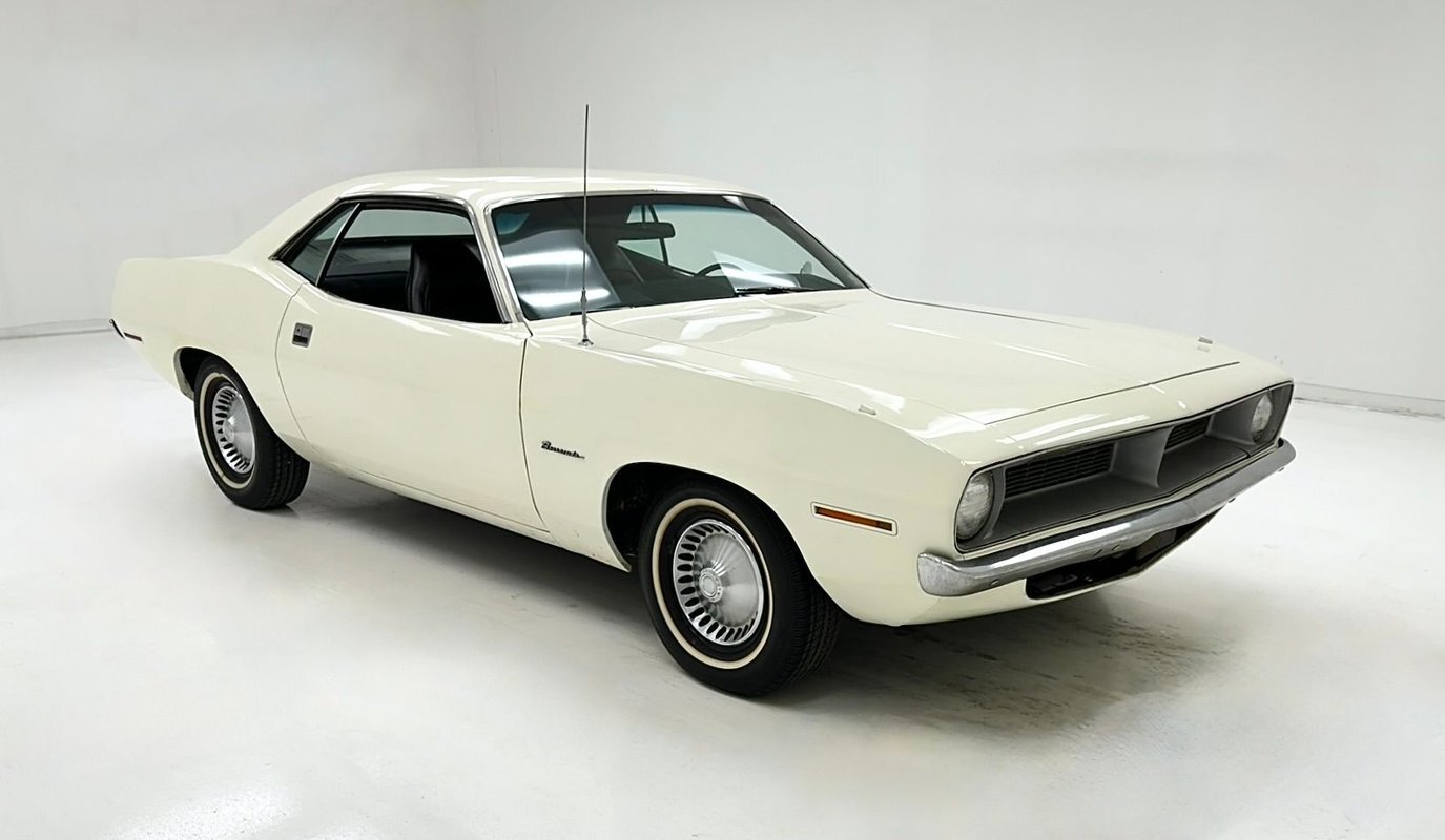 For consignment, a first year example of the fabled E-body Barracuda in 318ci grocery getter form. It is bathed in Alpine White, and is in full factory with no stripes, no wild paint, no extra badging, no wide tires or smoking them, just pure unadulterated Plymouth Barracuda as your everyday man would drive out of the showroom and give to his wife to use. A numbers matching 318ci V8, 2-bbl carb, and numbers matching A904 3-speed automatic transmission are under the hood. It sports a non vinyl top, and of course iconic good but toned down muscle car looks. OHHHHHHH Barra-Cuda! Just fun.