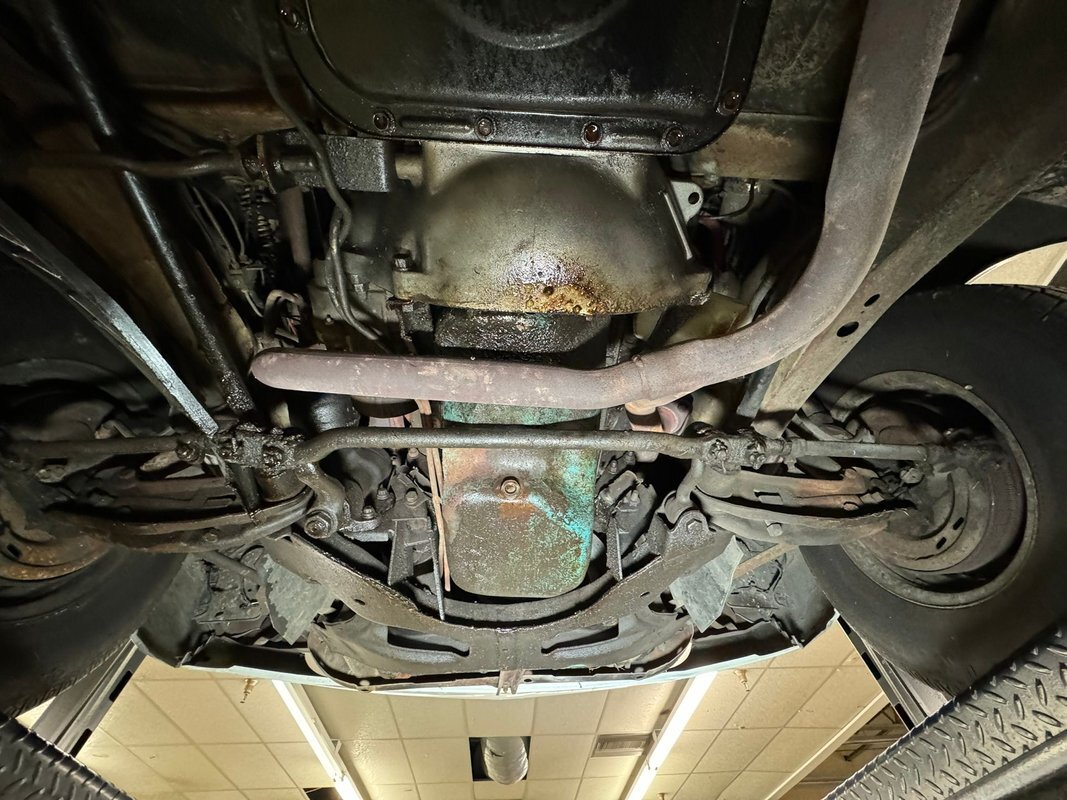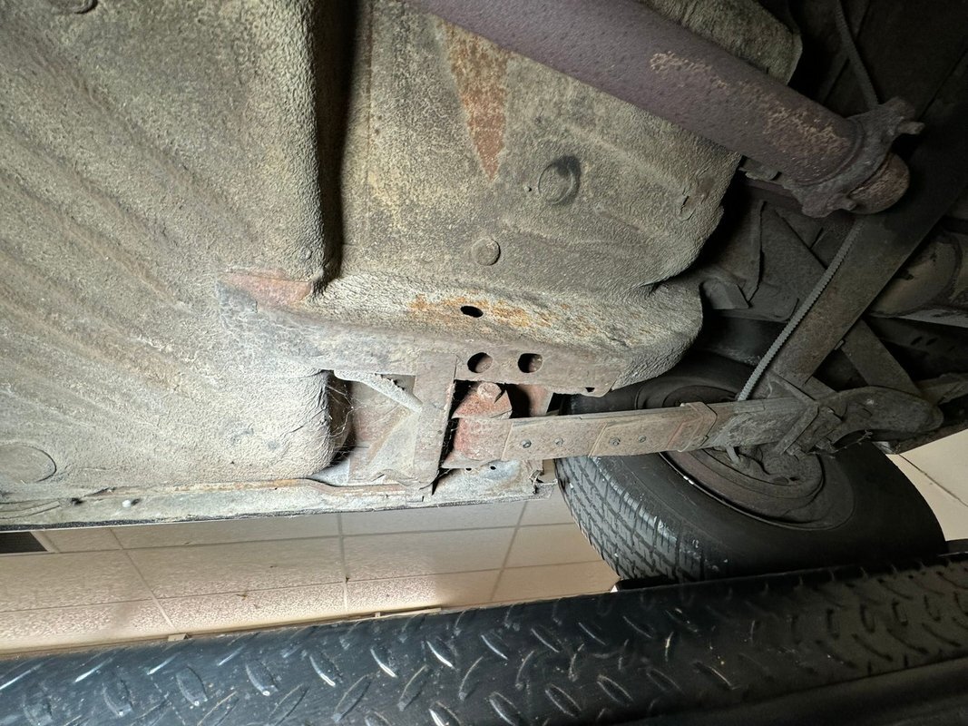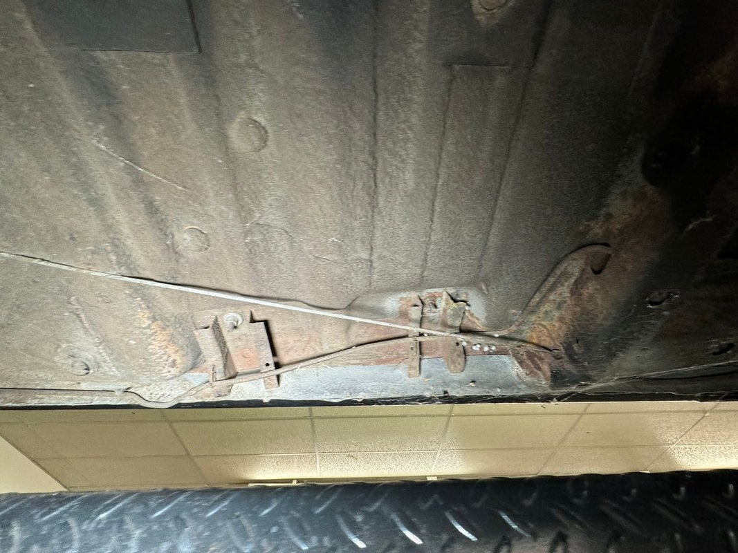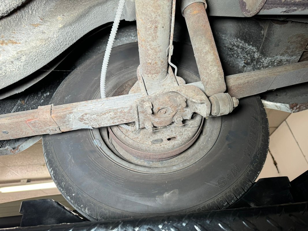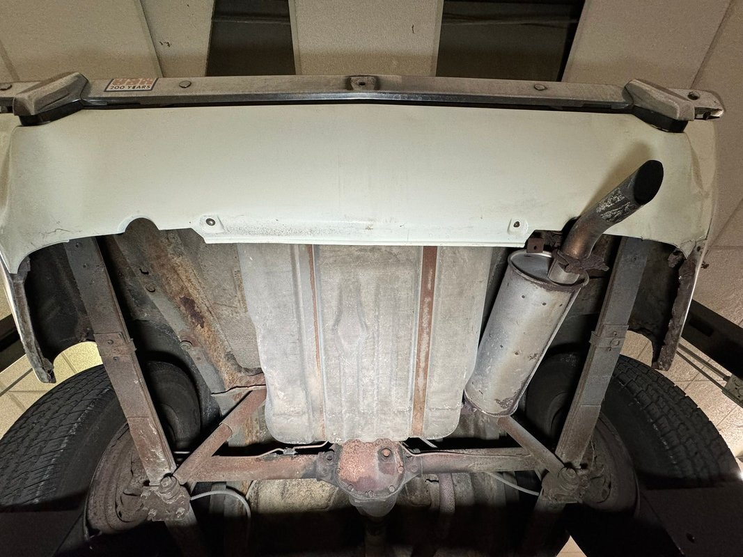 The underside is similar to the engine bay in that it has some road dirt, surface rust and still remains solid. Front independent torsion bars are in and on back leaf springs. Drum brakes are on all 4's.