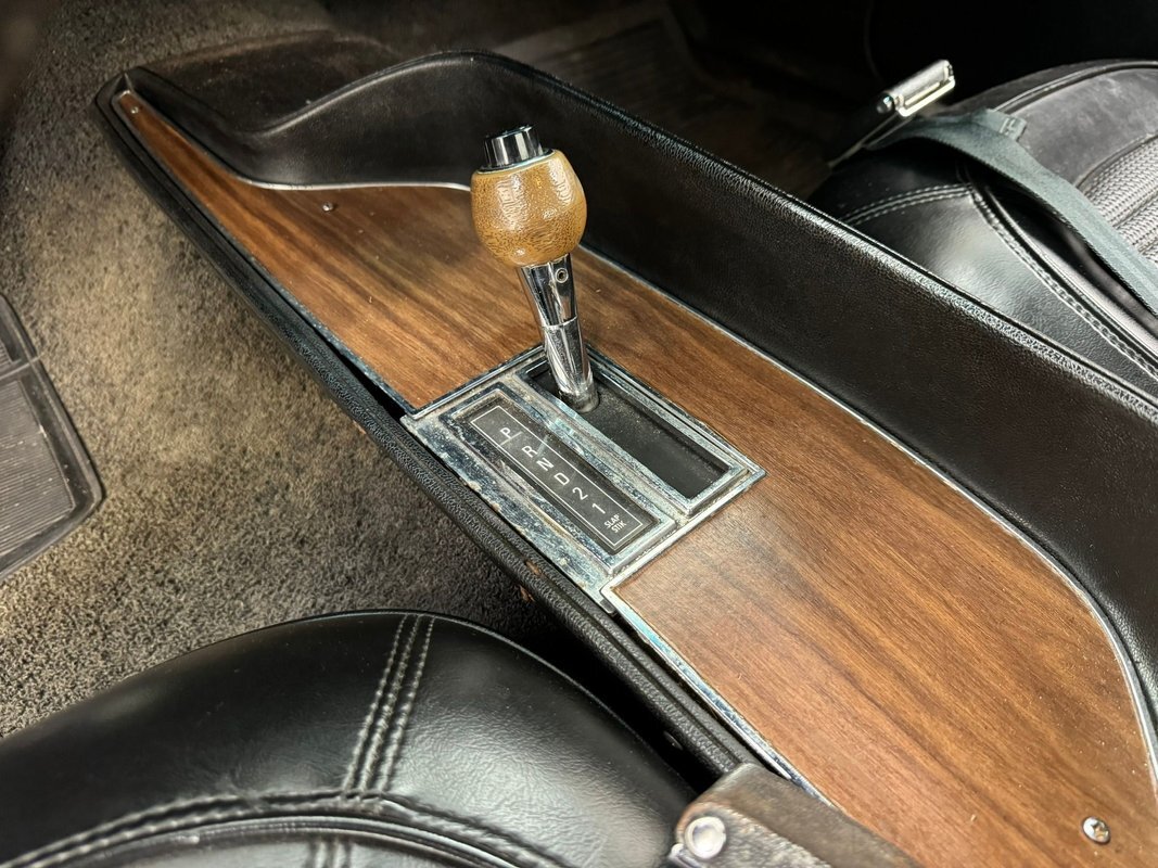 Keeping the door open to the "no stone left unturned department", we can swing open a door and see showroom quality door panels in black molded vinyl. These have a sleek seamless look. Also showroom quality are 2 thin early 1970's sleek black vinyl high back buckets with textured vinyl center panels and back with built in headrests, some tuck and roll pattern inserts and smooth bolsters. The rear bench carries this motif in back, and these are nearly perfect as well. This all sits in a beautiful calm sea of slightly faded and worn black carpet. Floating above the carpet up front is a well done presentation of the dash featuring a clean as a whistle round lineup of gauges all within a simple black field and a black padded dash top. Seen racing up the center between the buckets is a 70's stylized console in black vinyl, and wood applique, and sporting a correct tan ball topped automatic shifter knob. The chrome surround is soiled and some chrome is peeling off. A faux wood rimmed leather covered 3 spoke wheel with a "Michelin Man' styled column attachment fronts this very 70's simple pedestrian dash. Above all this 70's menagerie is a tight black vinyl headliner. All simple factory in here kids.